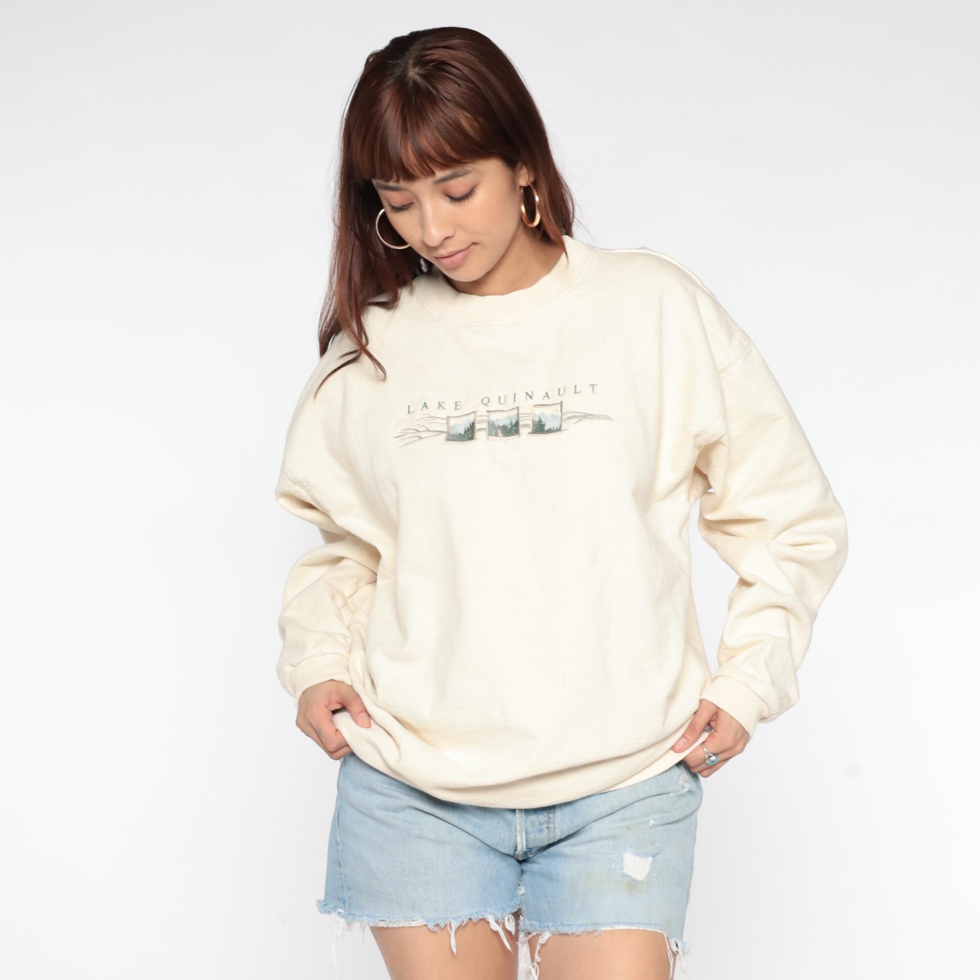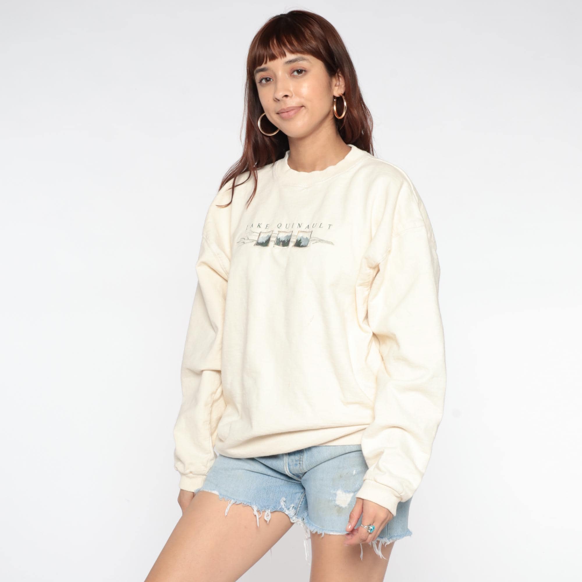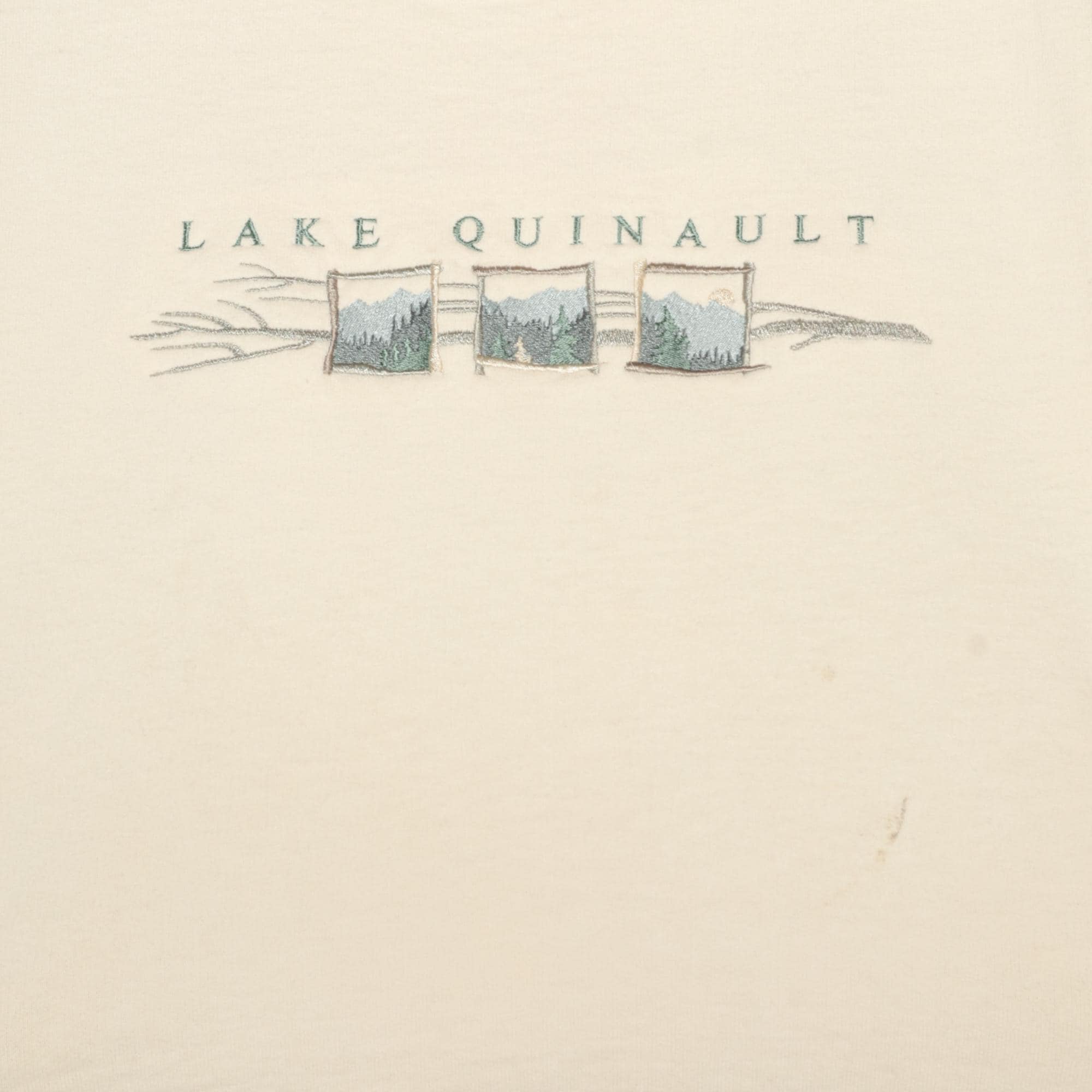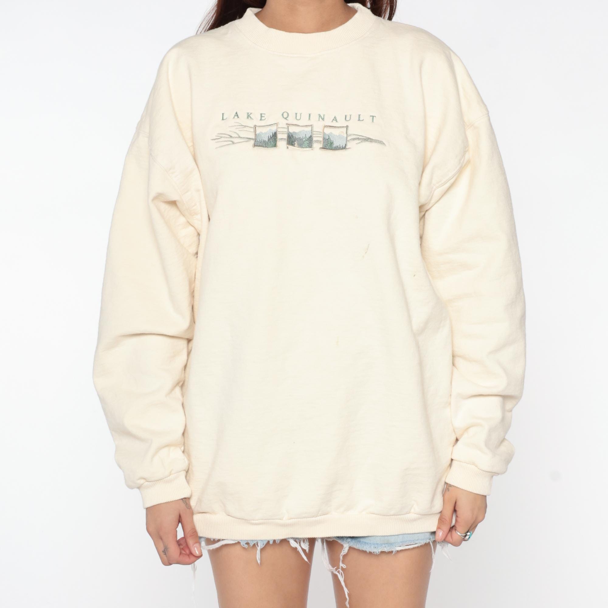 Cream 90s crewneck sweatshirt from Suttons Sportswear with Lake Quinault graphic across the chest. Three framed landscape scenes showing trees and mountains in muted sage green, dusty blue, and tan tones. Ribbed crew neckline, long sleeves with ribbed cuffs, and ribbed hem.