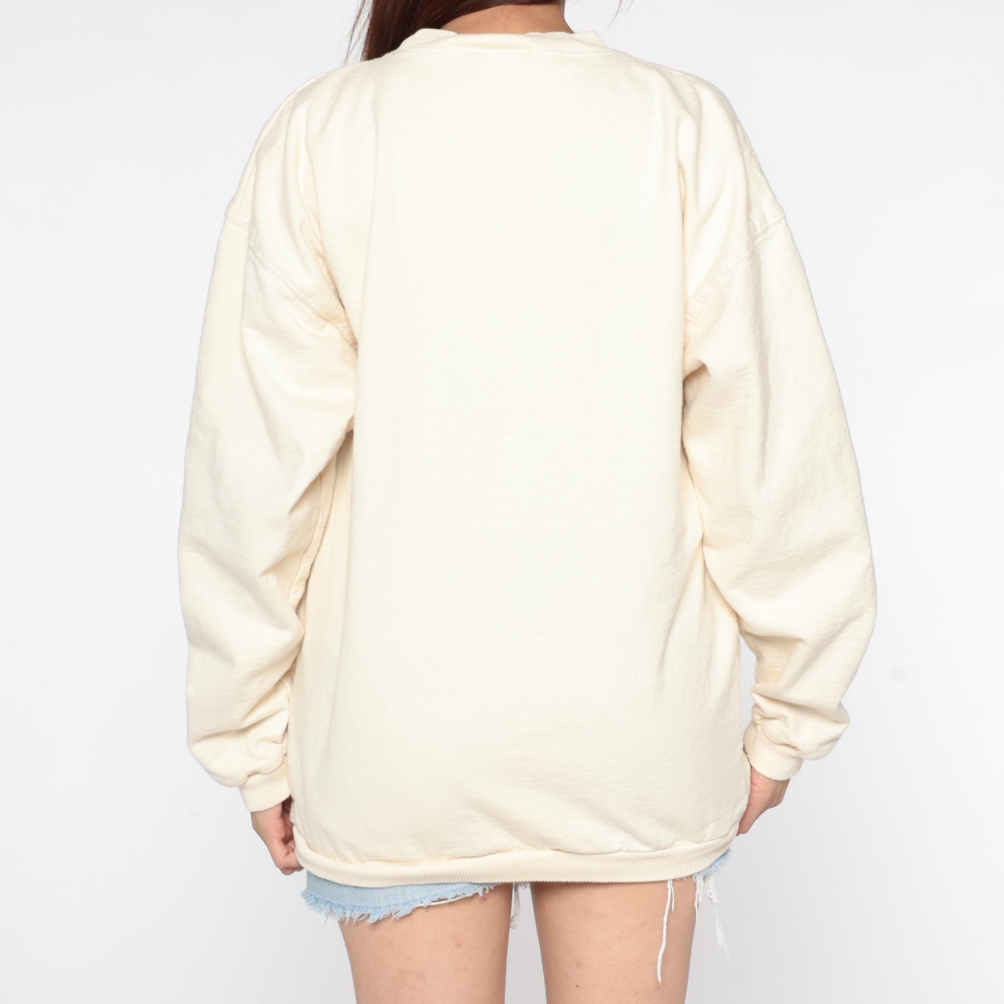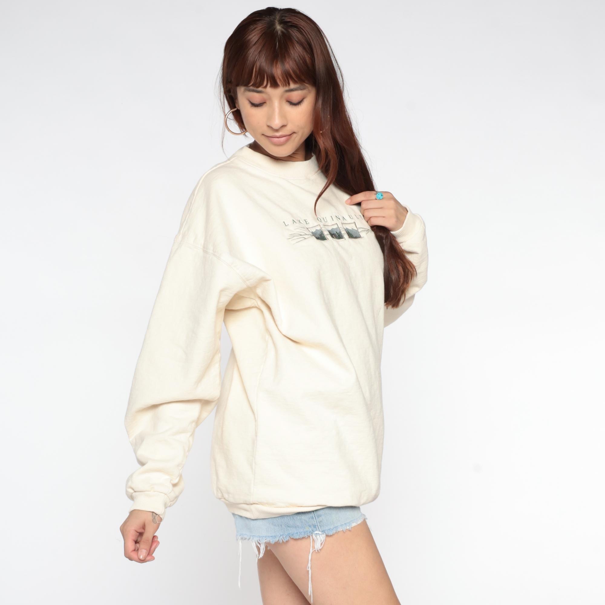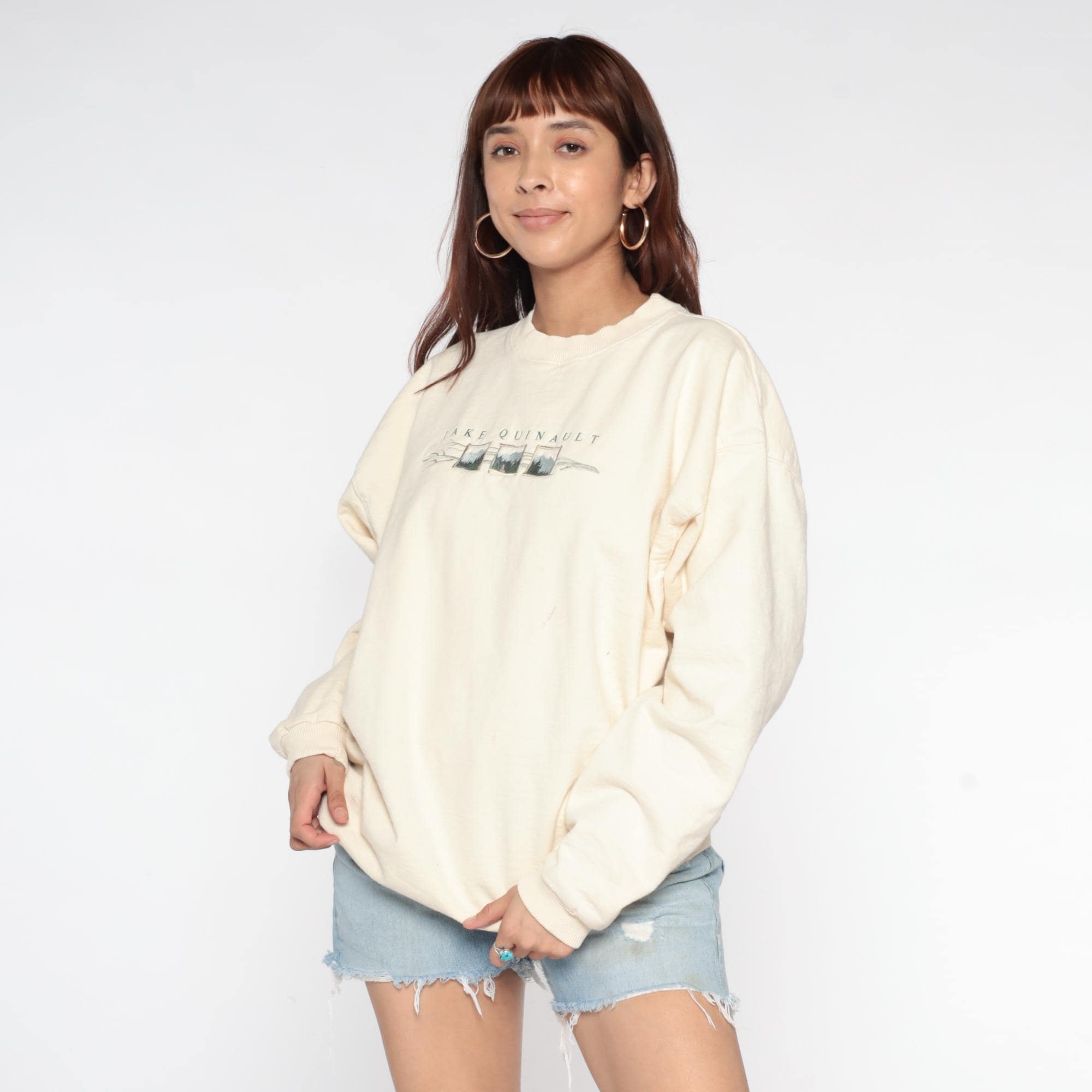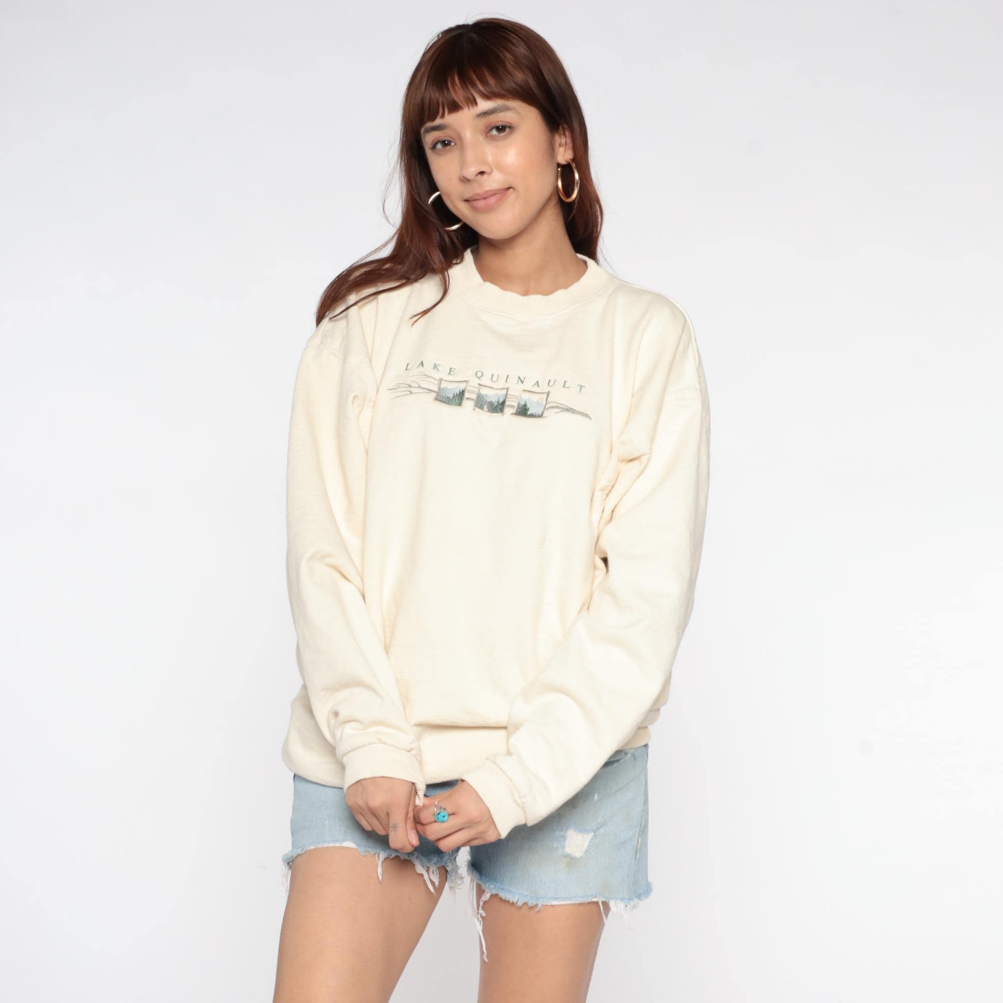 Cream 90s crewneck sweatshirt from Suttons Sportswear with Lake Quinault graphic across the chest. Three framed landscape scenes showing trees and mountains in muted sage green, dusty blue, and tan tones. Ribbed crew neckline, long sleeves with ribbed cuffs, and ribbed hem.