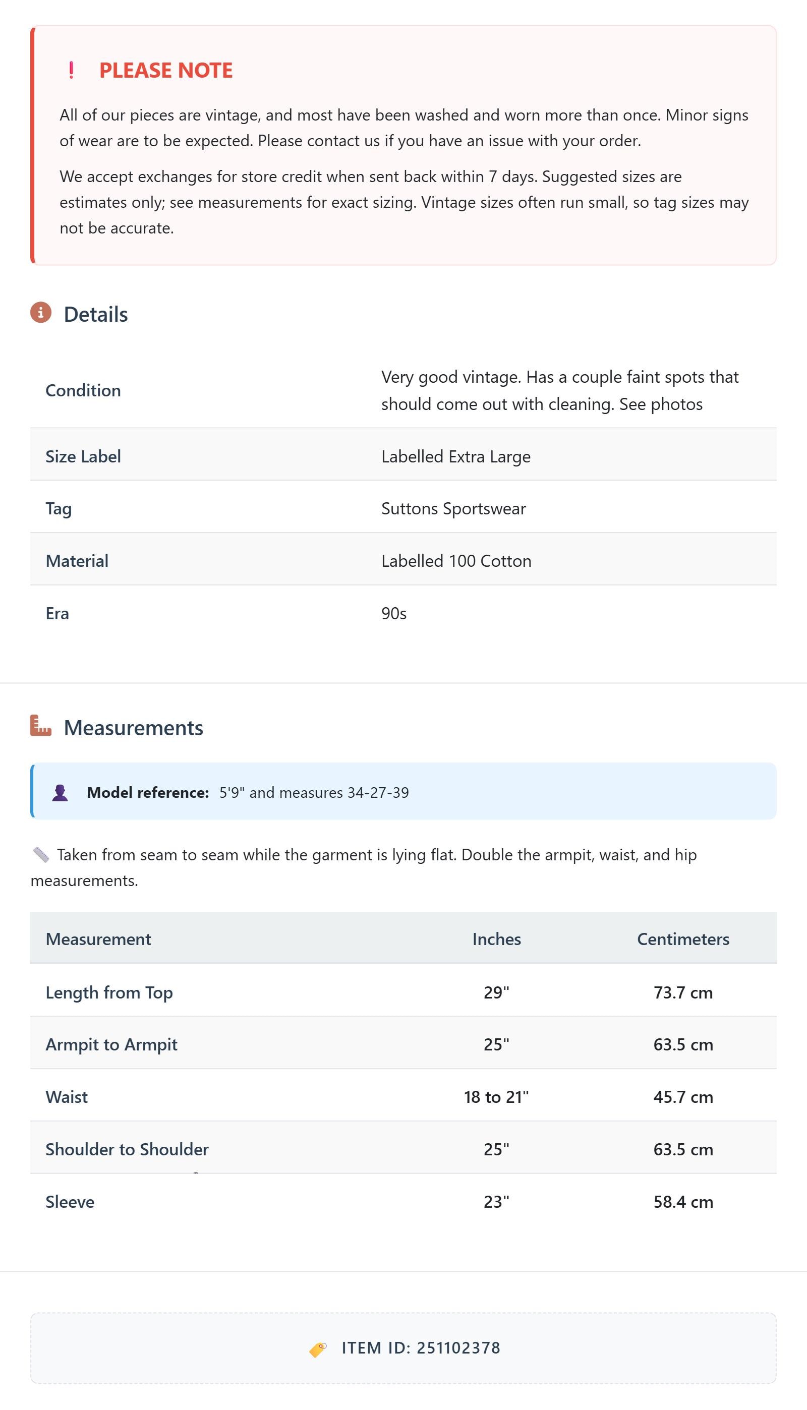All of our pieces are vintage, and most have been washed and worn more than once. Minor signs of wear are to be expected. Please contact us if you have an issue with your order. We accept exchanges for store credit when sent back within 7 days.