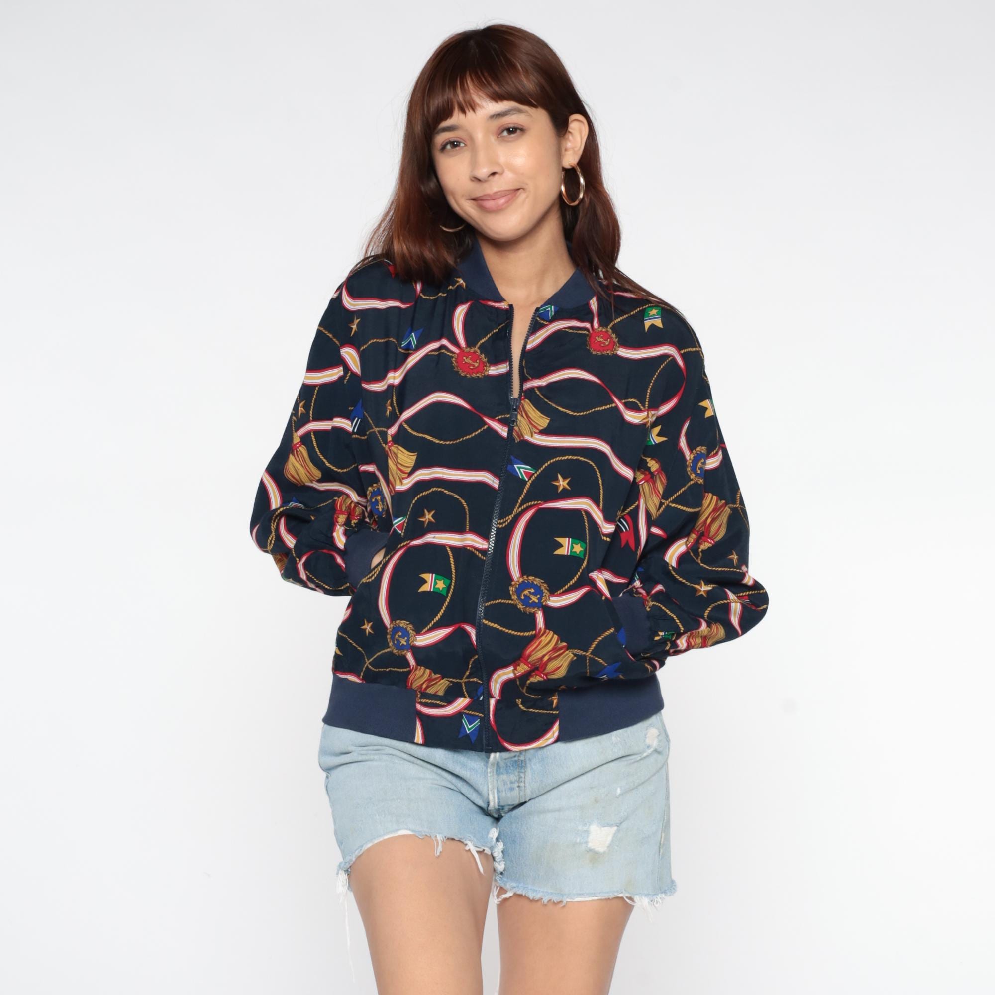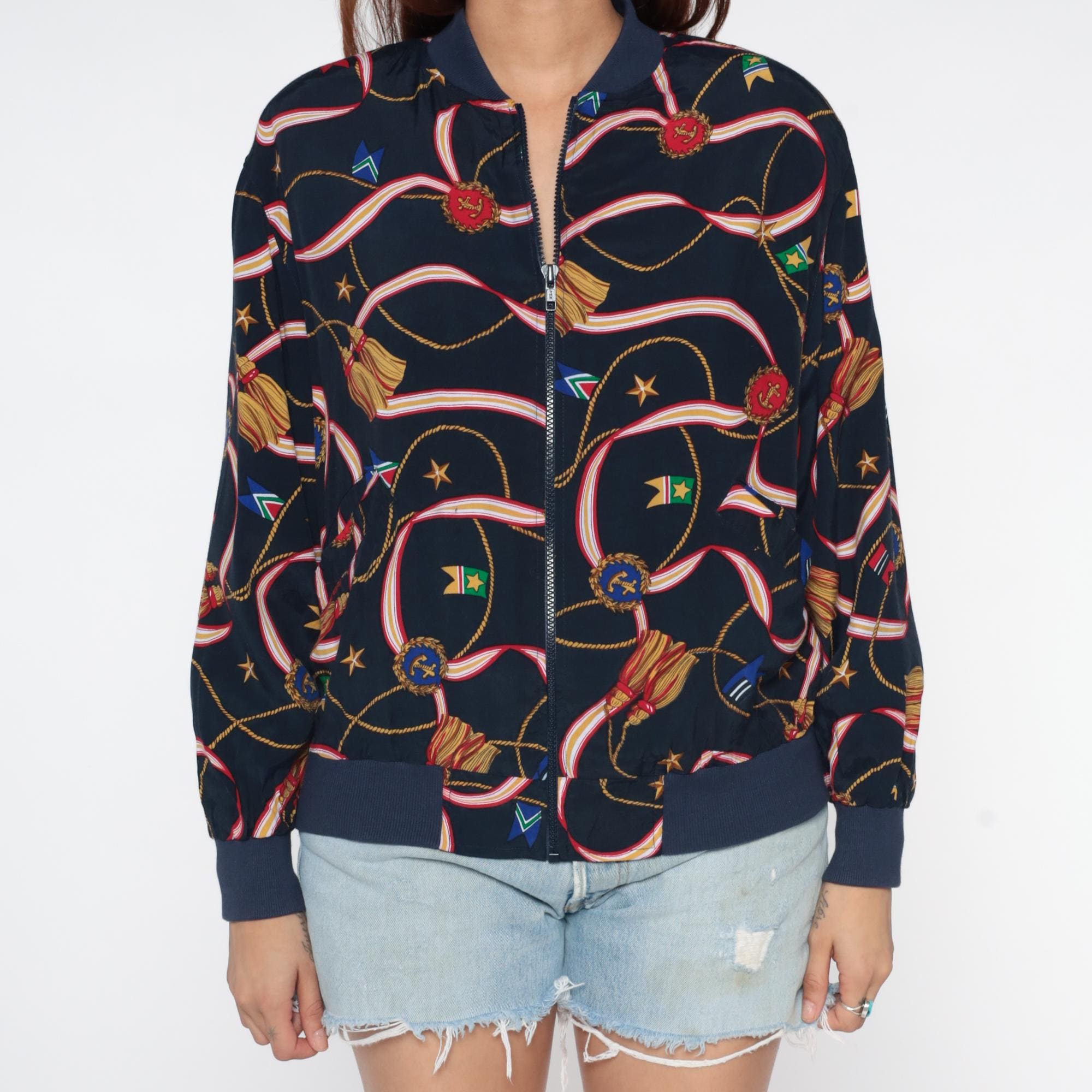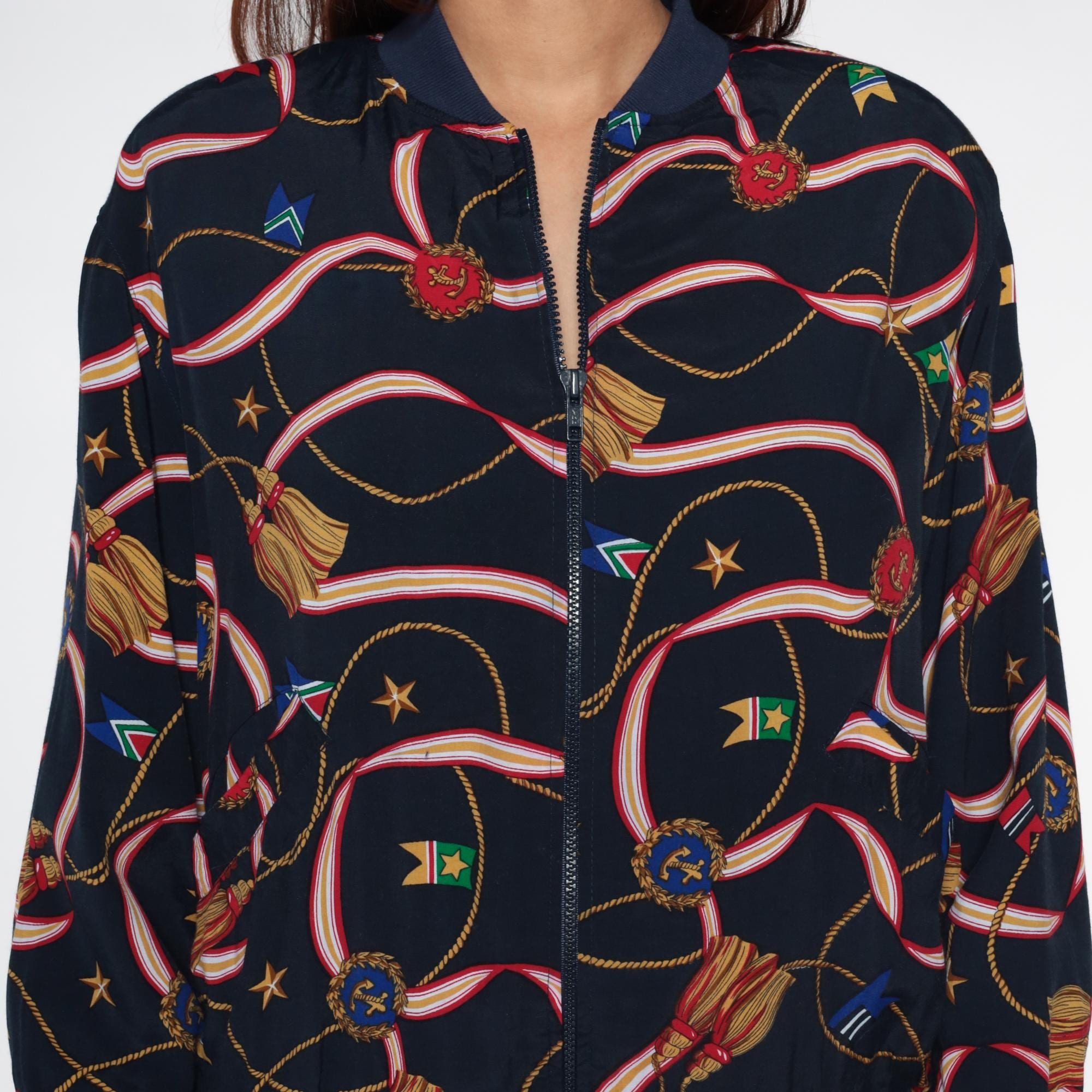 Navy bomber jacket from Alfred Dunner Petite with playful nautical print of ribbons, tassels, flags, and stars in red, pink, yellow, blue, and gold across the fabric. Ribbed collar, cuffs, and hem with front zipper closure and side pockets.