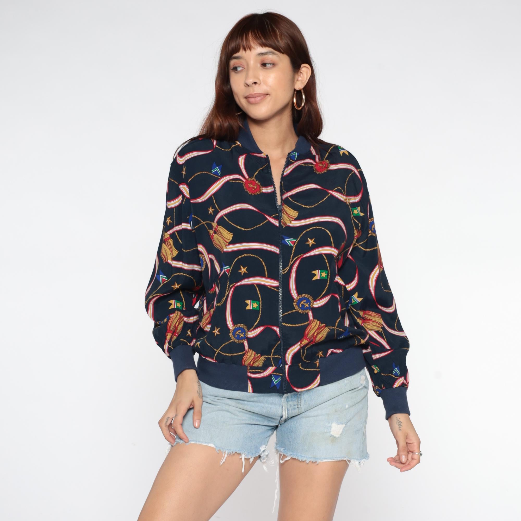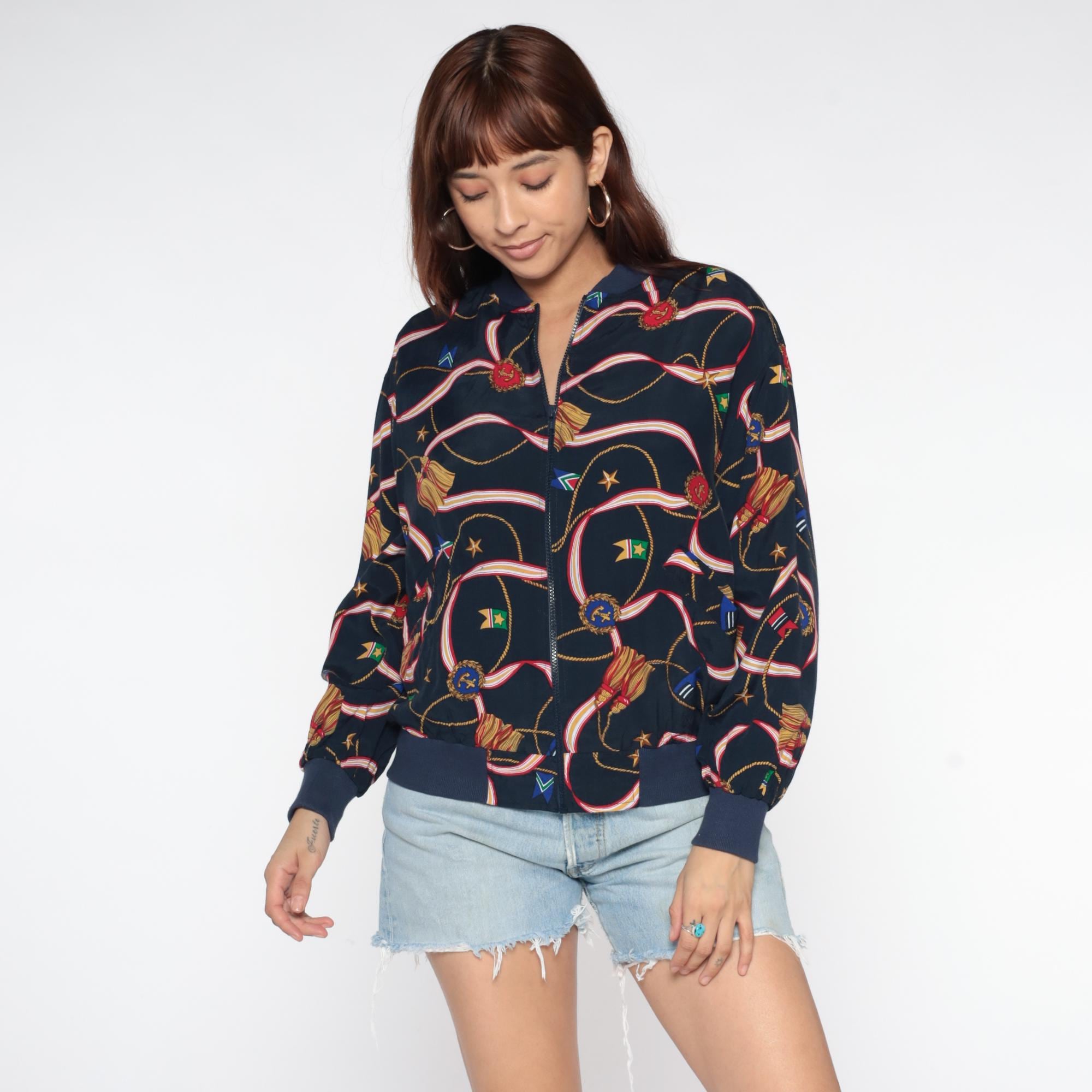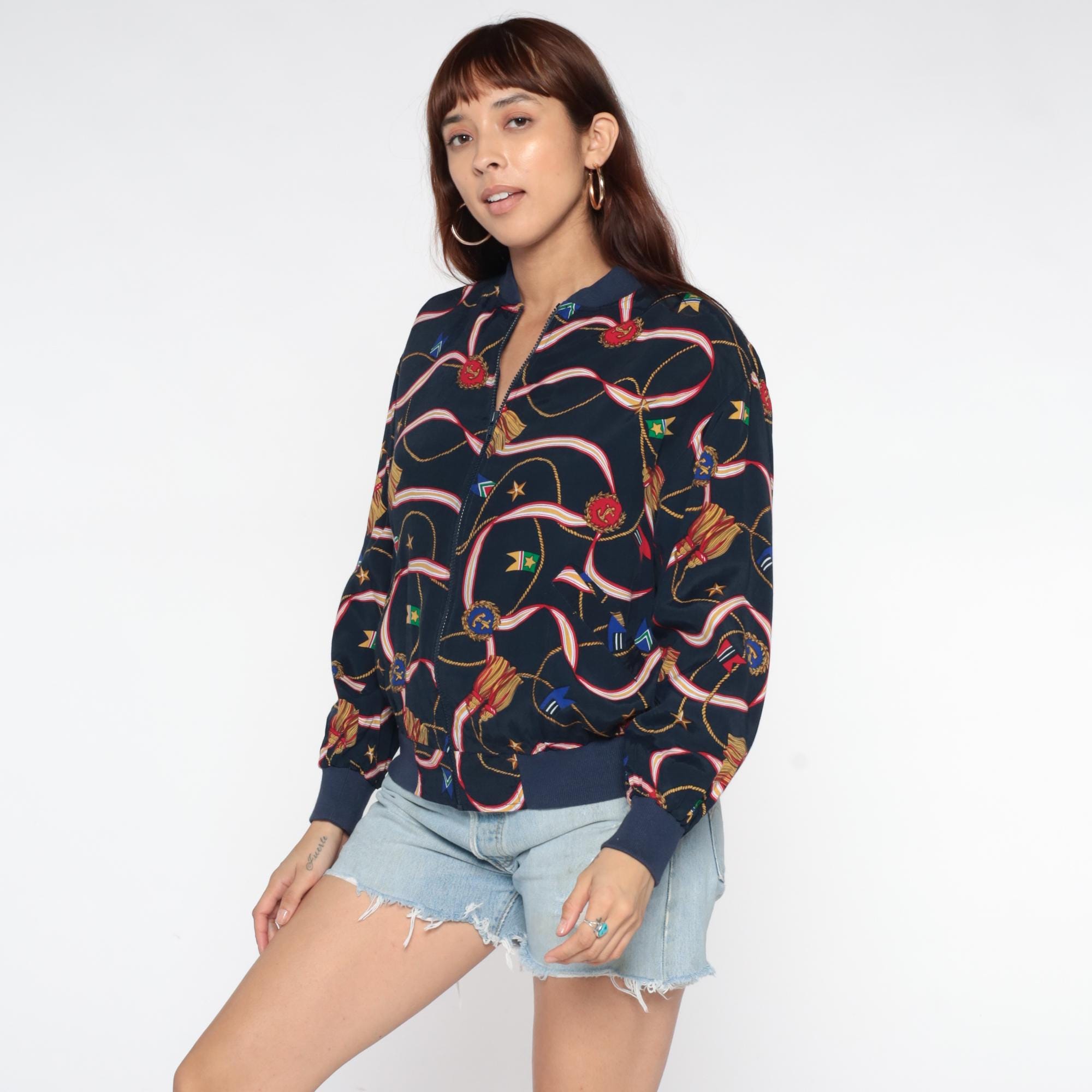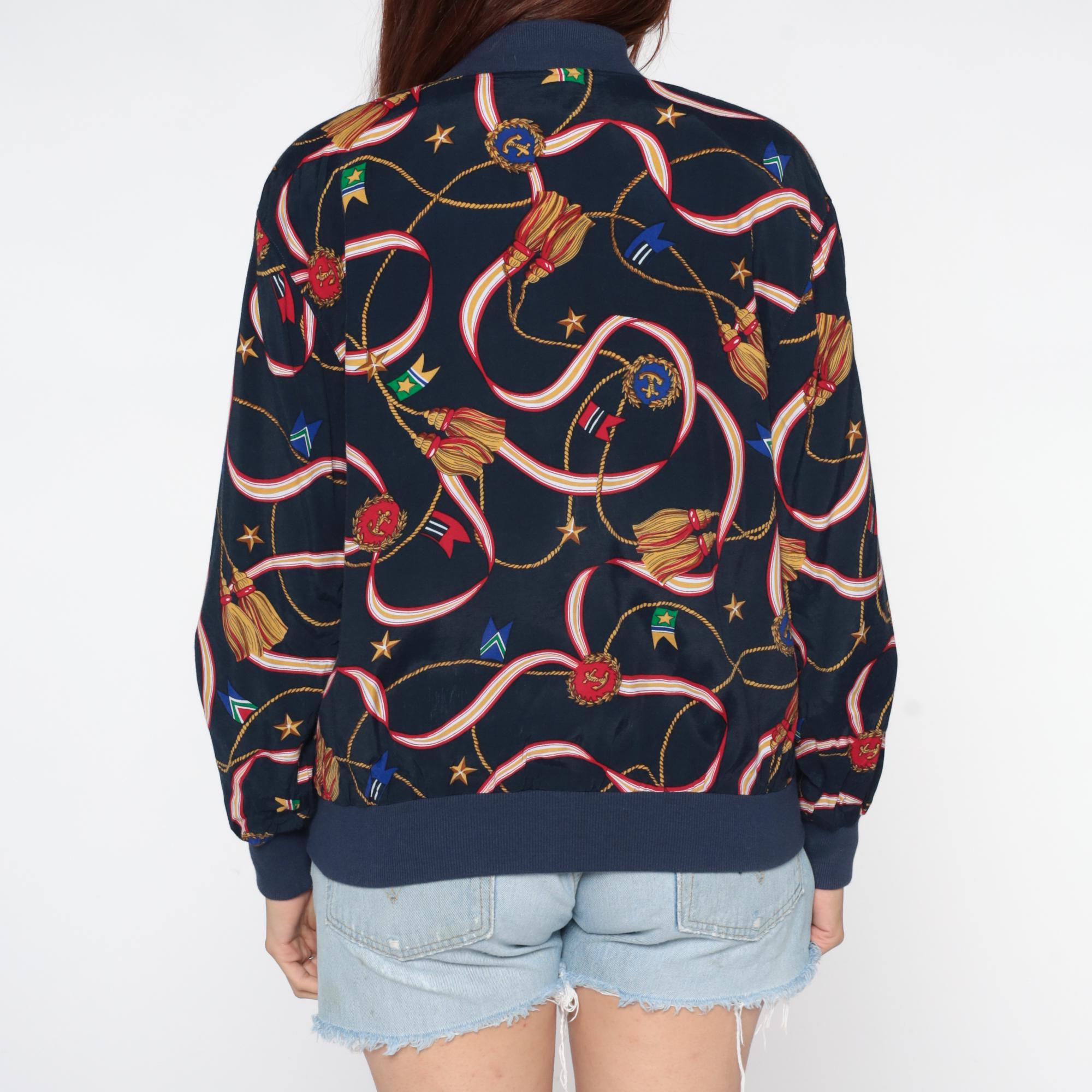 Navy bomber jacket from Alfred Dunner Petite with playful nautical print of ribbons, tassels, flags, and stars in red, pink, yellow, blue, and gold across the fabric. Ribbed collar, cuffs, and hem with front zipper closure and side pockets.