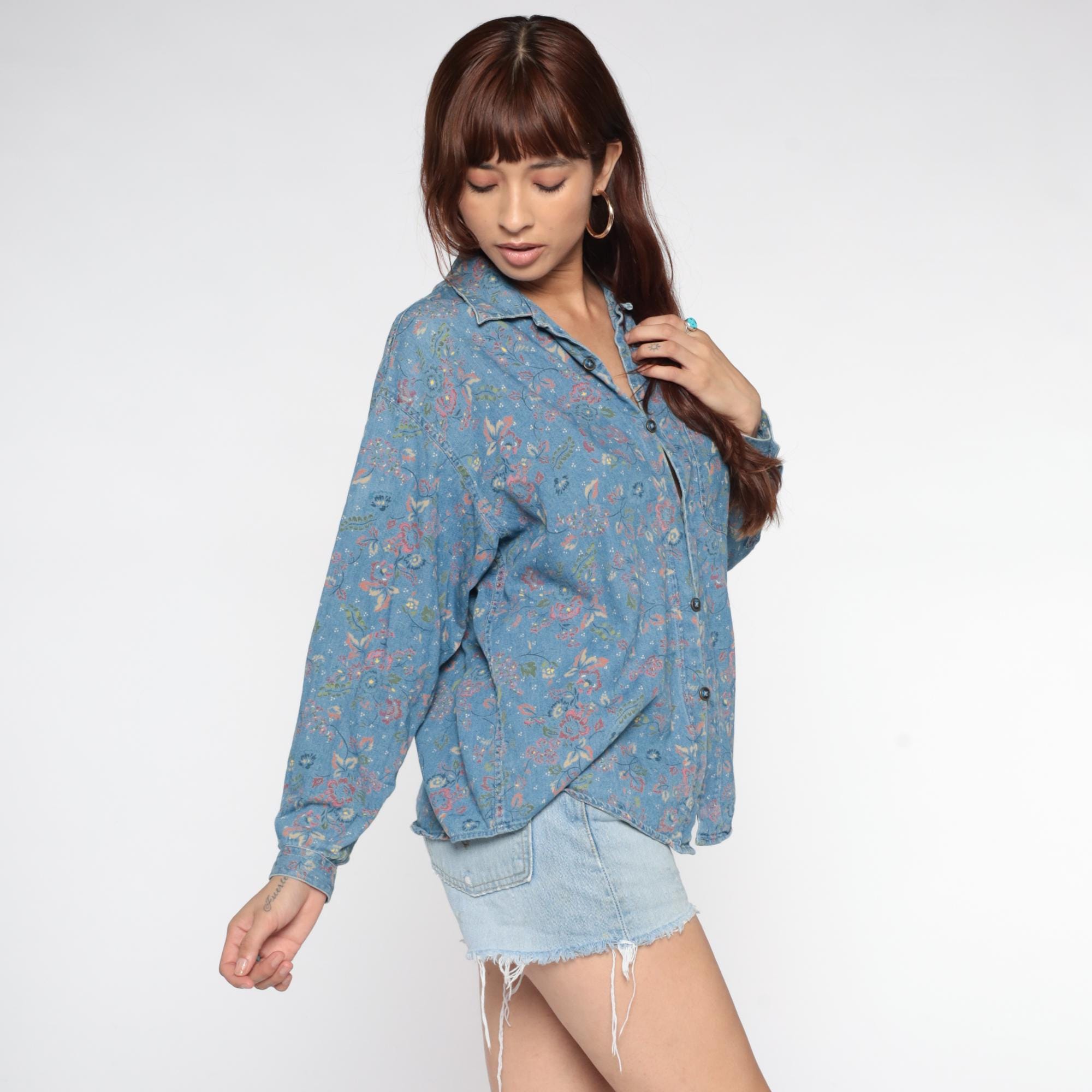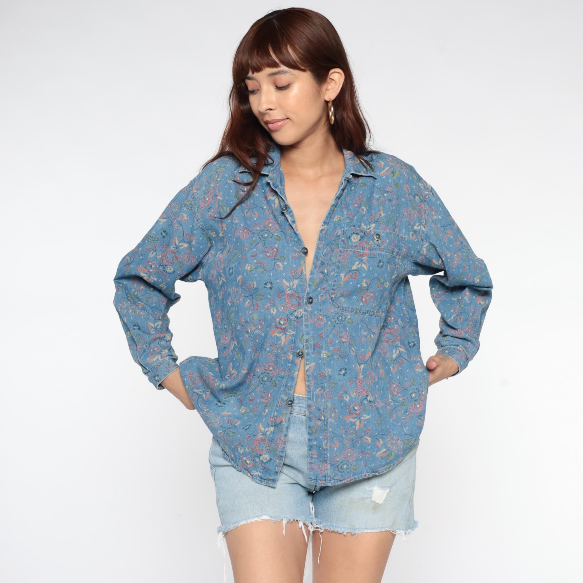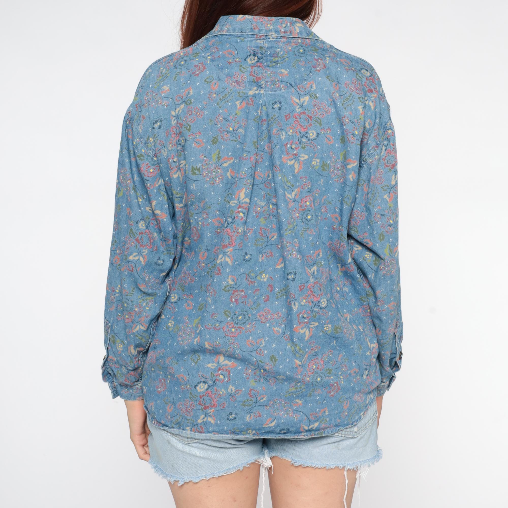 90s blue floral shirt from LizWear in soft cotton with all-over botanical print in pink, coral, yellow, and green tones. Button front closure with chest pocket and long sleeves with button cuffs. Collared neckline with relaxed fit.