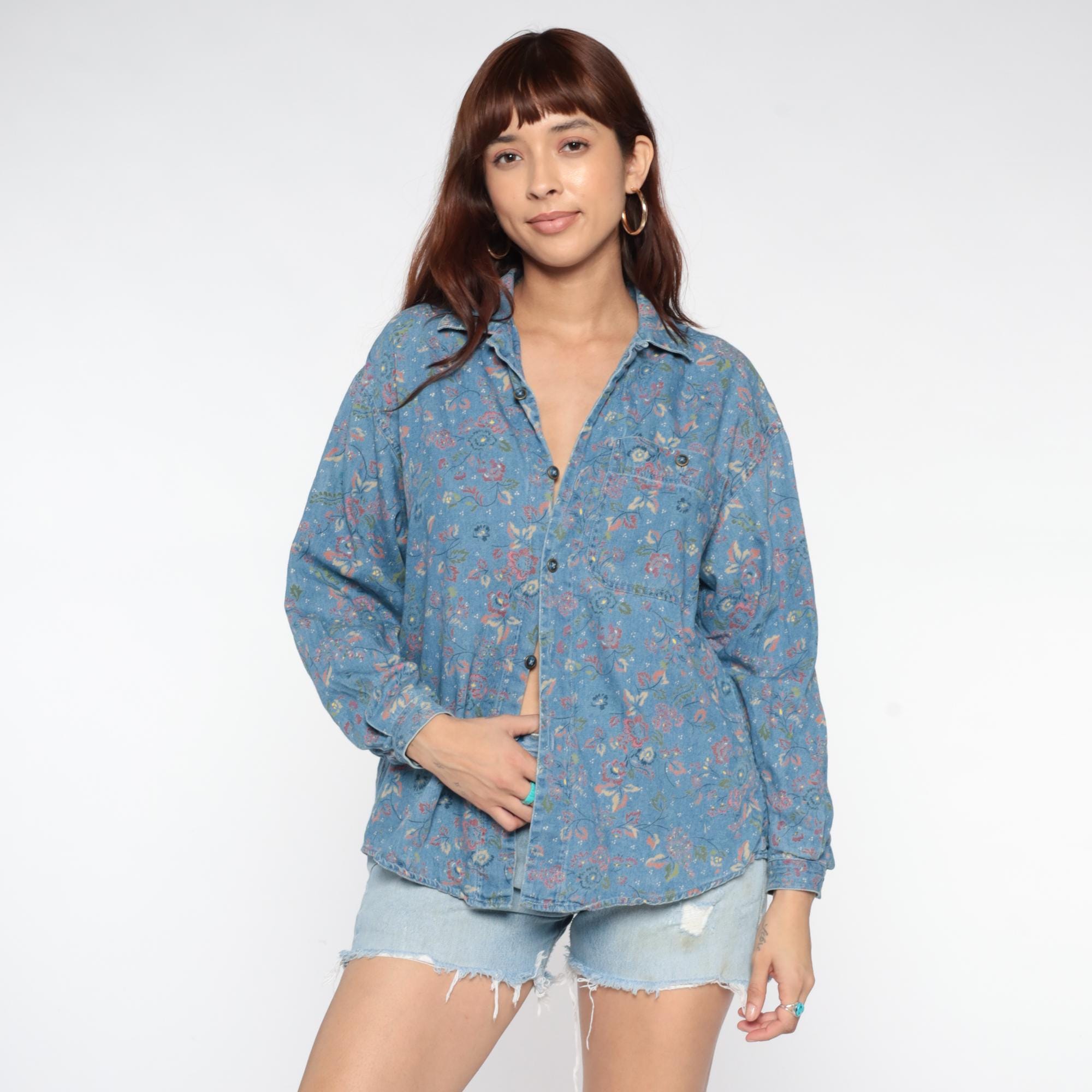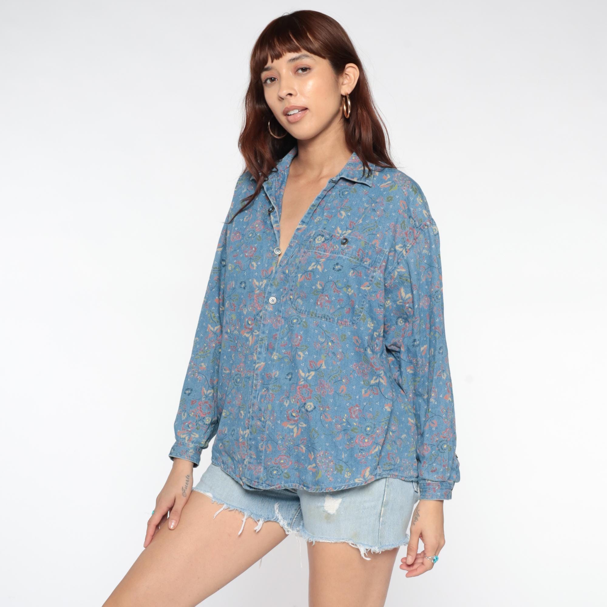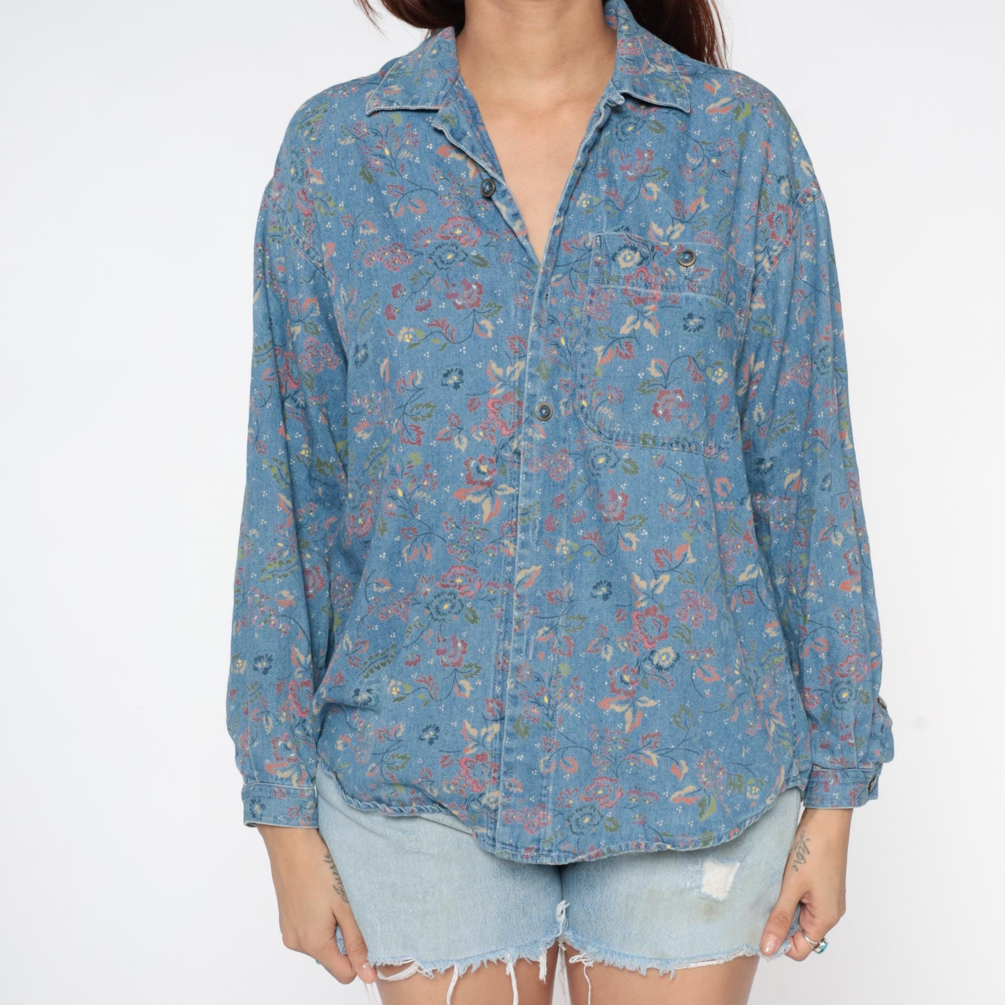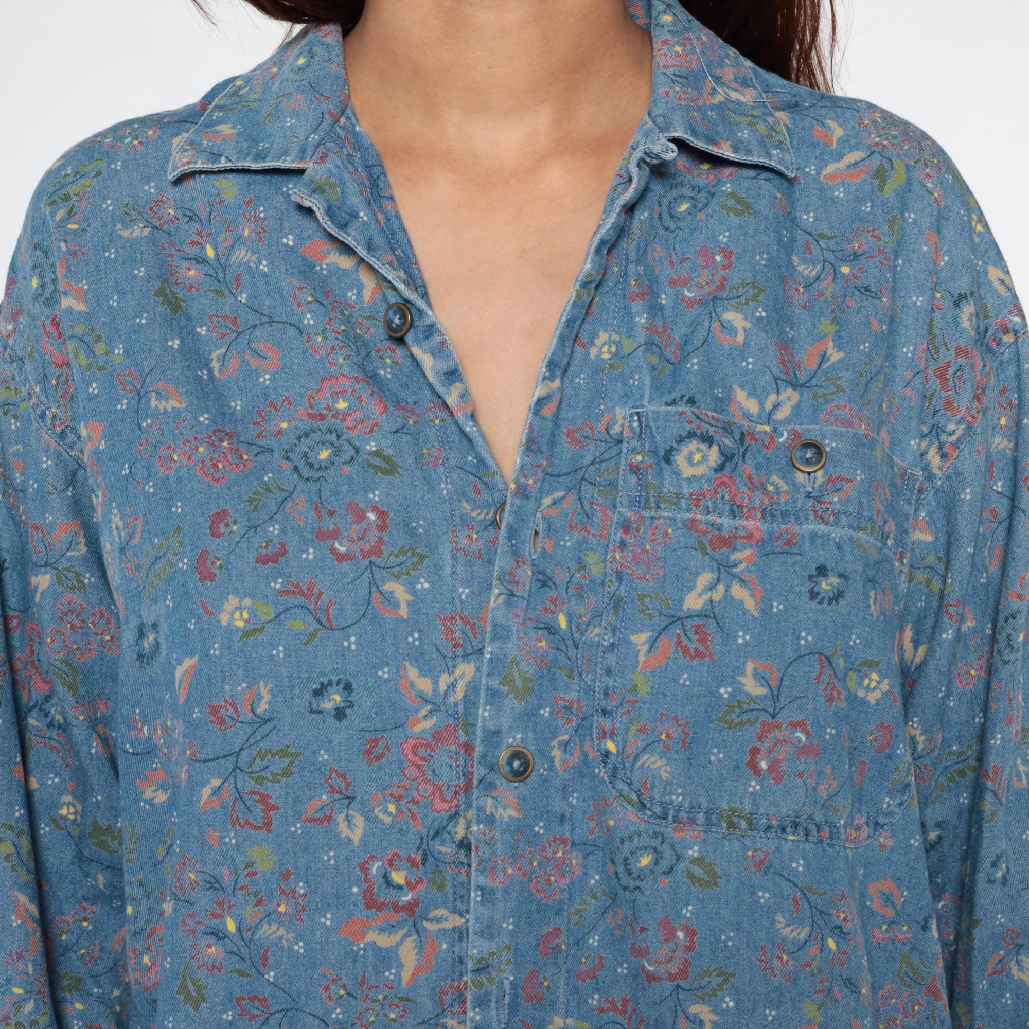 90s blue floral shirt from LizWear in soft cotton with all-over botanical print in pink, coral, yellow, and green tones. Button front closure with chest pocket and long sleeves with button cuffs. Collared neckline with relaxed fit.