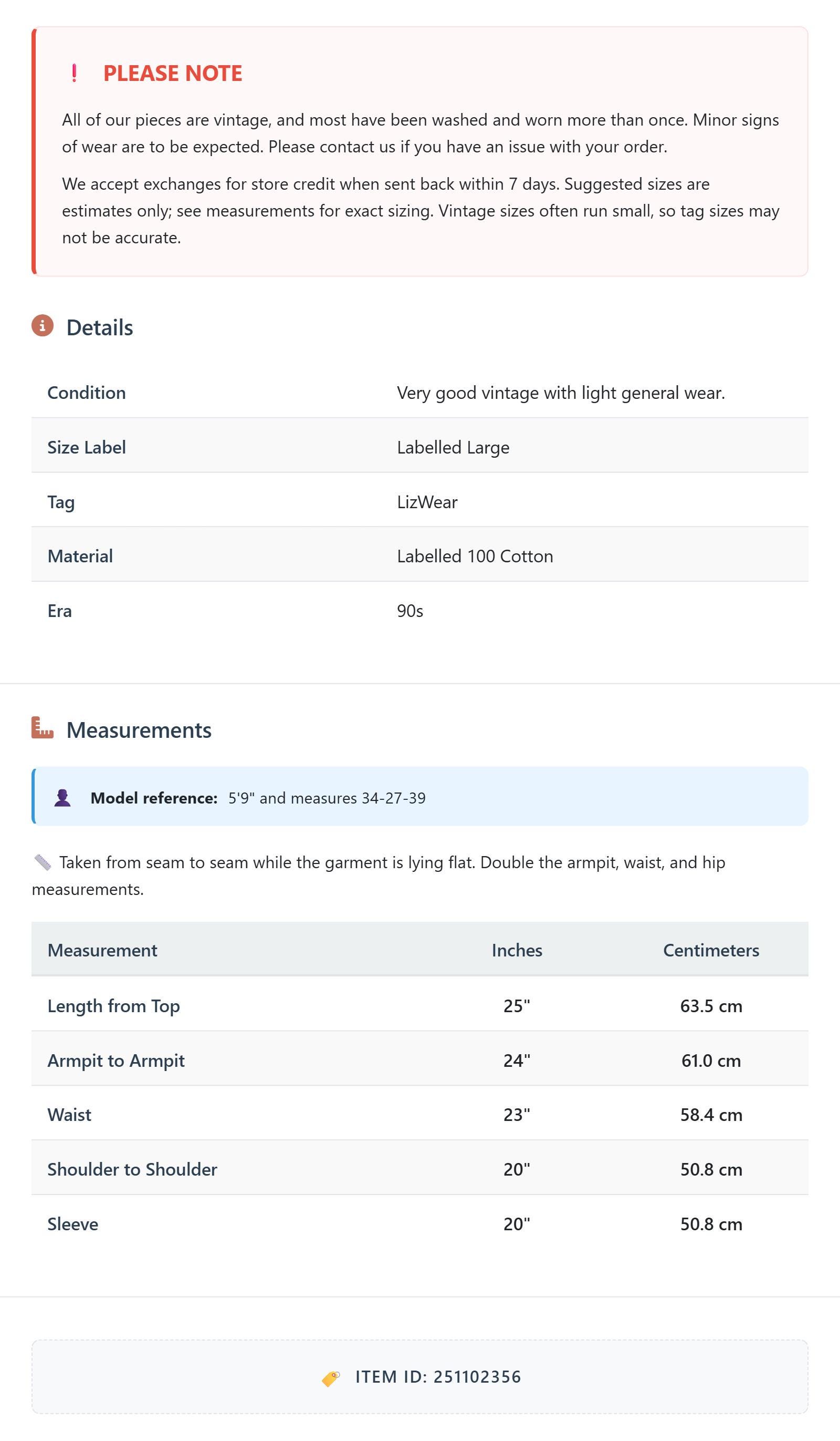 Suggested sizes are estimates only; see measurements for exact sizing. Vintage sizes often run small, so tag sizes may not be accurate.