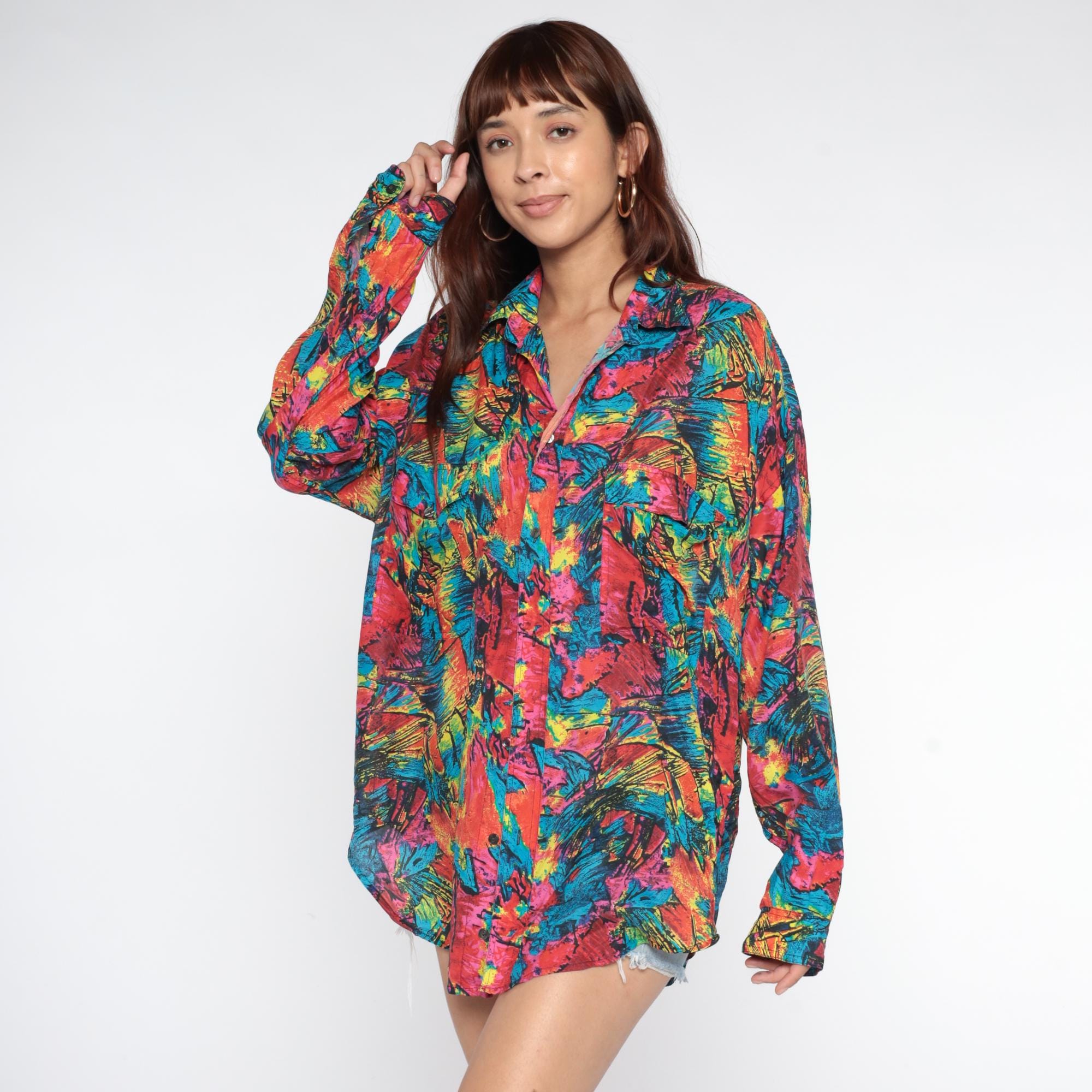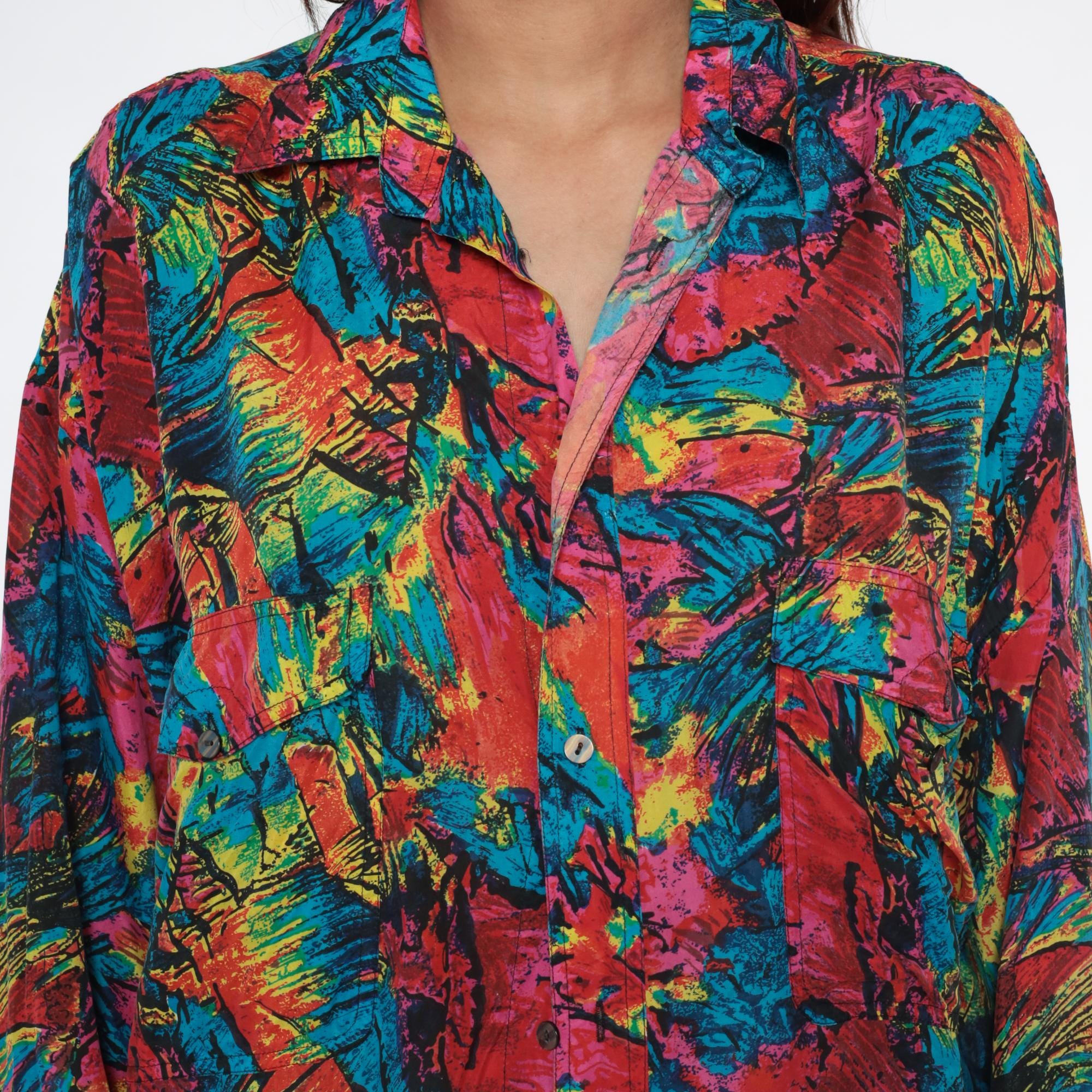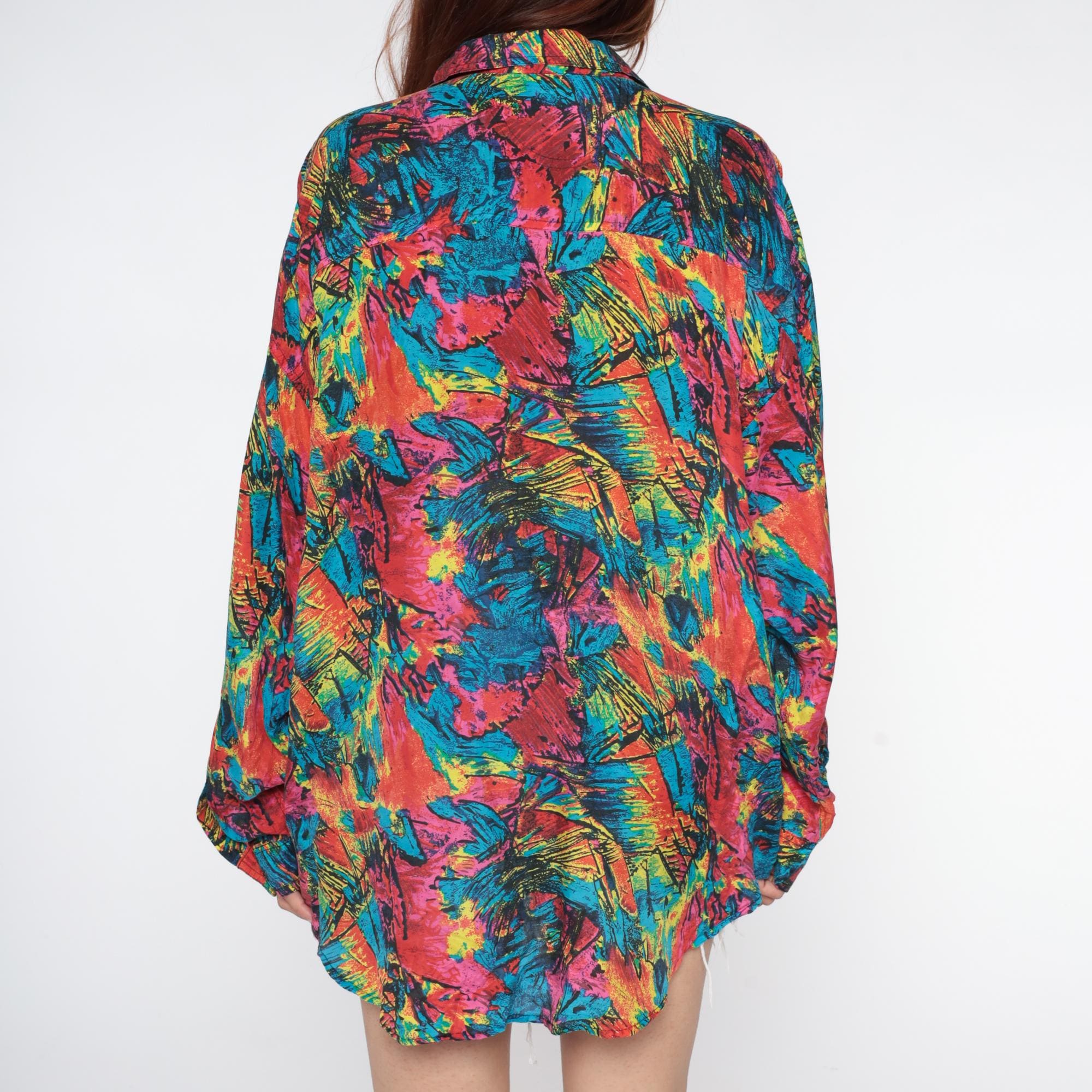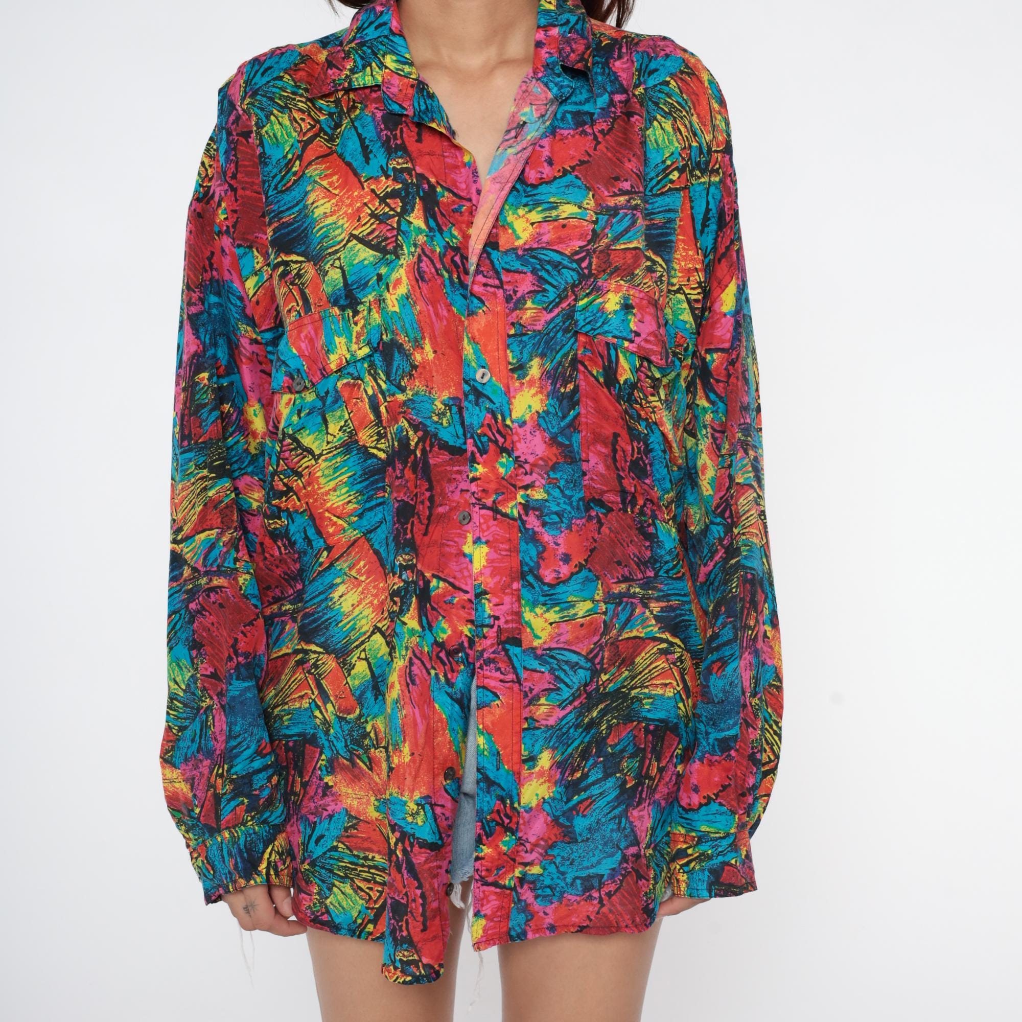 Vintage multicolor abstract print shirt from Substudio with vibrant brushstroke pattern in electric blue, hot pink, red, yellow, and orange across the fabric. Y2K oversized silhouette with collared neckline and button front closure. Long sleeves with button cuffs.