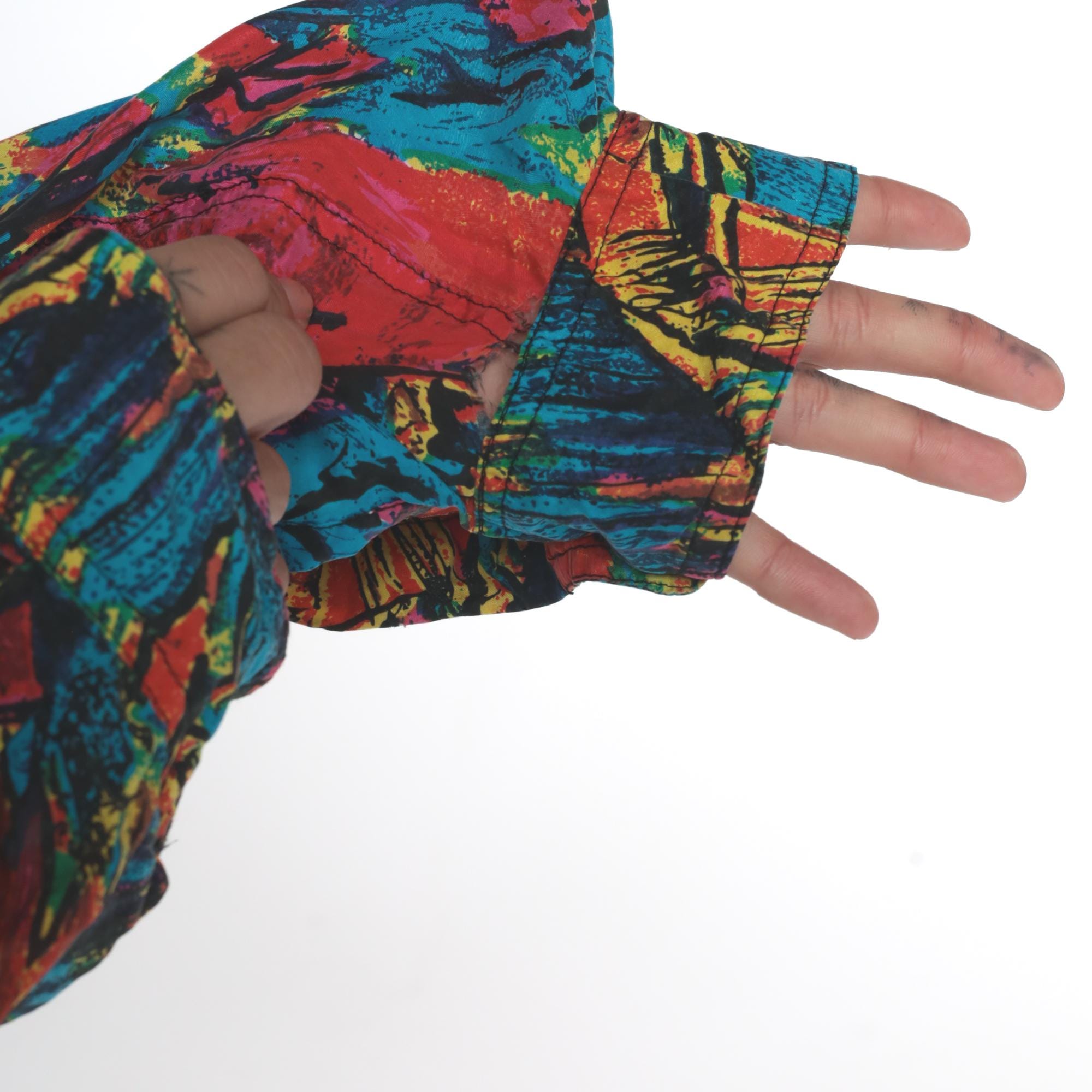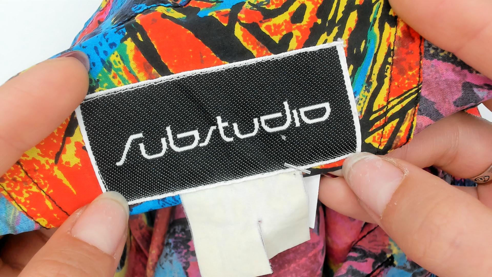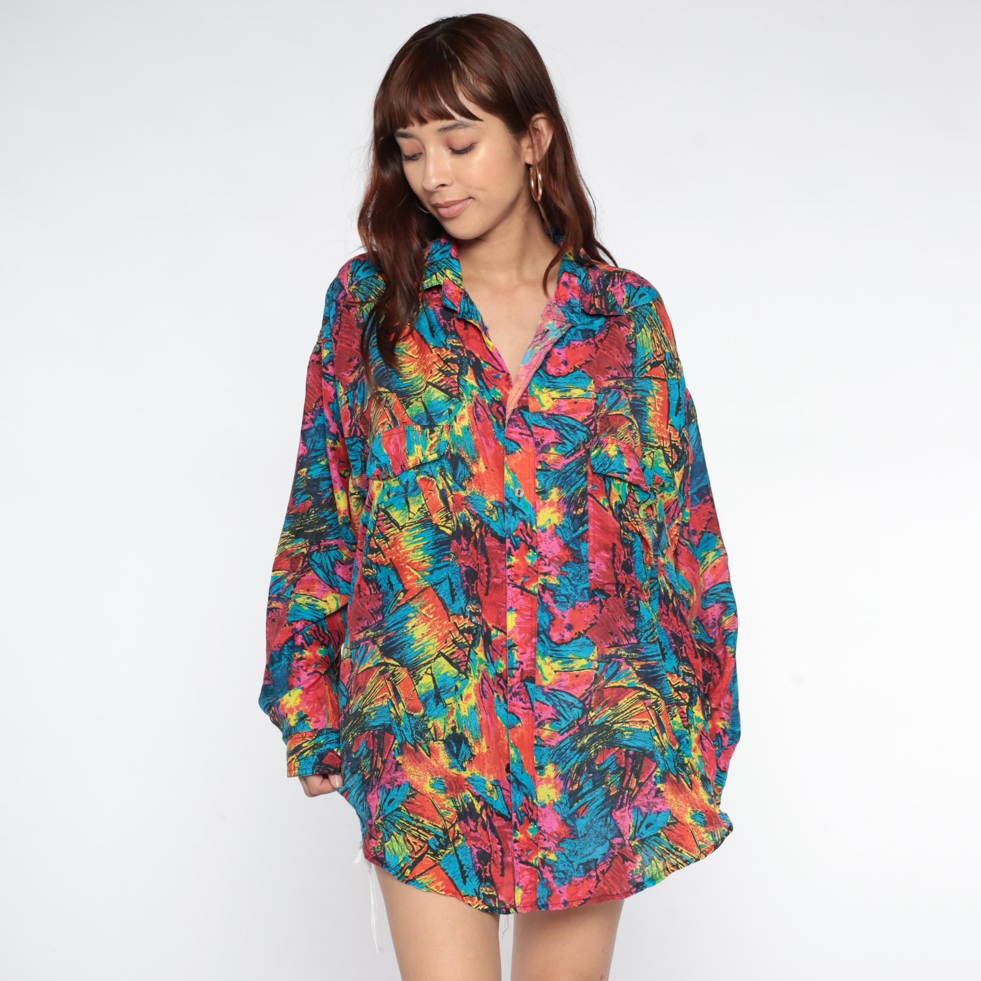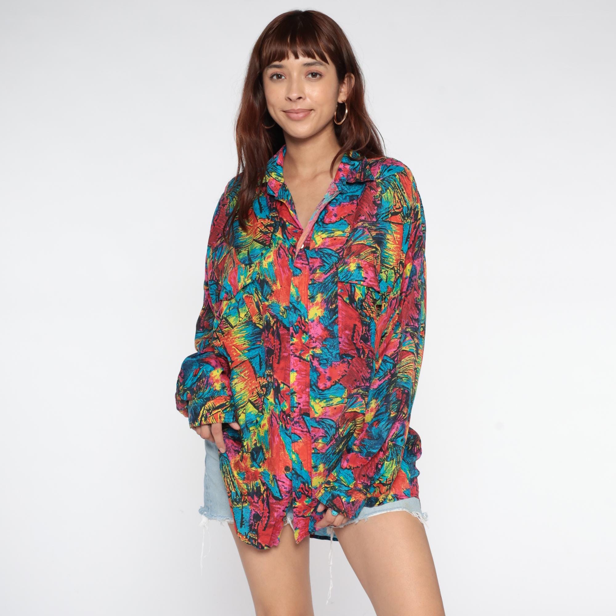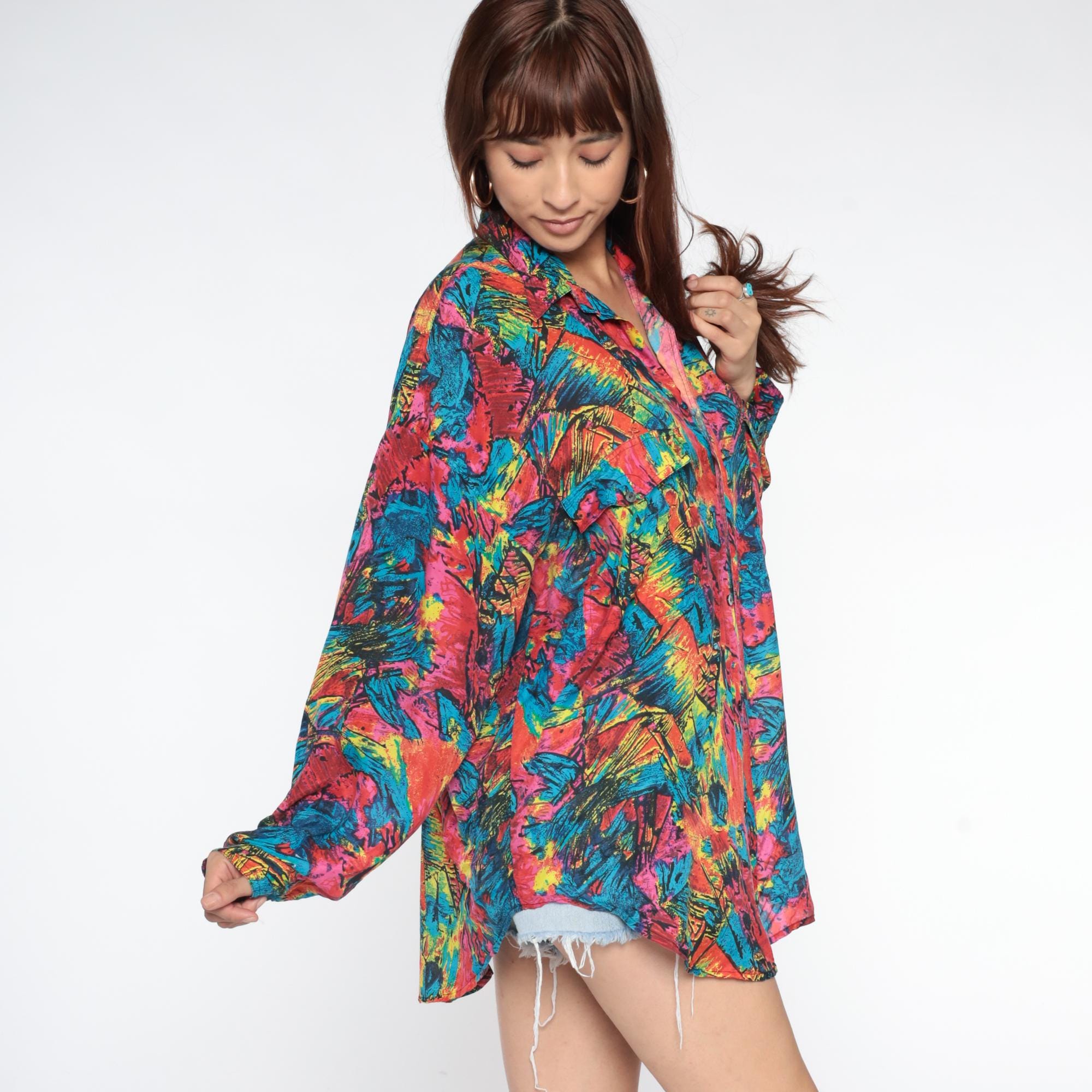 Vintage multicolor abstract print shirt from Substudio with vibrant brushstroke pattern in electric blue, hot pink, red, yellow, and orange across the fabric. Y2K oversized silhouette with collared neckline and button front closure. Long sleeves with button cuffs.