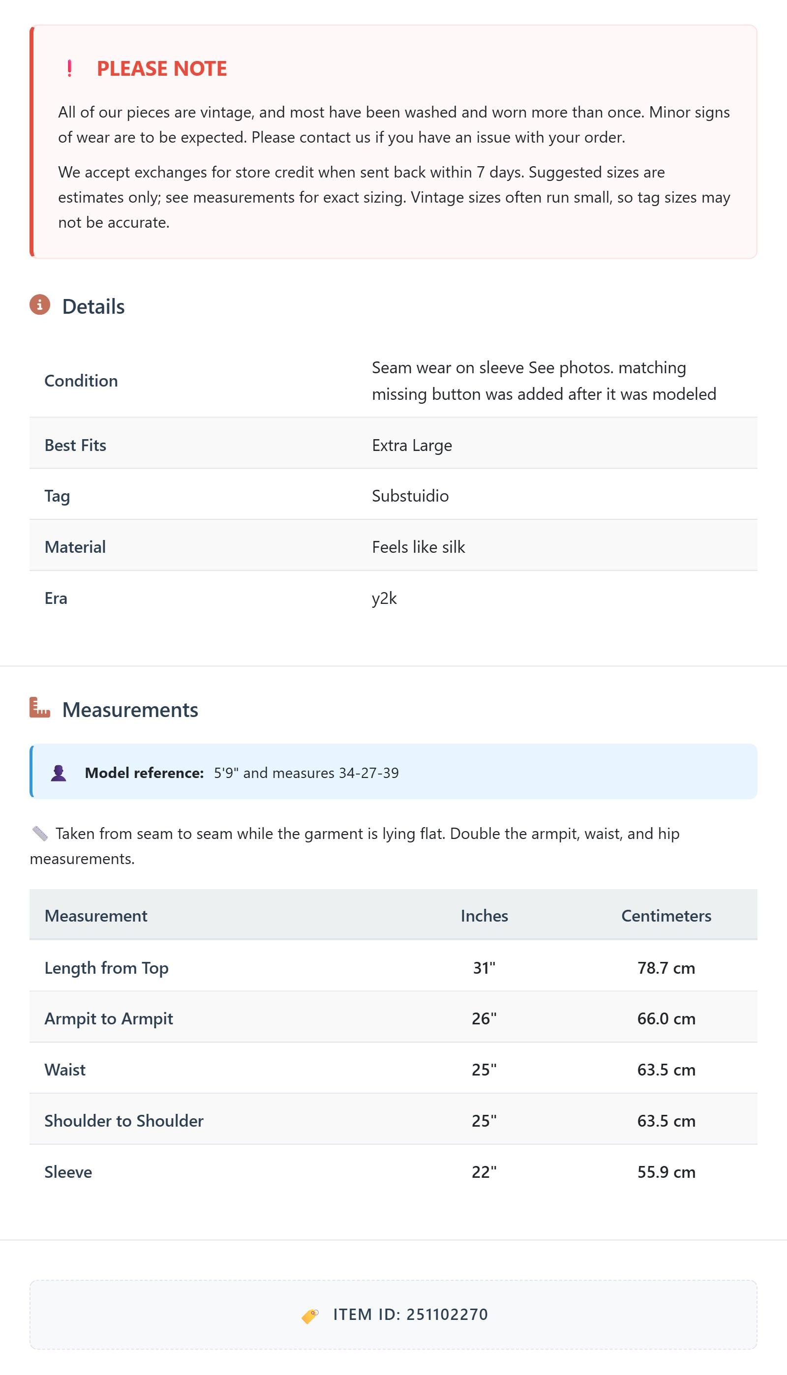 All of our pieces are vintage, and most have been washed and worn more than once. Minor signs of wear are to be expected. Please contact us if you have an issue with your order. We accept exchanges for store credit when sent back within 7 days.