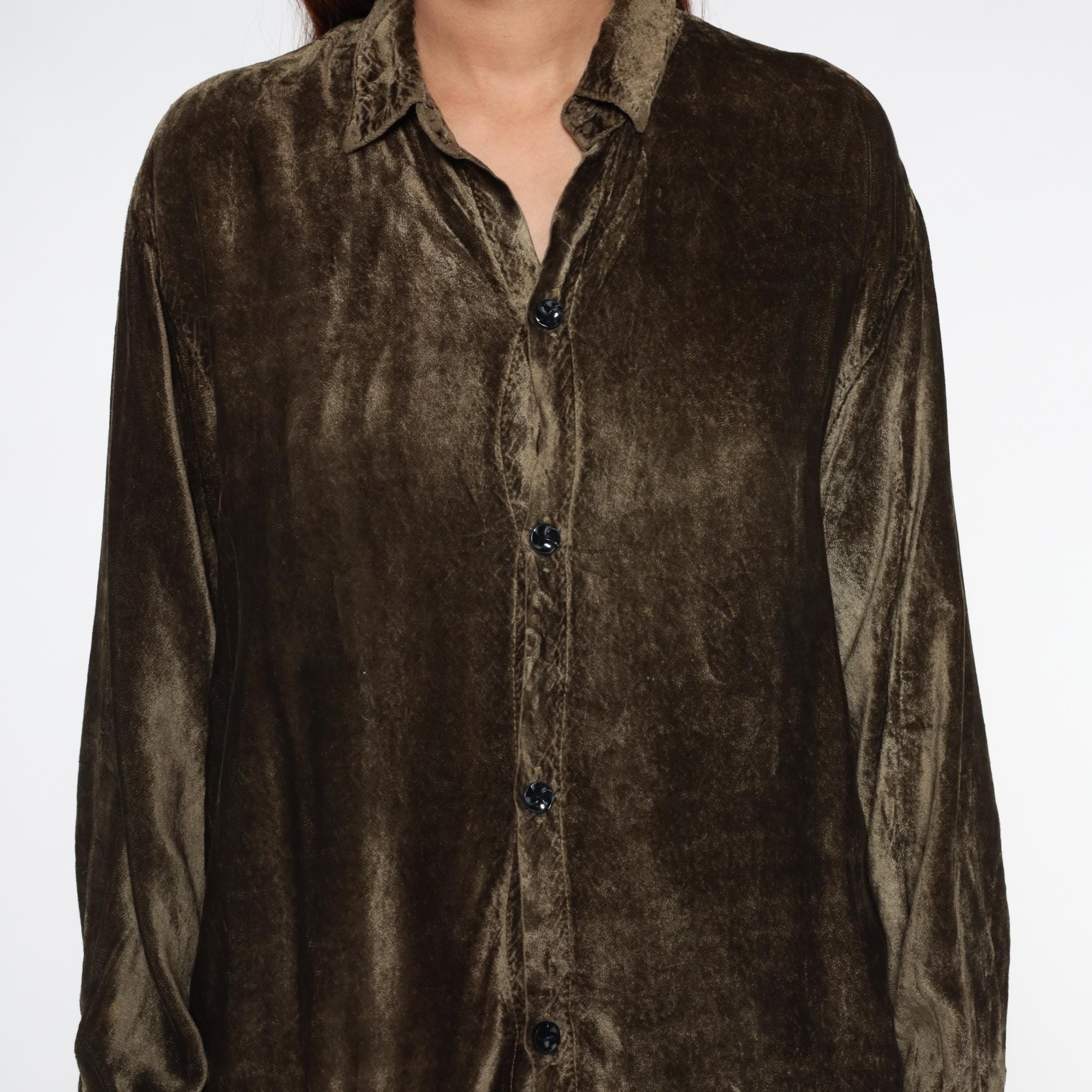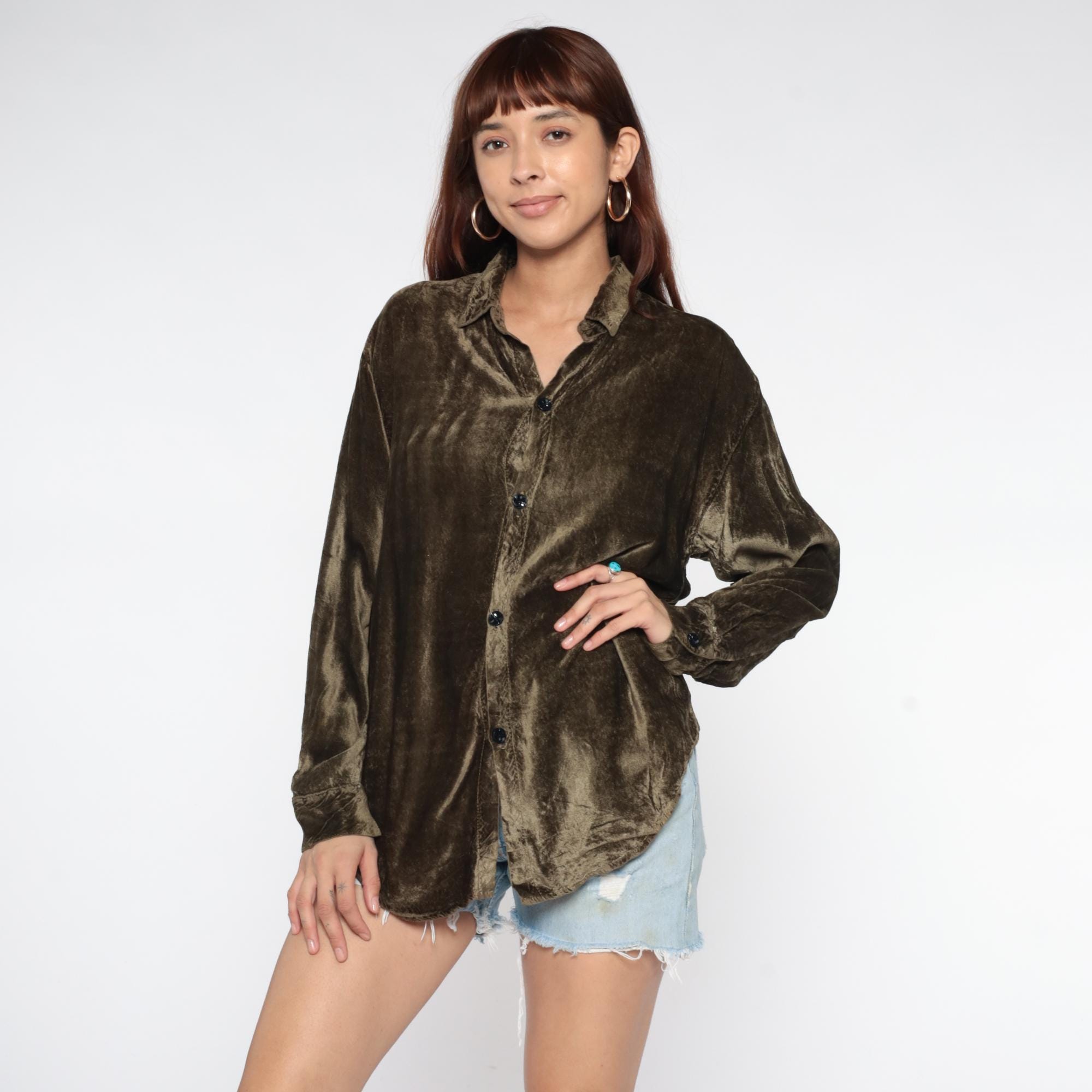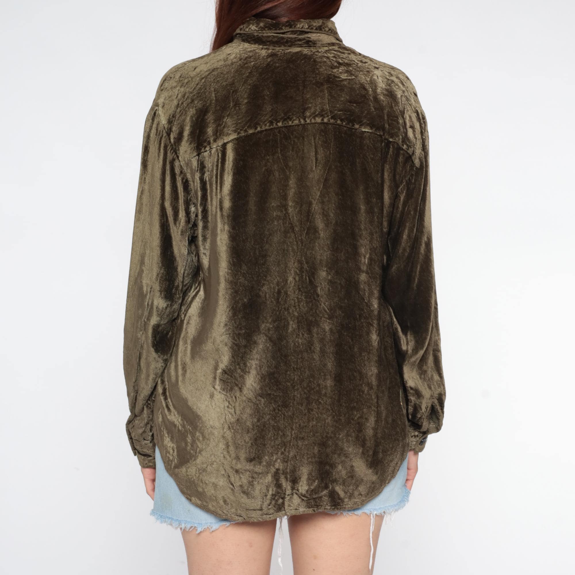 Vintage olive green velvet button-up shirt from C P Shades San Francisco. Relaxed fit with long sleeves and collared neckline. Front button closure with black buttons. Single chest pocket. Crushed velvet texture across the fabric in a rich olive tone.