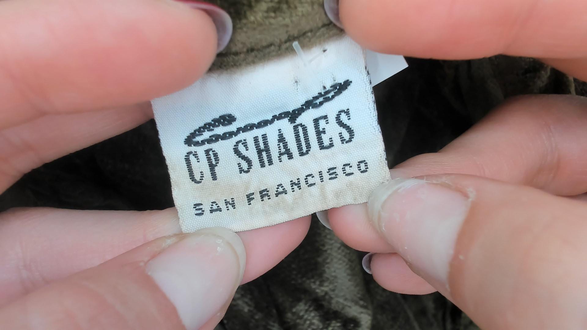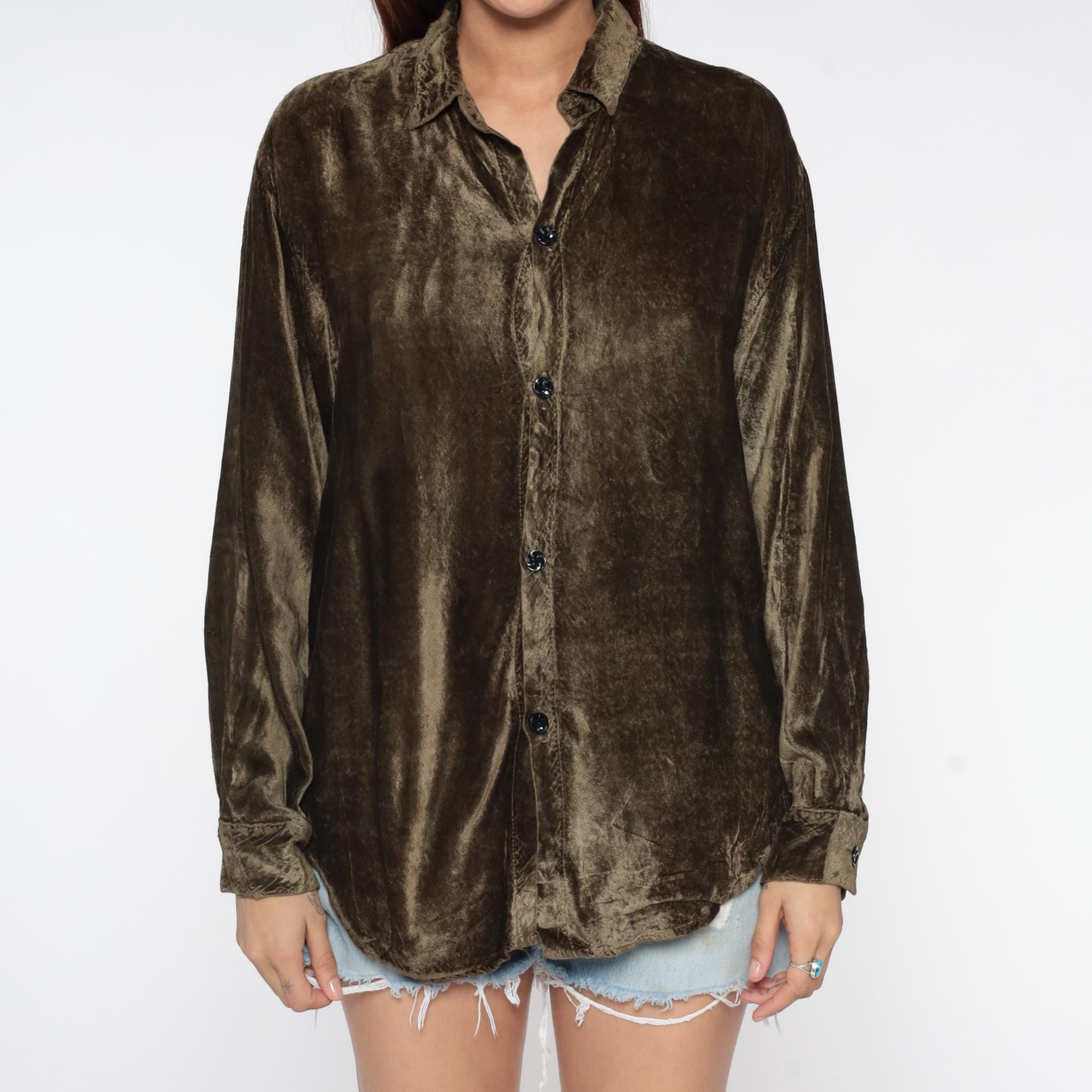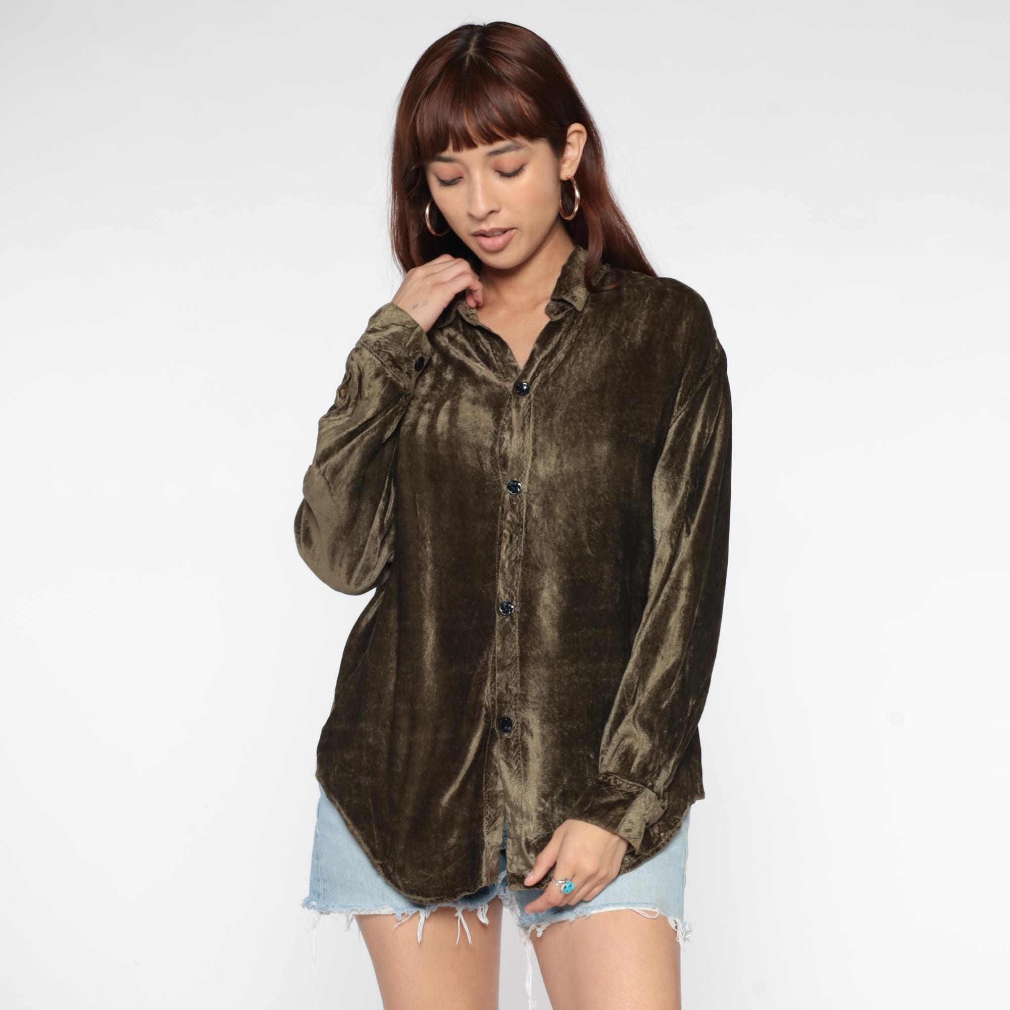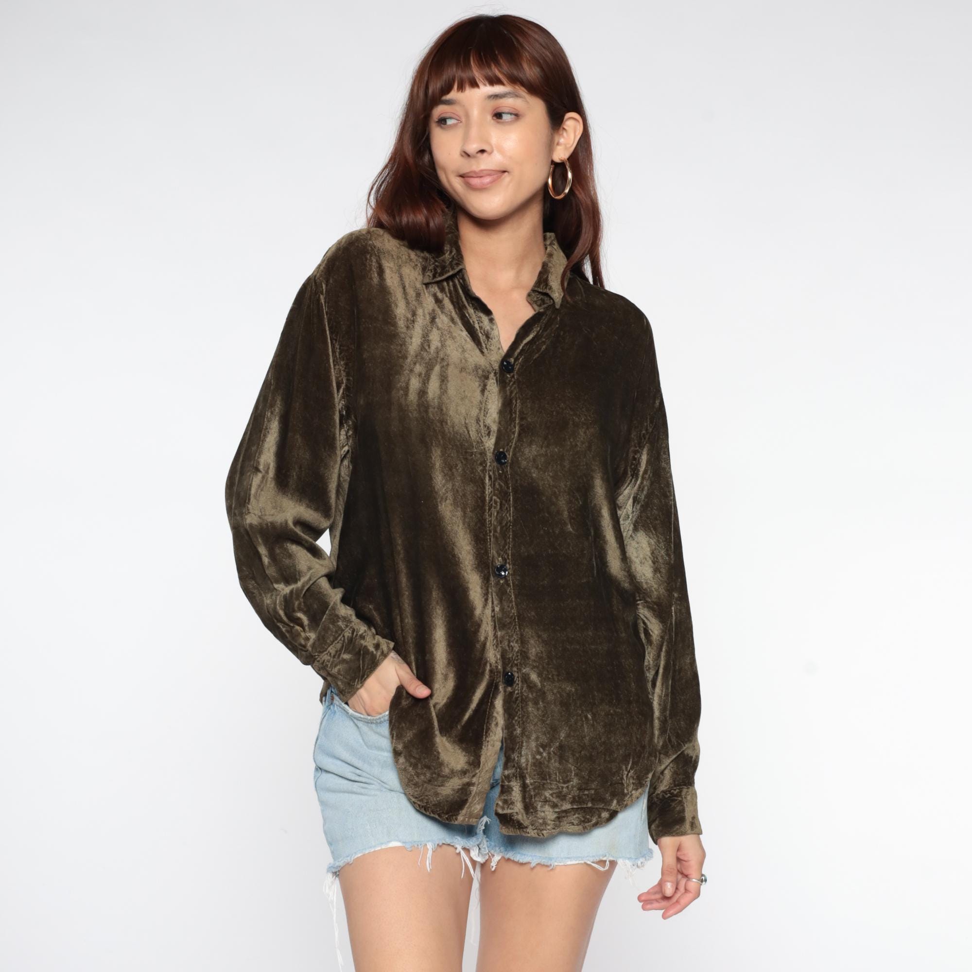 Vintage olive green velvet button-up shirt from C P Shades San Francisco. Relaxed fit with long sleeves and collared neckline. Front button closure with black buttons. Single chest pocket. Crushed velvet texture across the fabric in a rich olive tone.