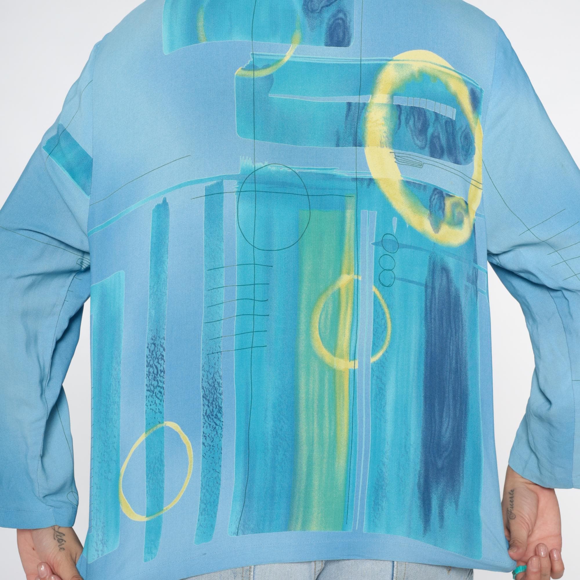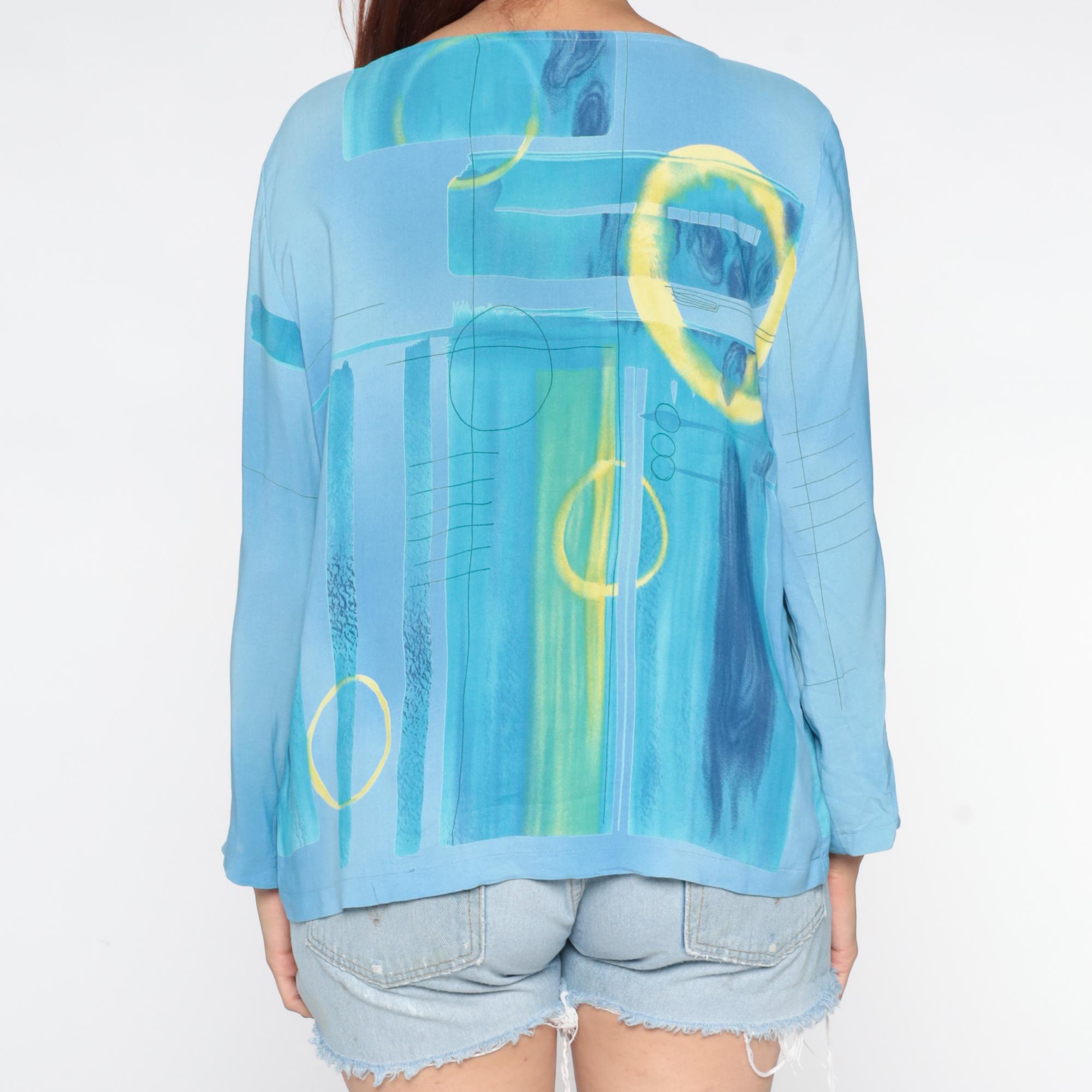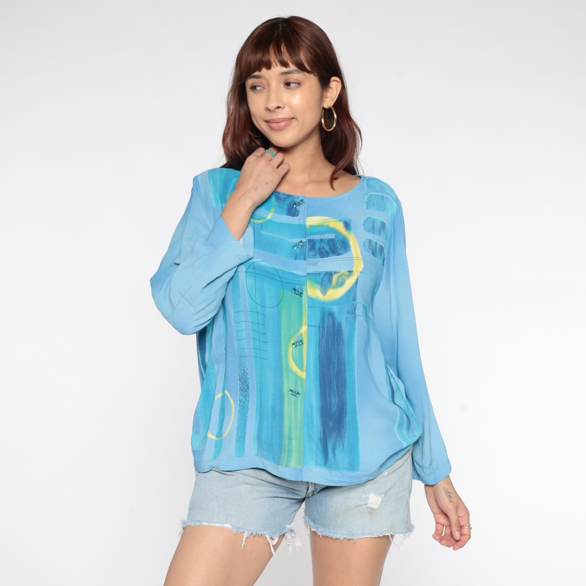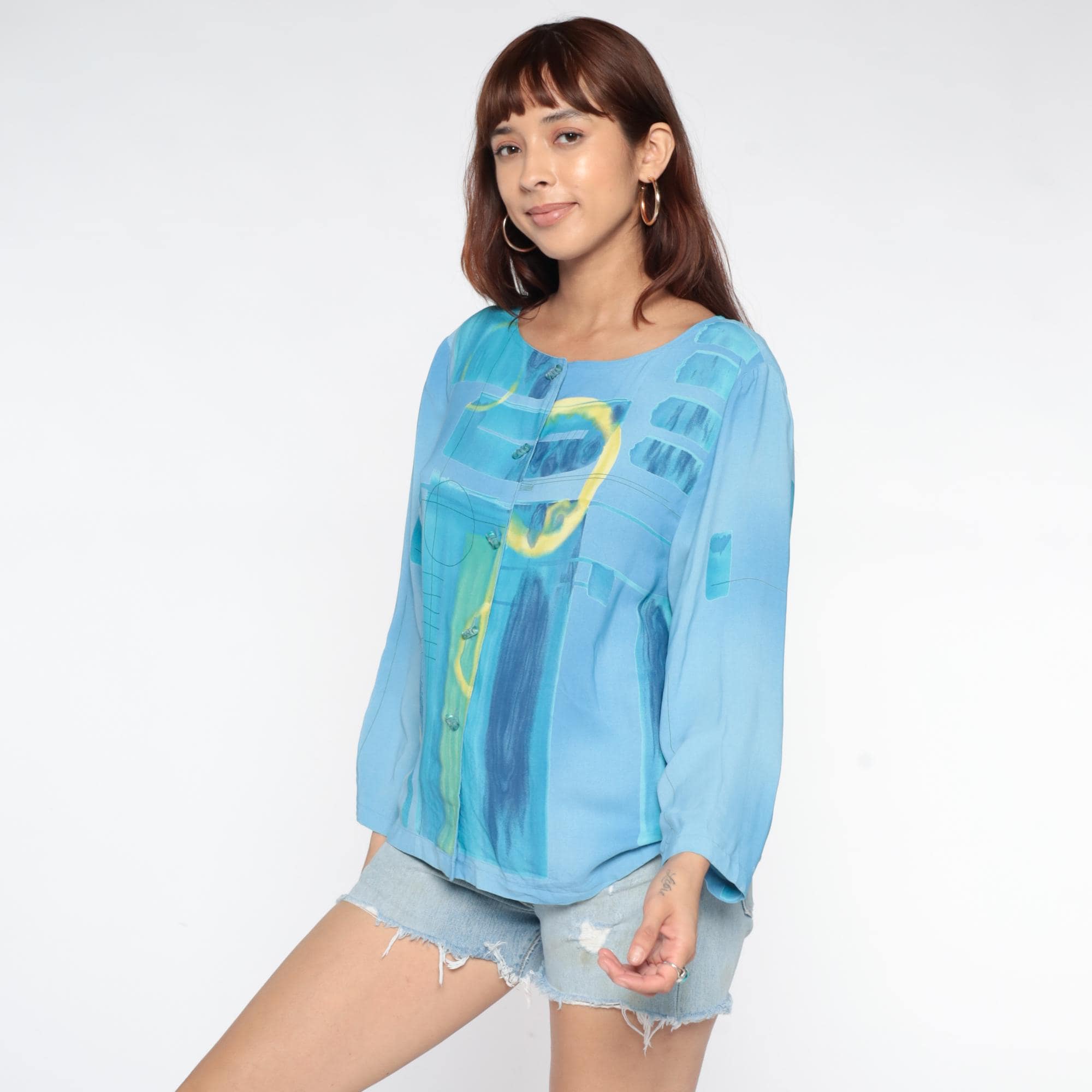 Vintage 90s blouse in soft blue with abstract geometric print. Blue geometric shapes, white line work, and yellow-green accent swirls create a watercolor-style pattern across the fabric. Round neckline with button front closure featuring decorative blue buttons.