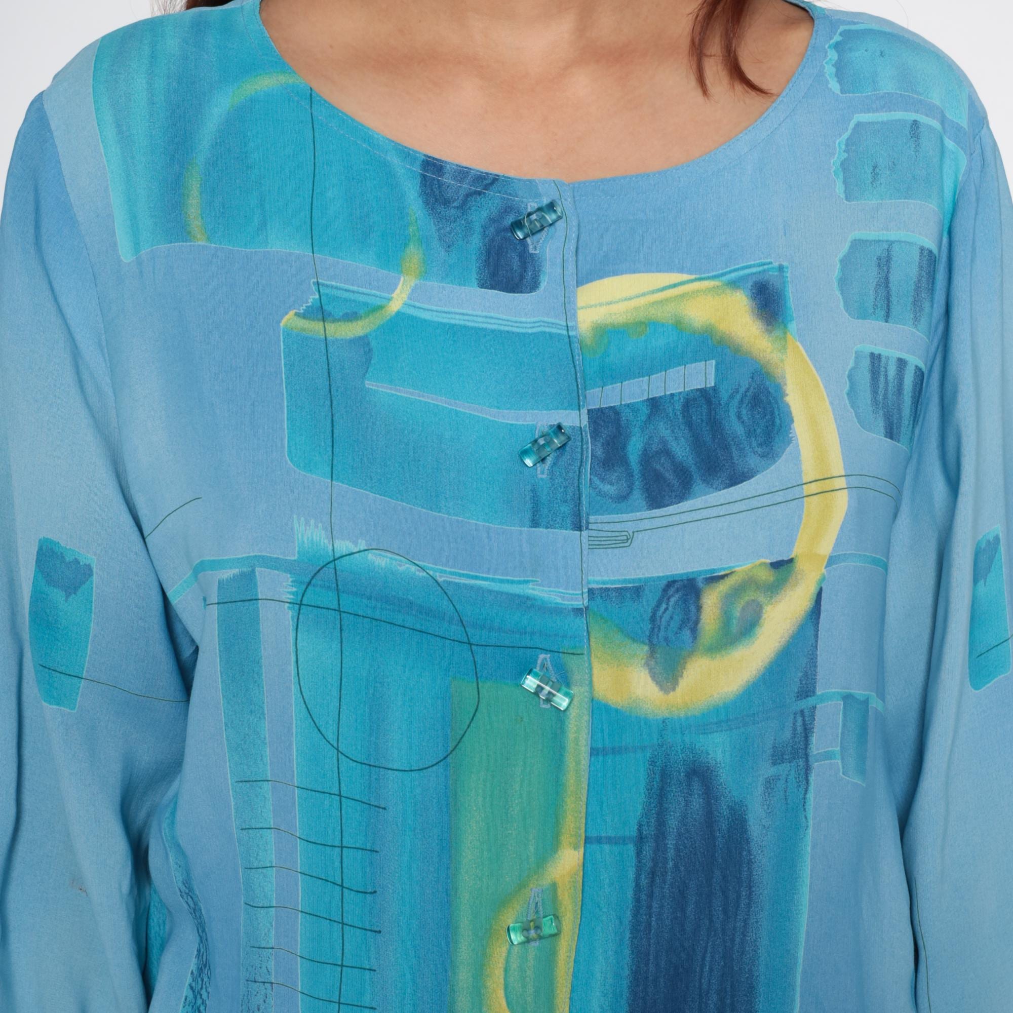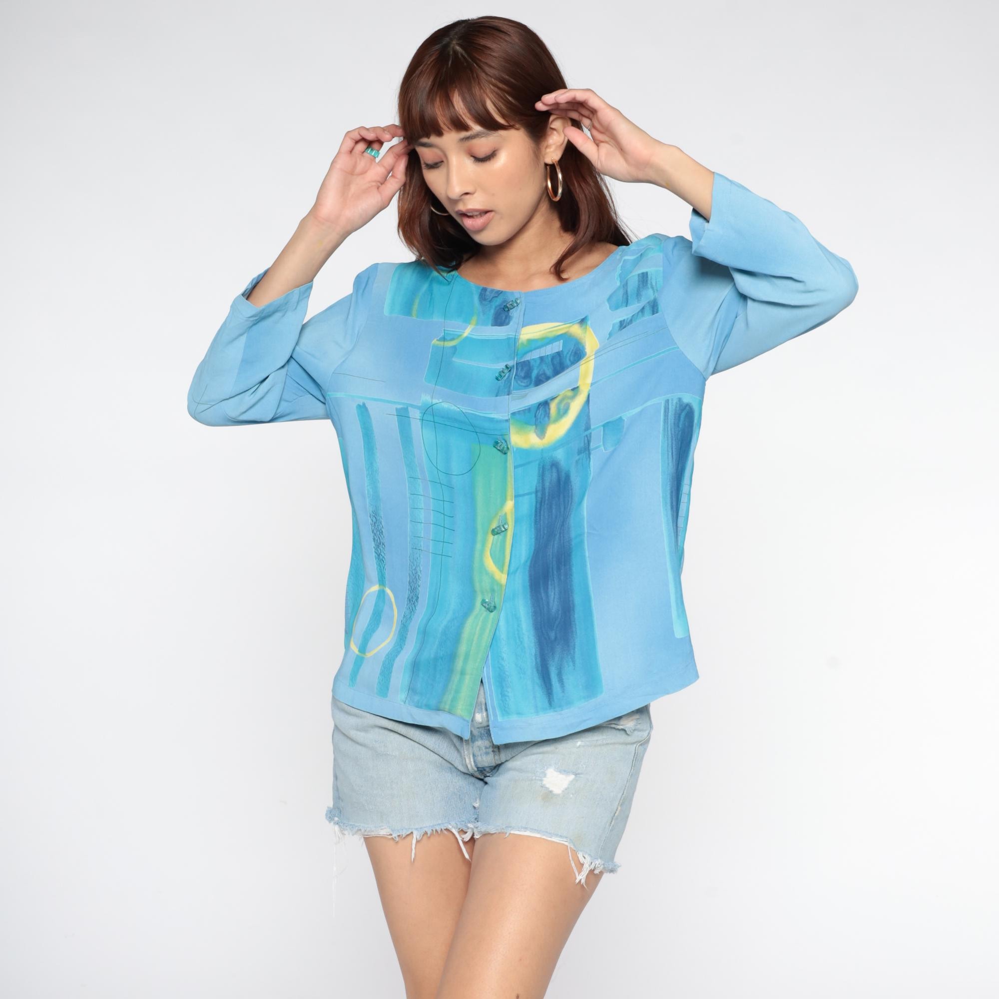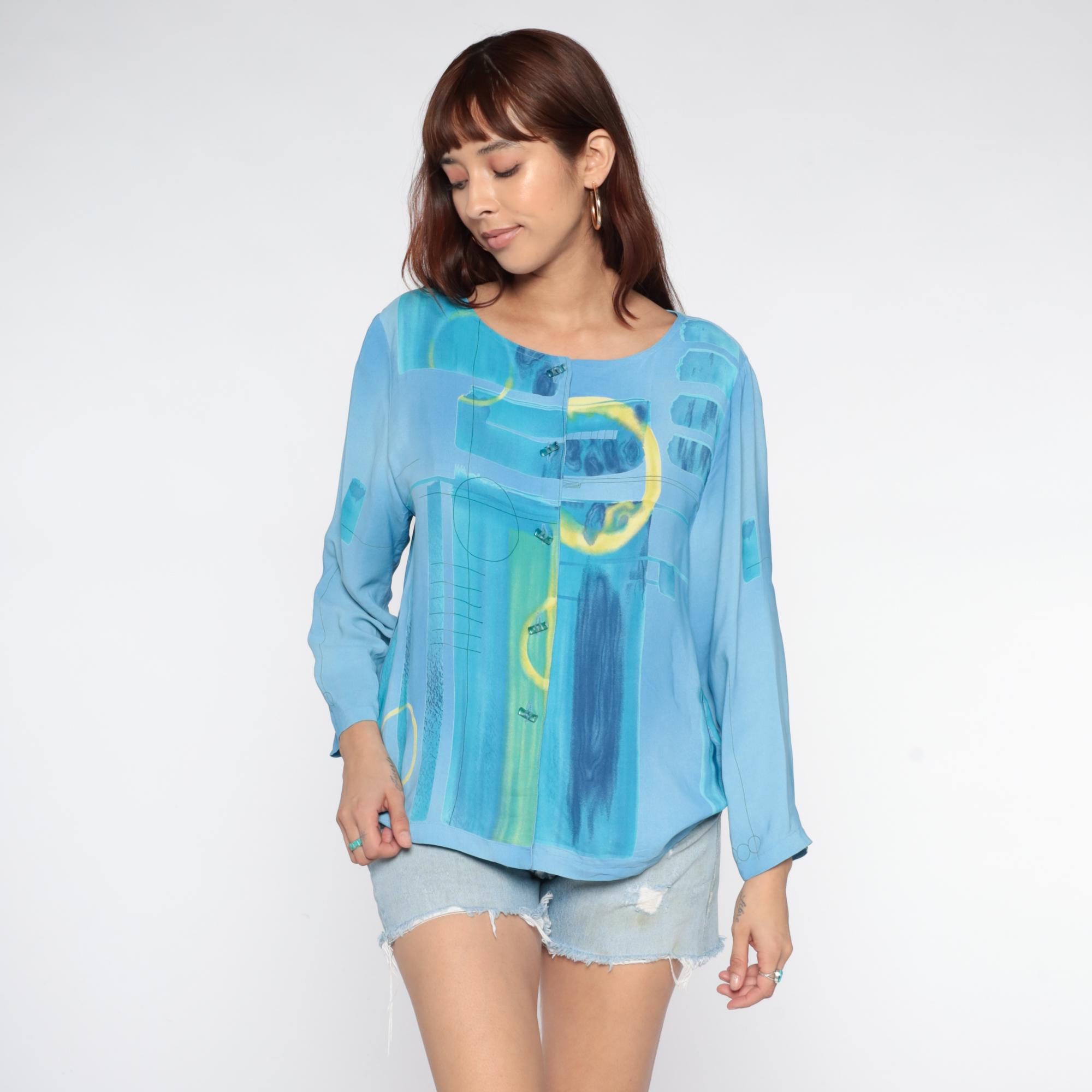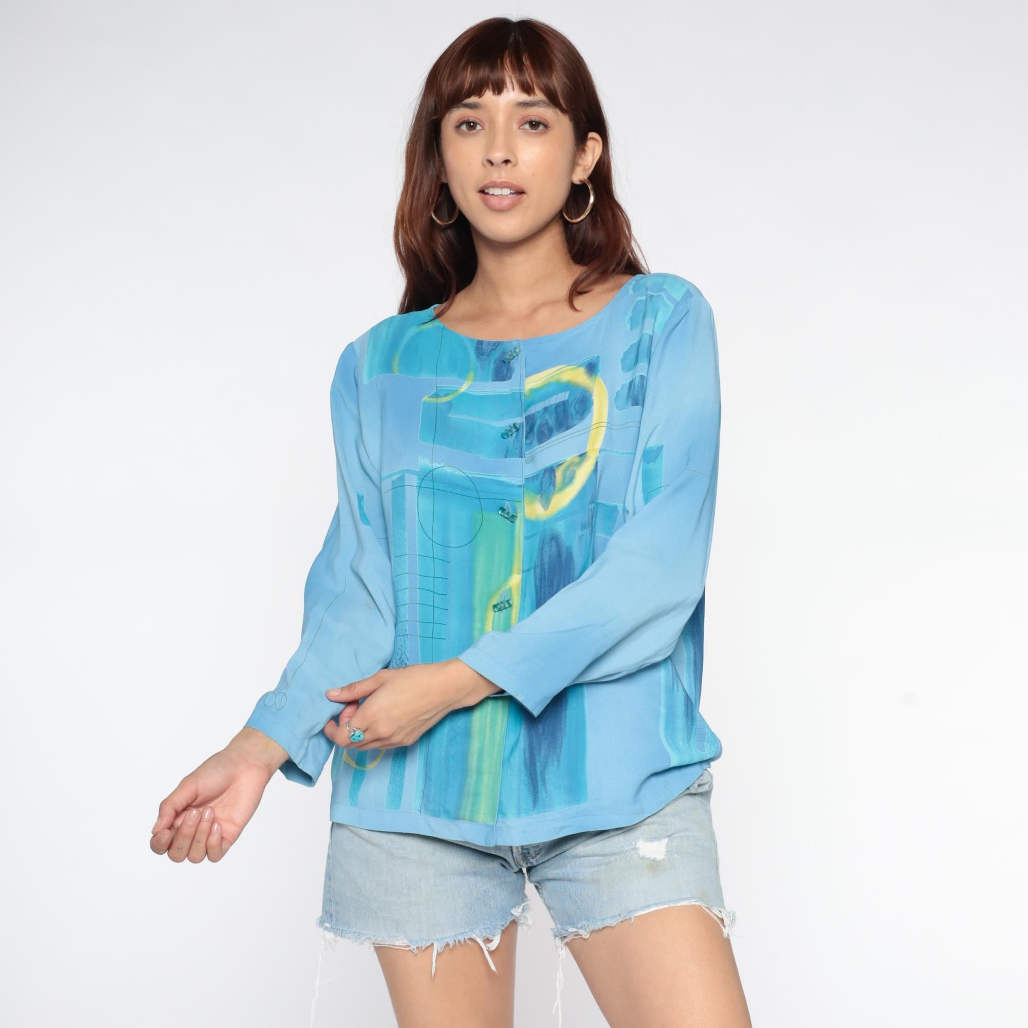 Vintage 90s blouse in soft blue with abstract geometric print. Blue geometric shapes, white line work, and yellow-green accent swirls create a watercolor-style pattern across the fabric. Round neckline with button front closure featuring decorative blue buttons.