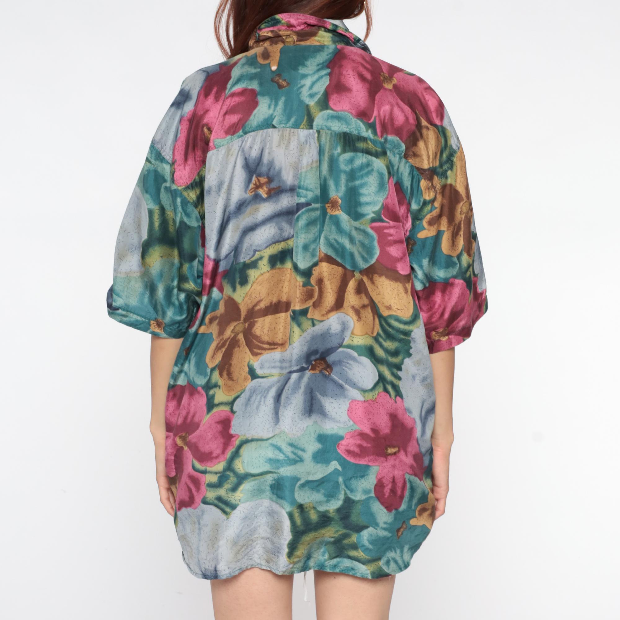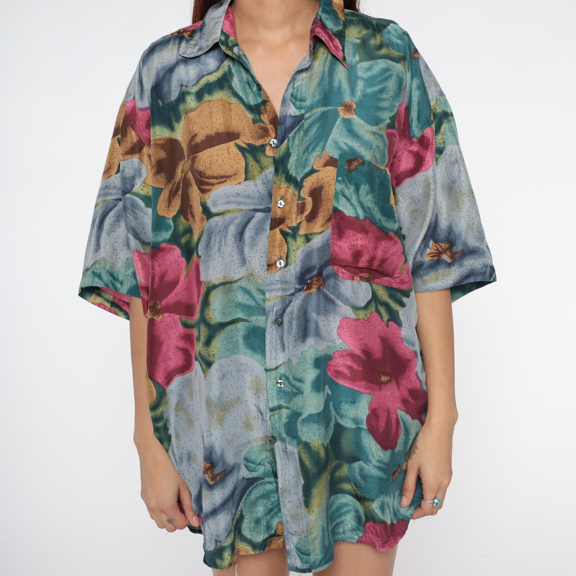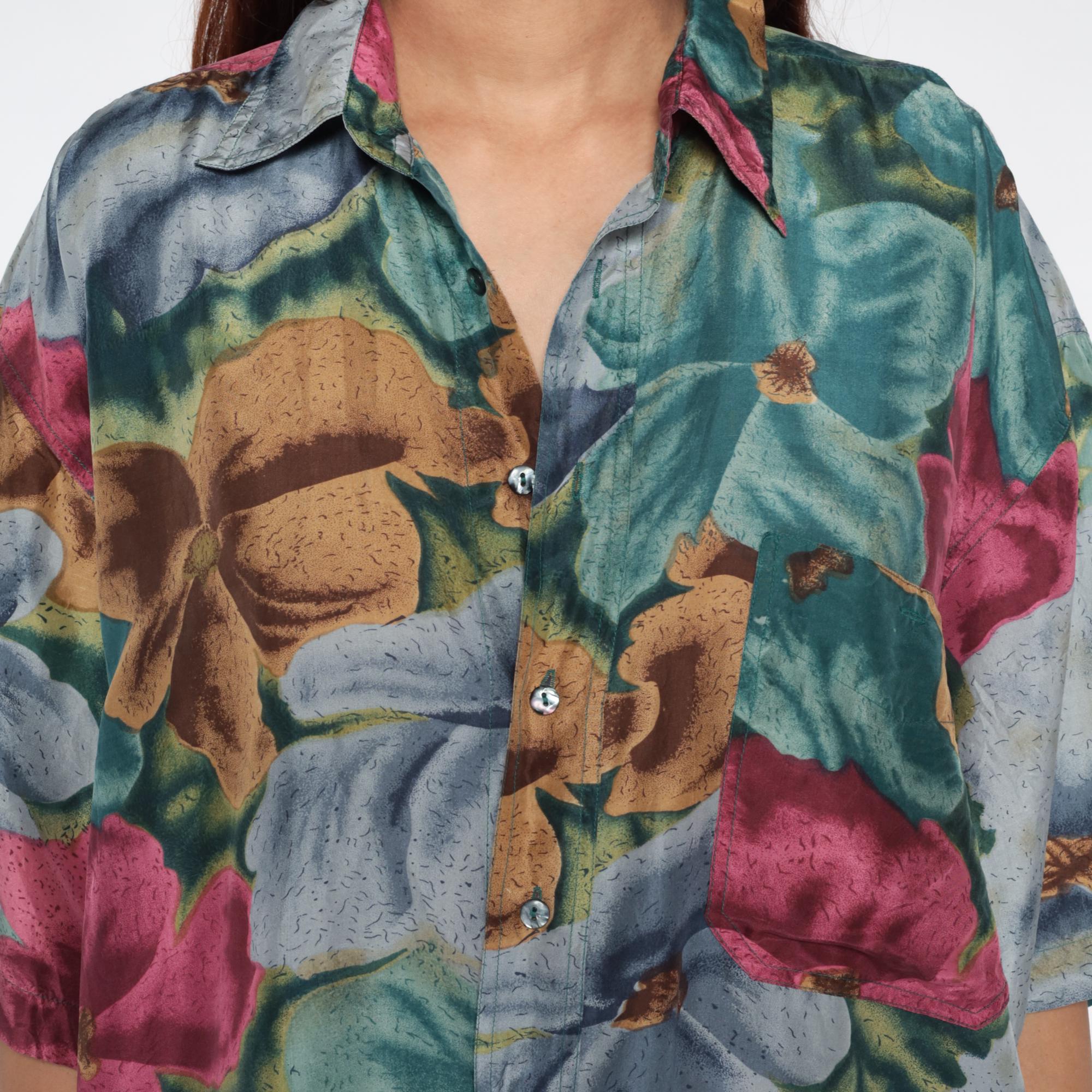 90s silk shirt with large-scale floral print in teal, pink, blue, and gold tones across pure silk fabric. Button front closure with collar and short sleeves.