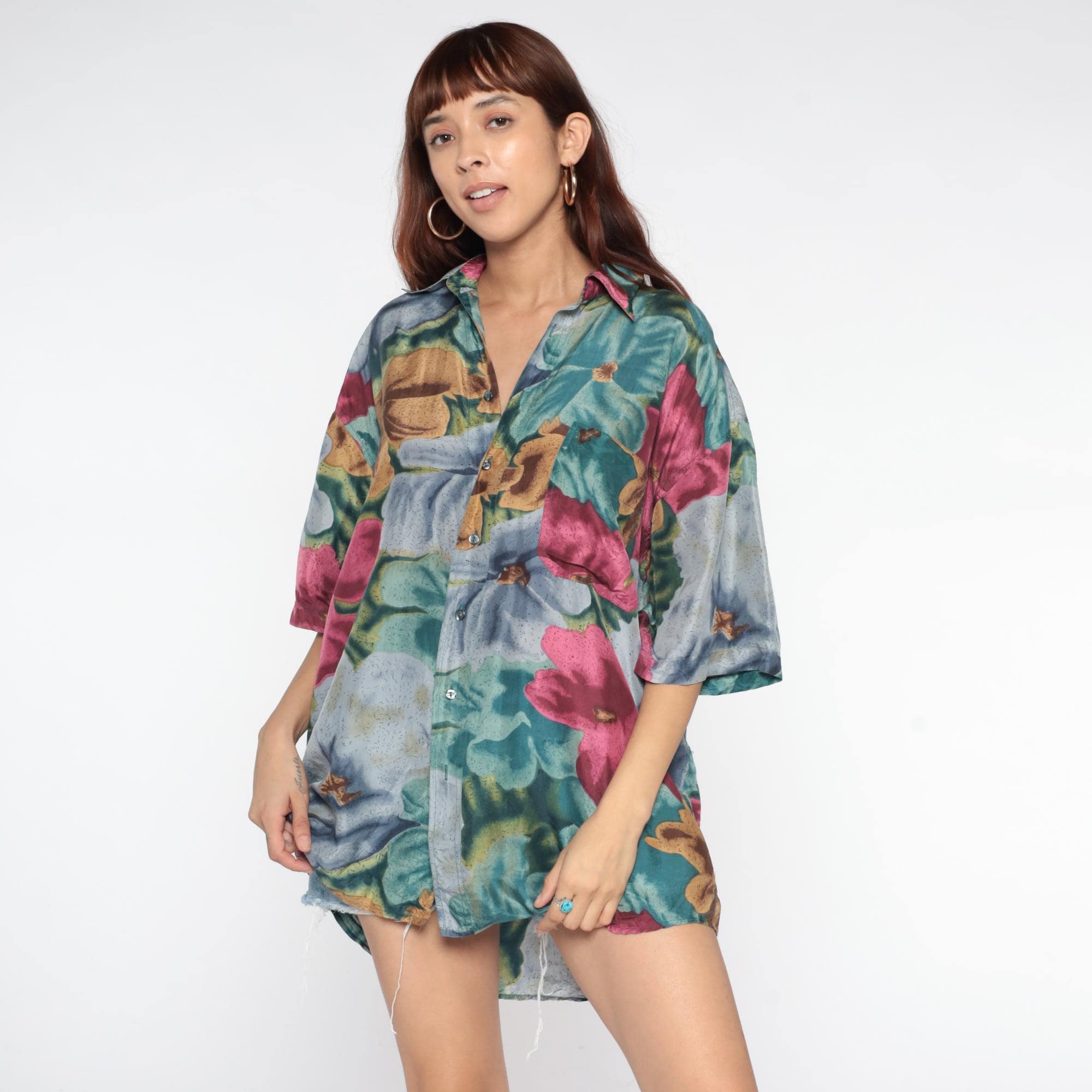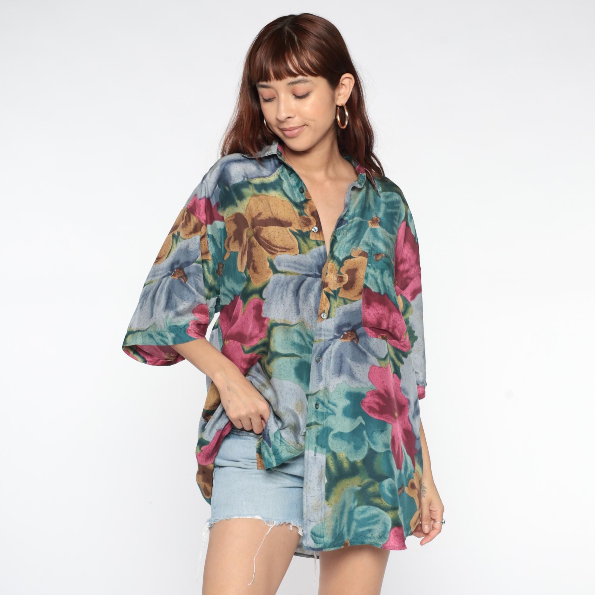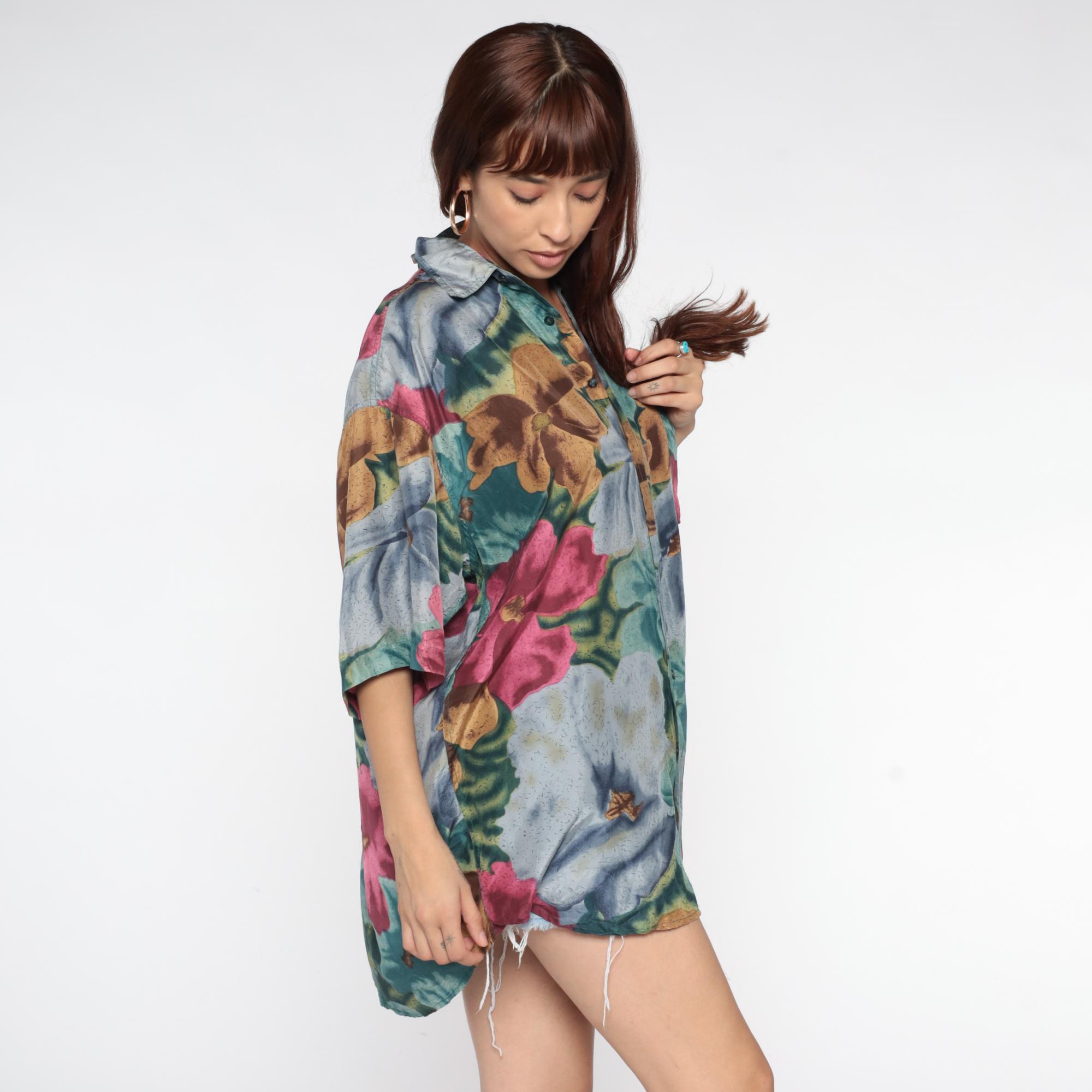 90s silk shirt with large-scale floral print in teal, pink, blue, and gold tones across pure silk fabric. Button front closure with collar and short sleeves.