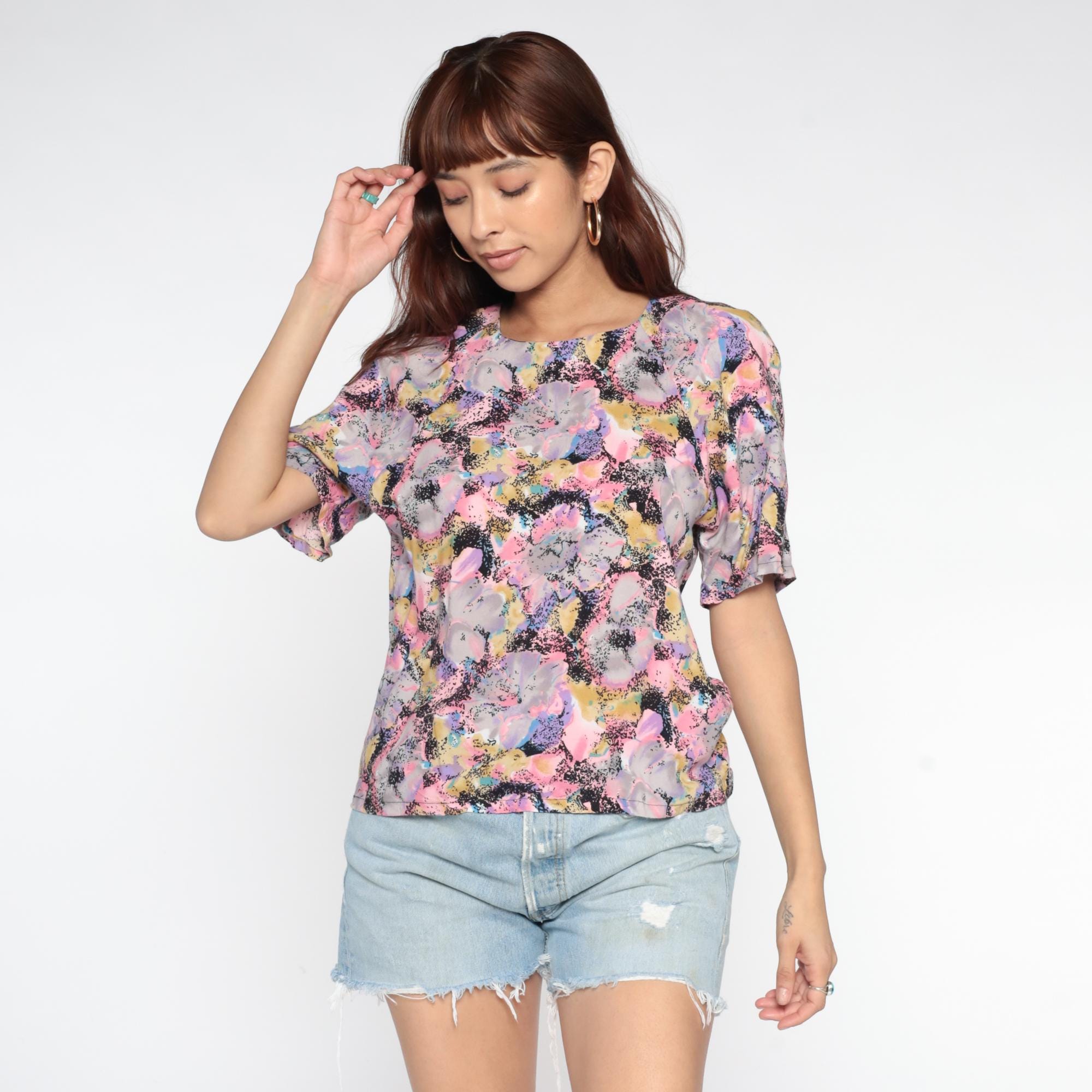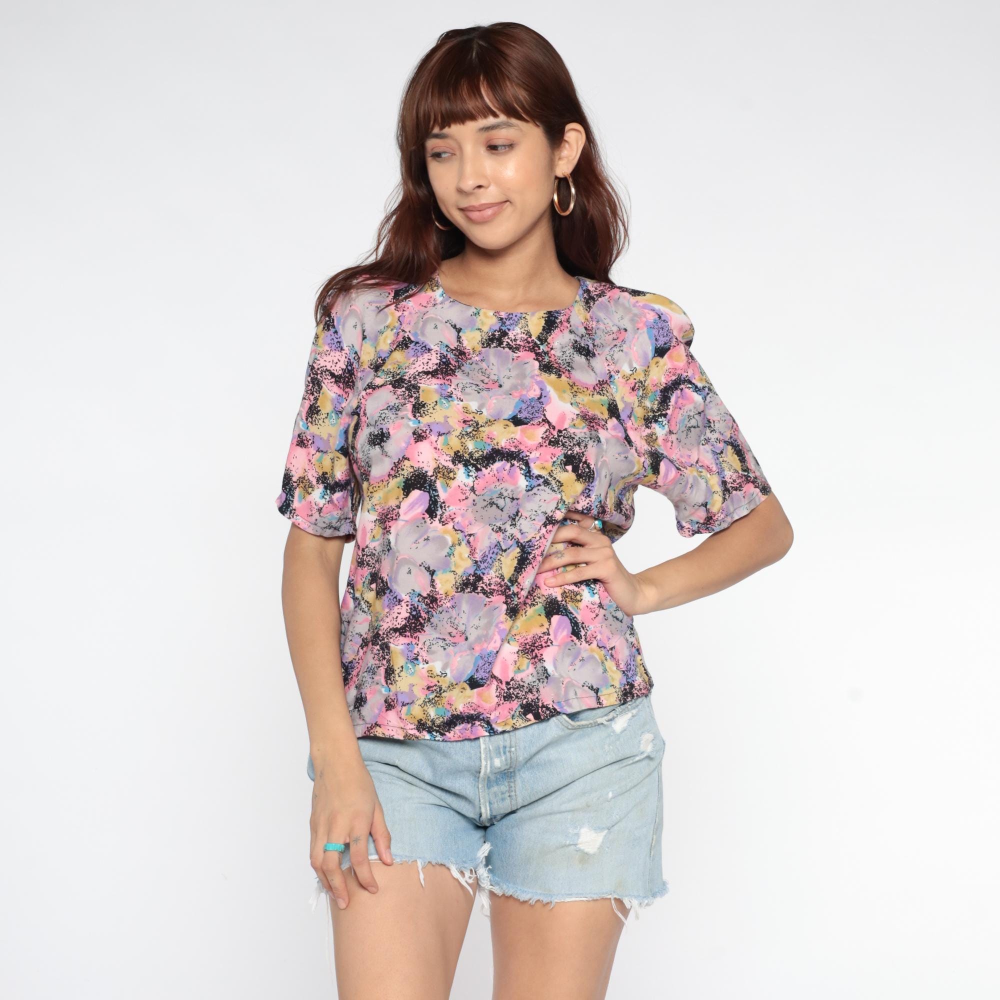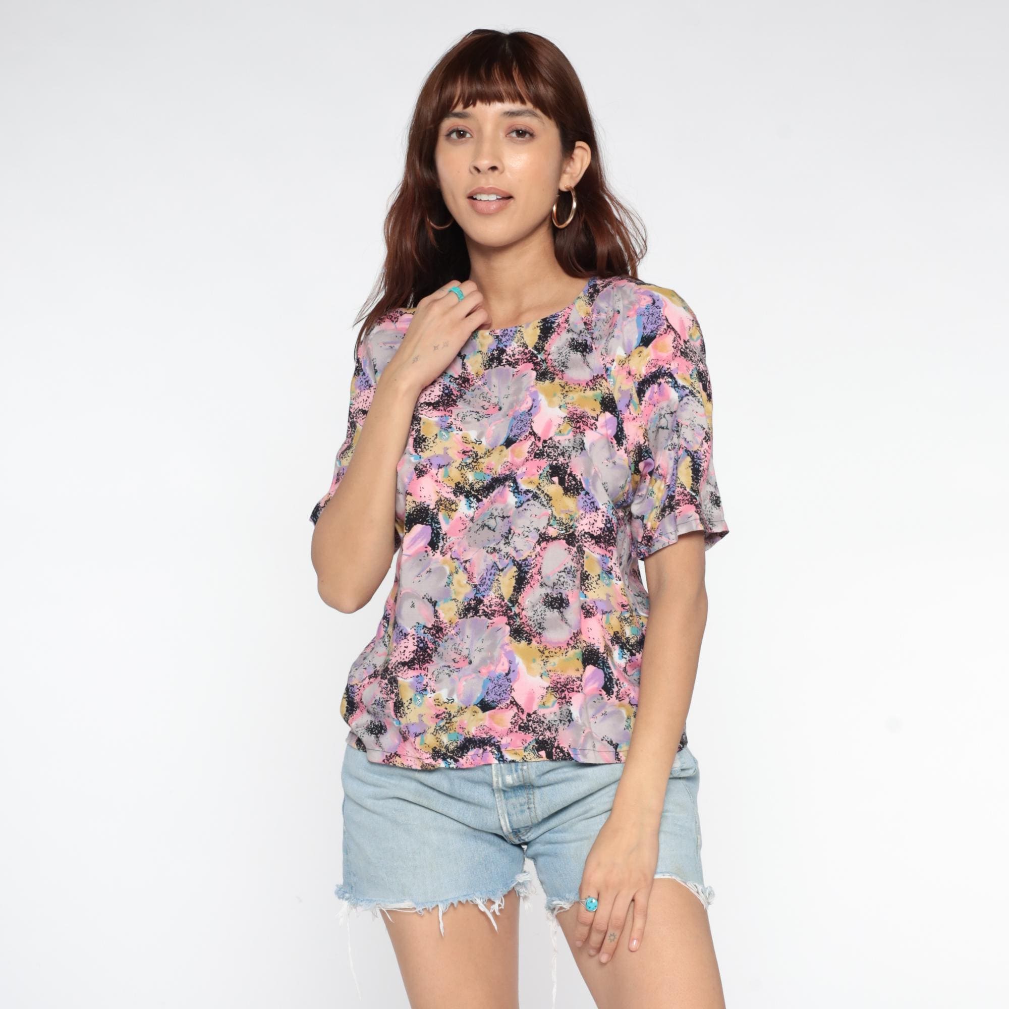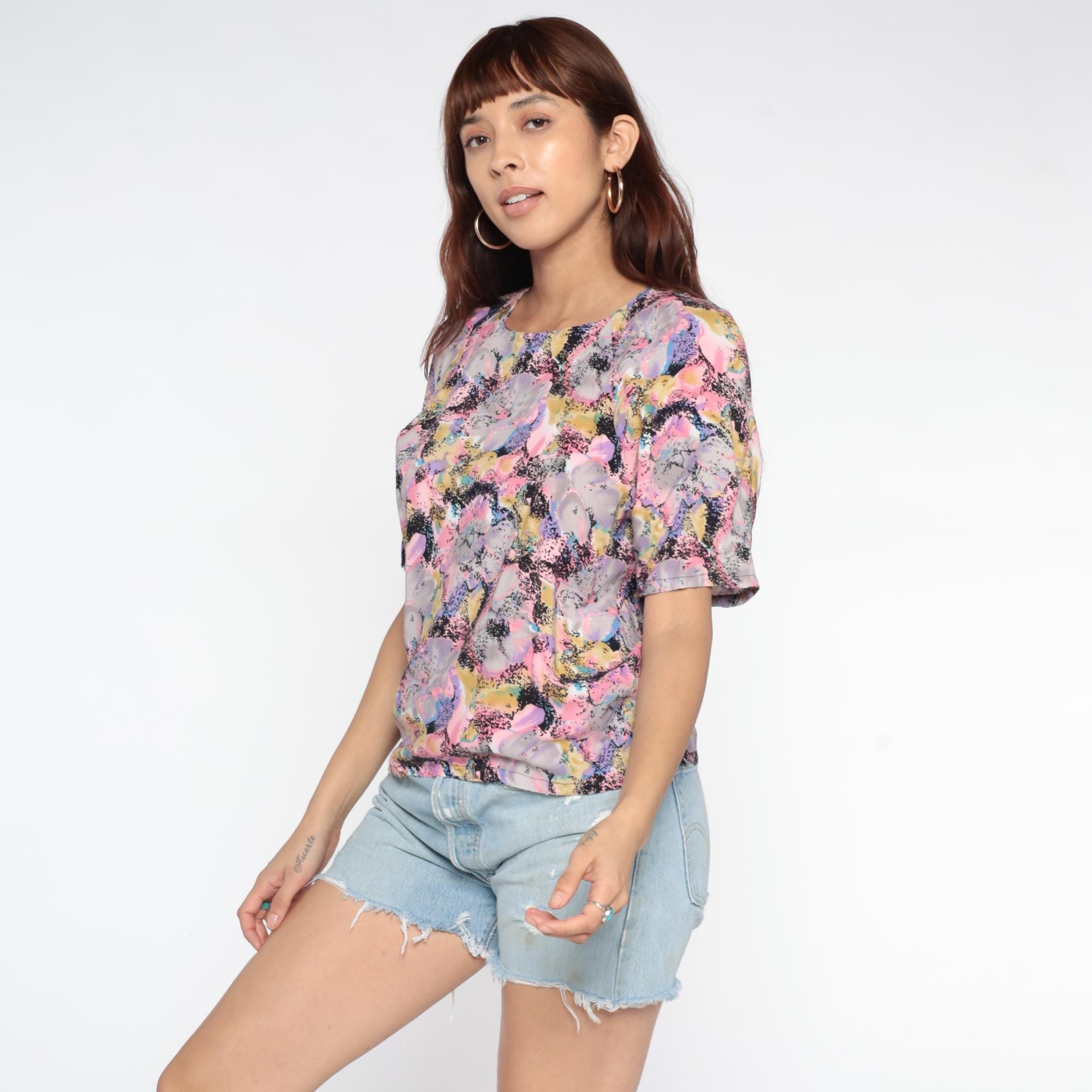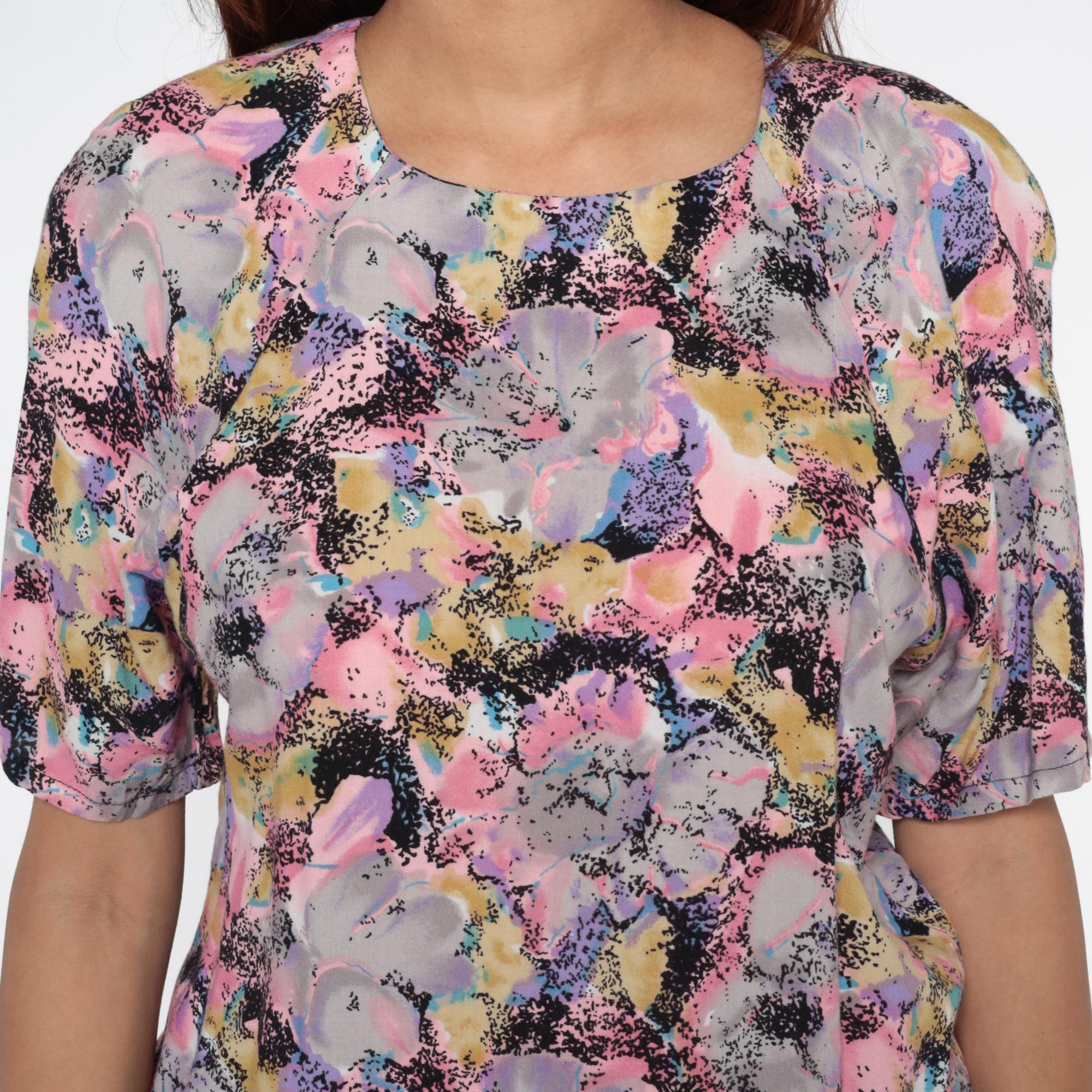 90s abstract floral top in rayon with soft pastel watercolor print in pink, lavender, yellow, gray, and black. Short sleeves with rolled cuffs and scoop neckline.