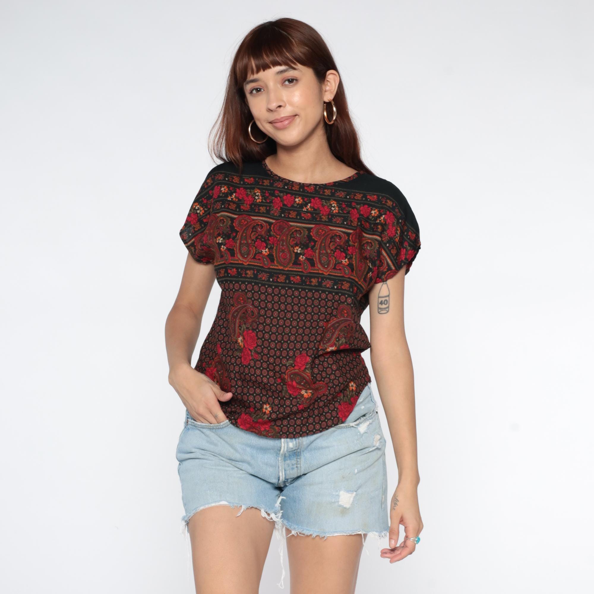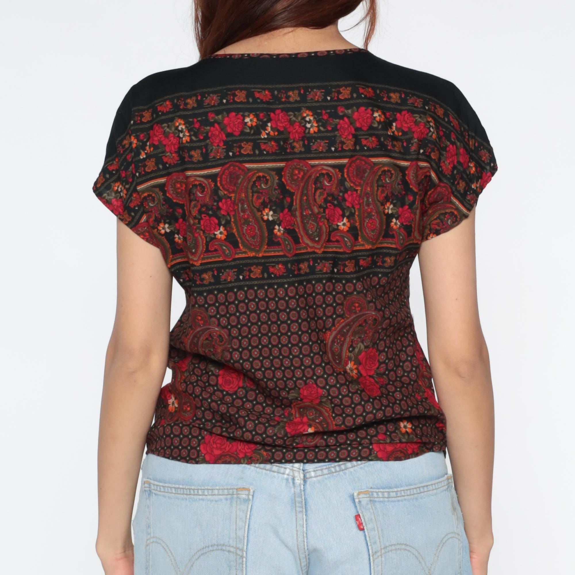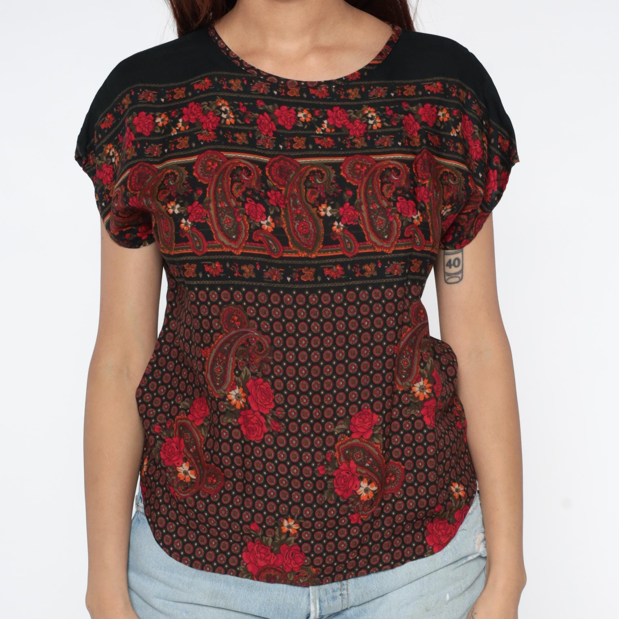 90s short sleeve top with intricate paisley and floral print in black, burgundy, red, and orange tones. Fitted bodice with rounded neckline and black yoke section across shoulders and upper chest. Short gathered sleeves with solid black upper portion. Three distinct pattern bands create visual separation: red roses with small orange flowers across the shoulder area, paisley motifs with roses in the chest section, and a geometric medallion pattern with paisley designs and scattered red roses across the lower body.