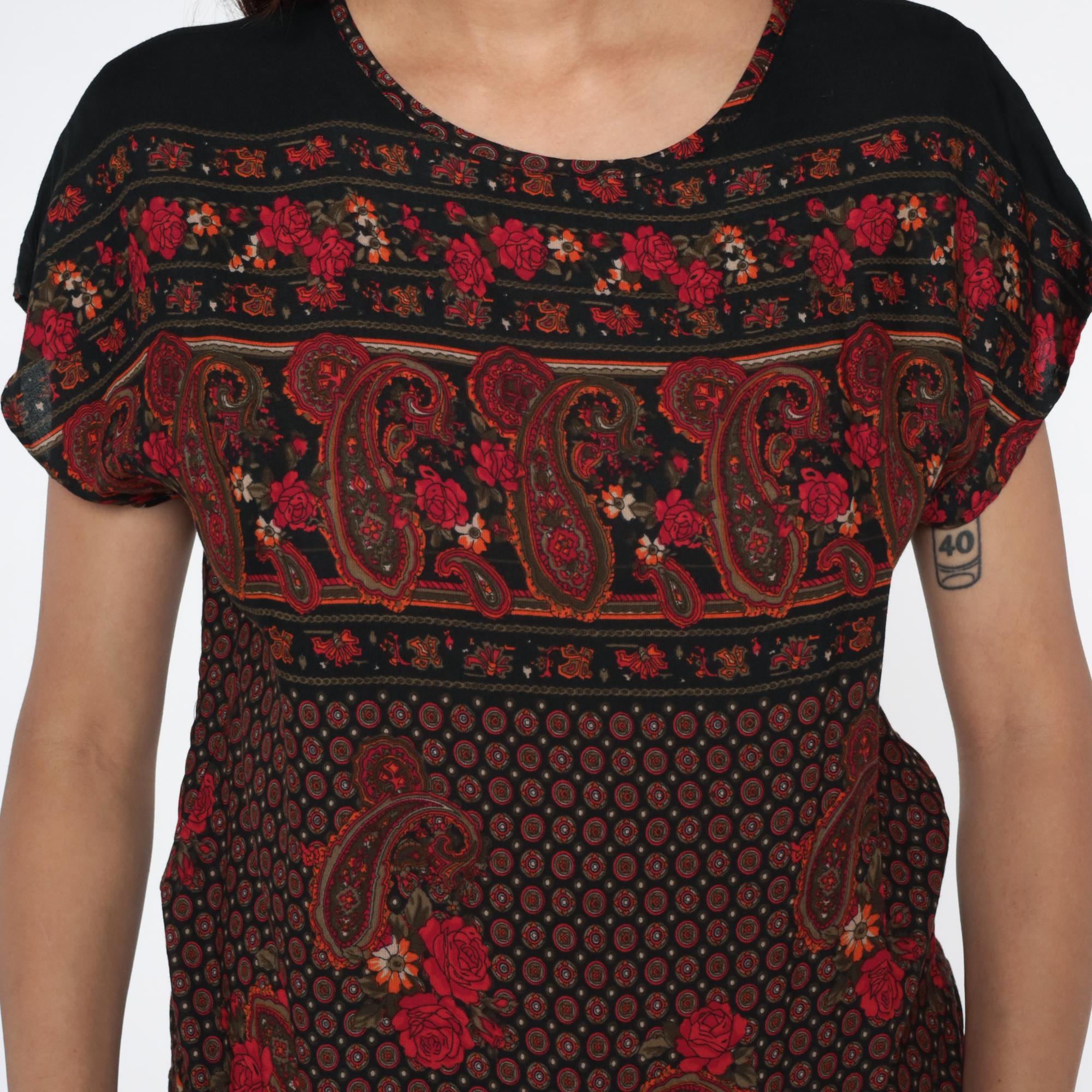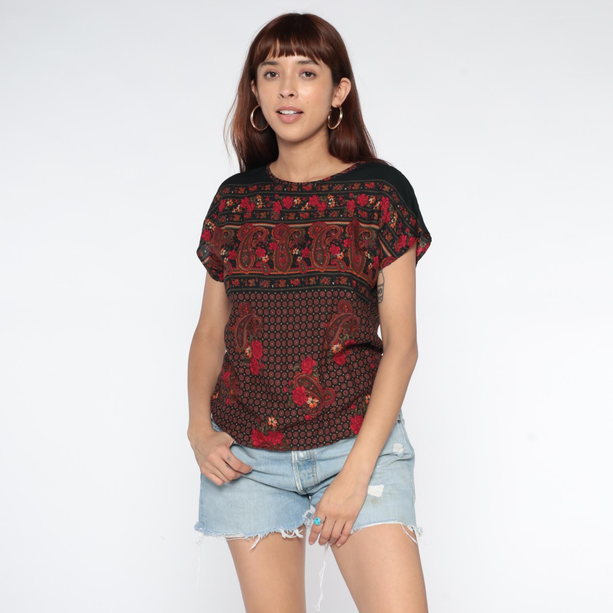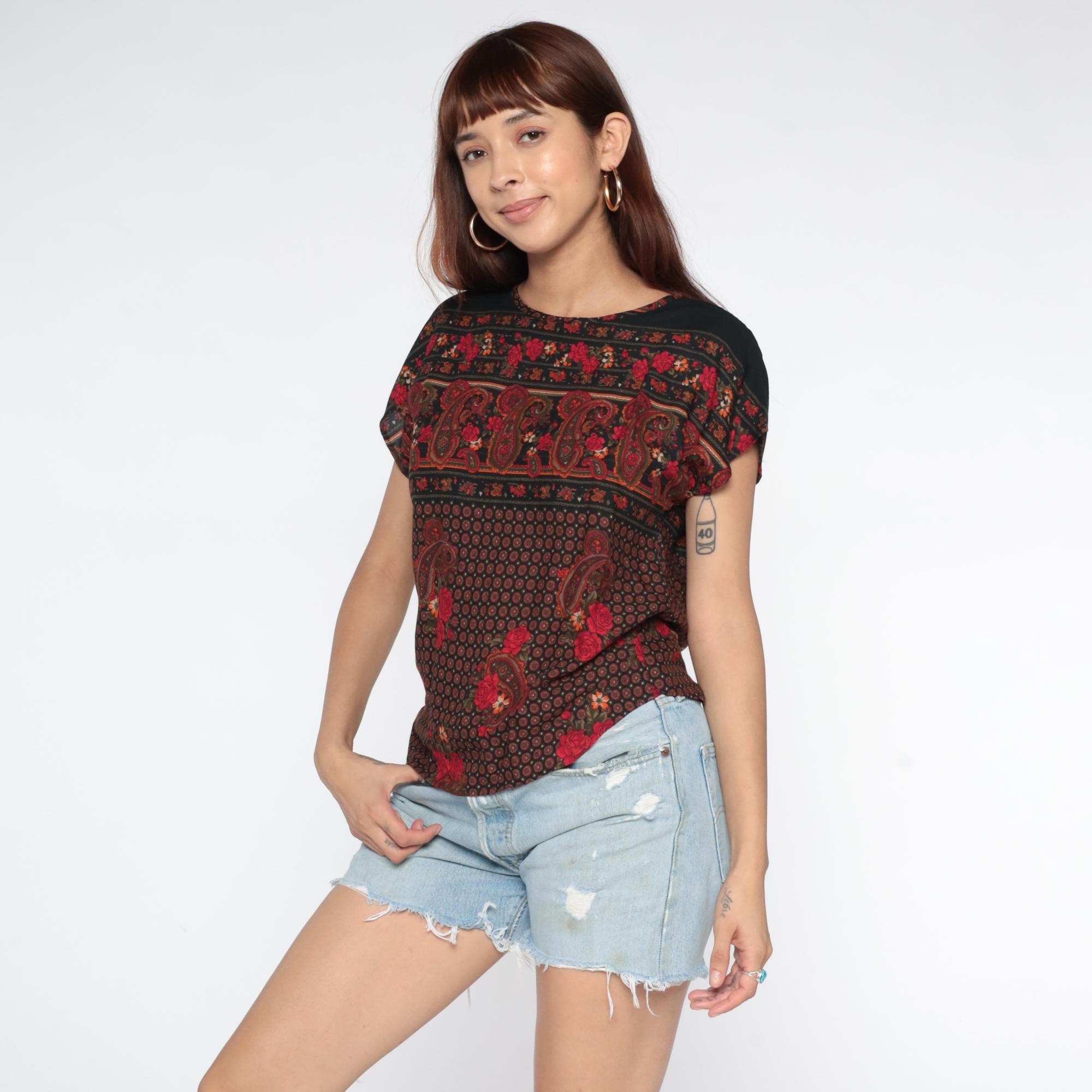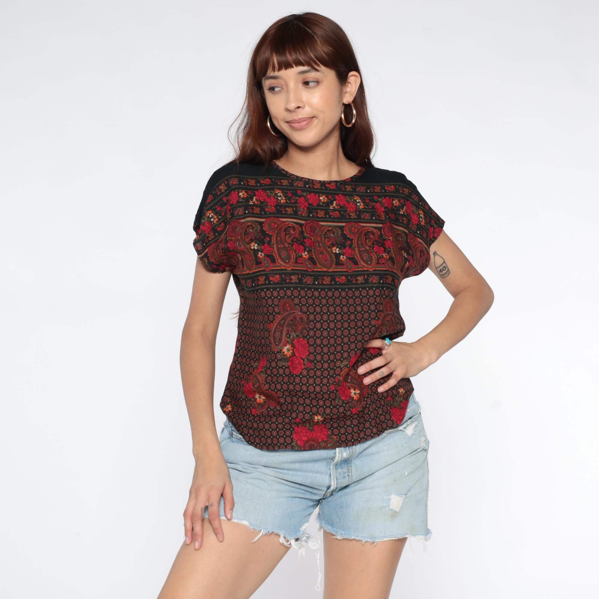 90s short sleeve top with intricate paisley and floral print in black, burgundy, red, and orange tones. Fitted bodice with rounded neckline and black yoke section across shoulders and upper chest. Short gathered sleeves with solid black upper portion. Three distinct pattern bands create visual separation: red roses with small orange flowers across the shoulder area, paisley motifs with roses in the chest section, and a geometric medallion pattern with paisley designs and scattered red roses across the lower body.
