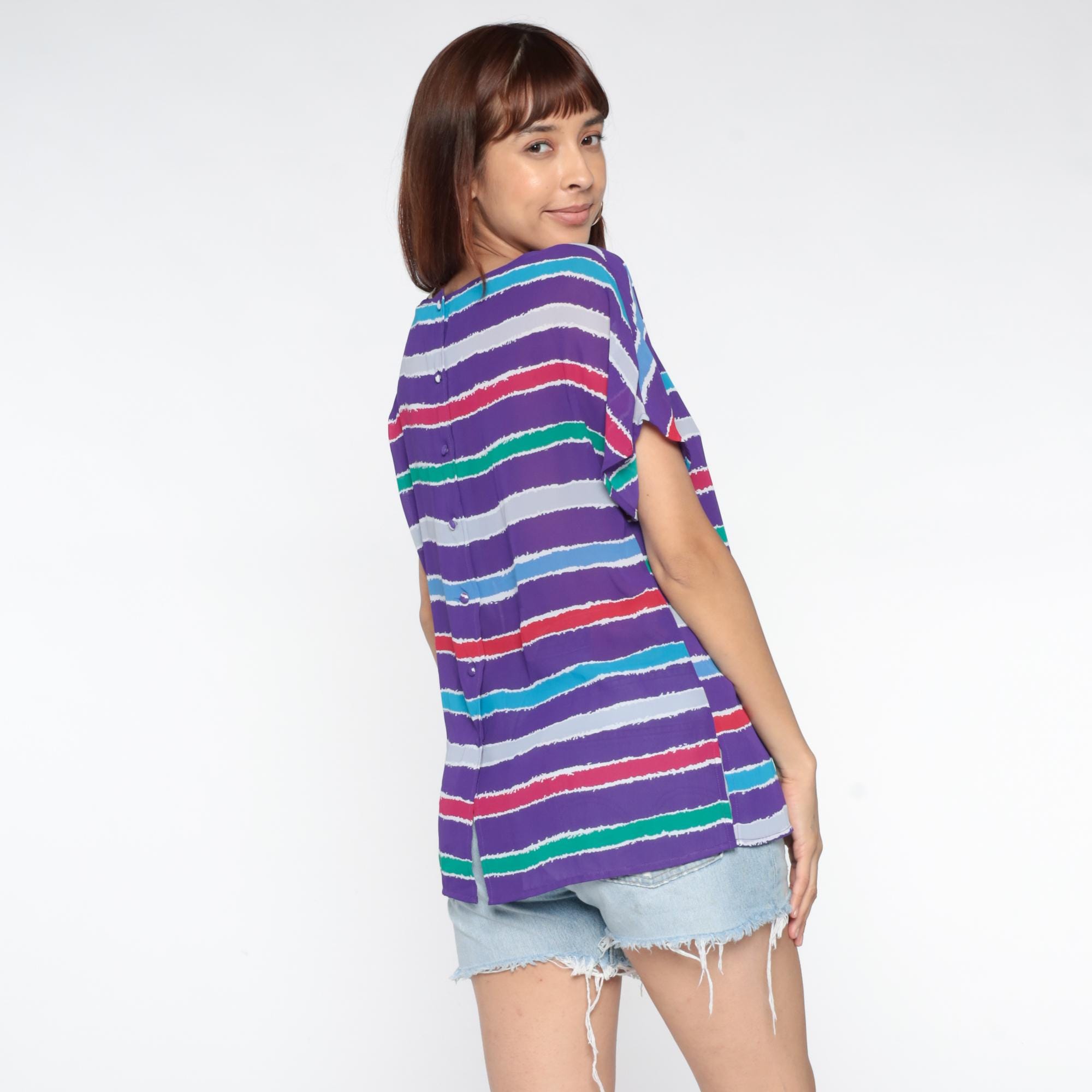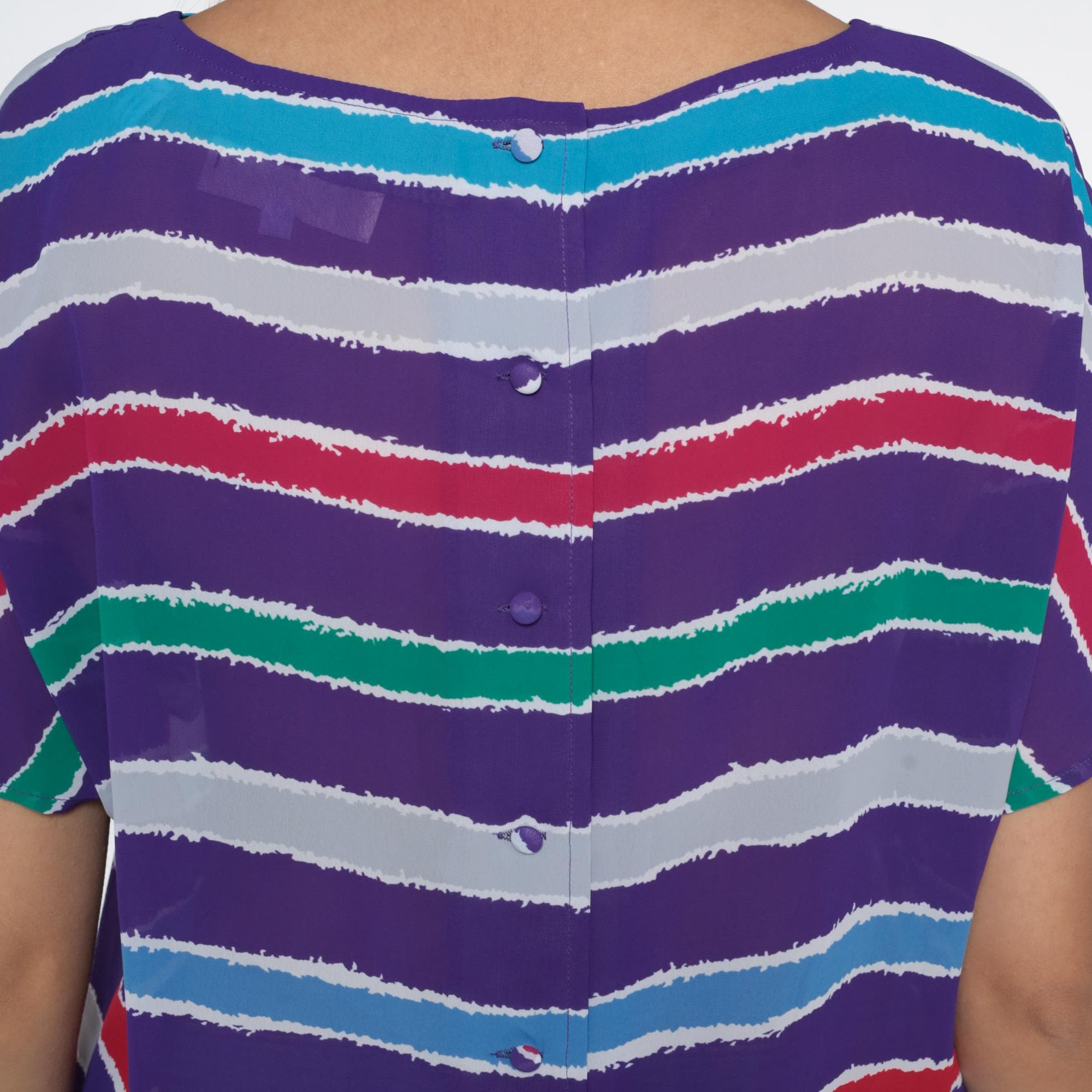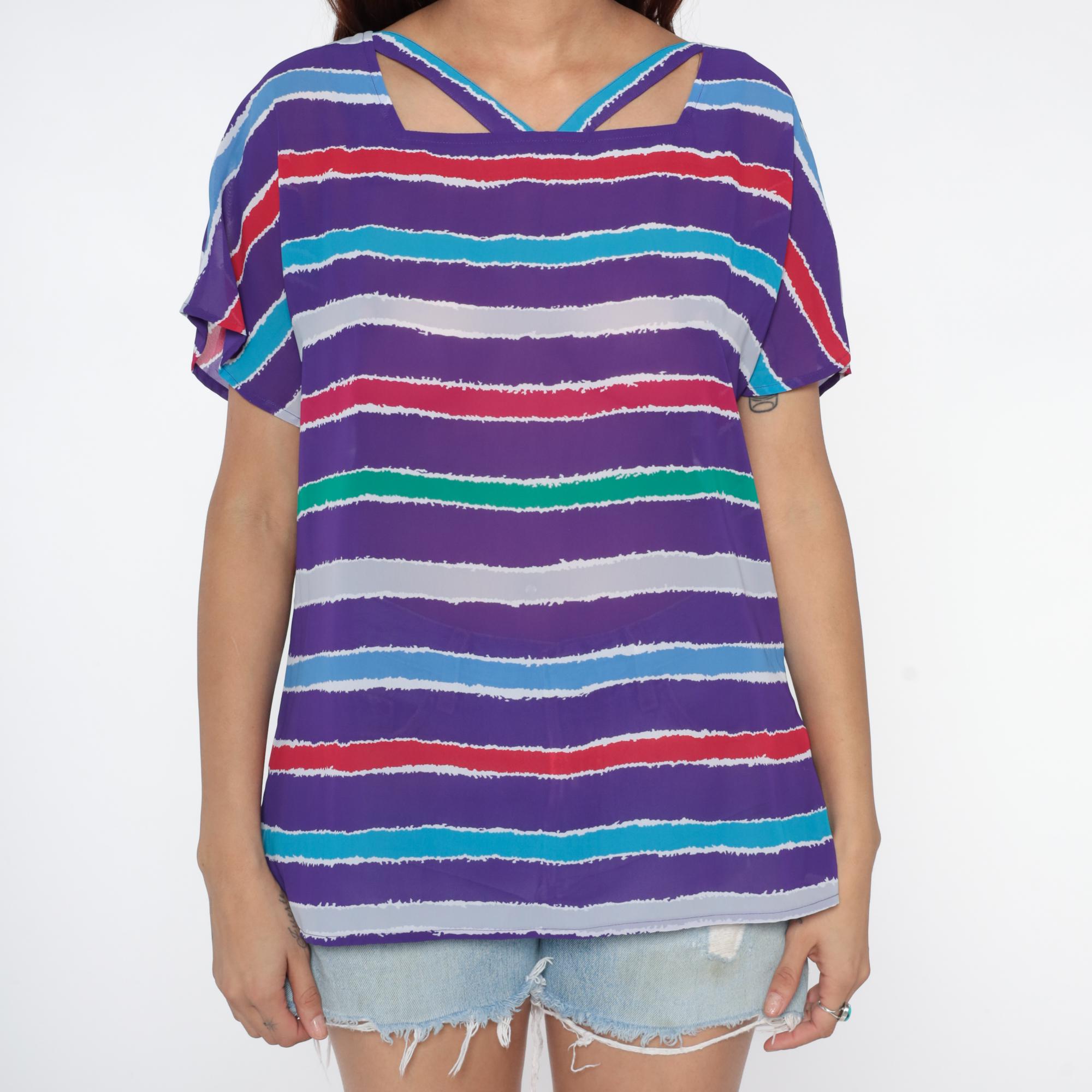 Purple striped top from the 80s with horizontal stripes in turquoise, red, white, green, and lavender across a purple base. Relaxed silhouette with short sleeves, cutout detail at the upper back neckline with crossing straps creating geometric openings.
