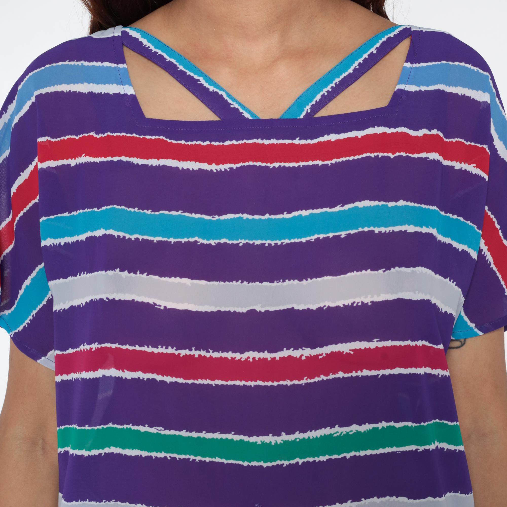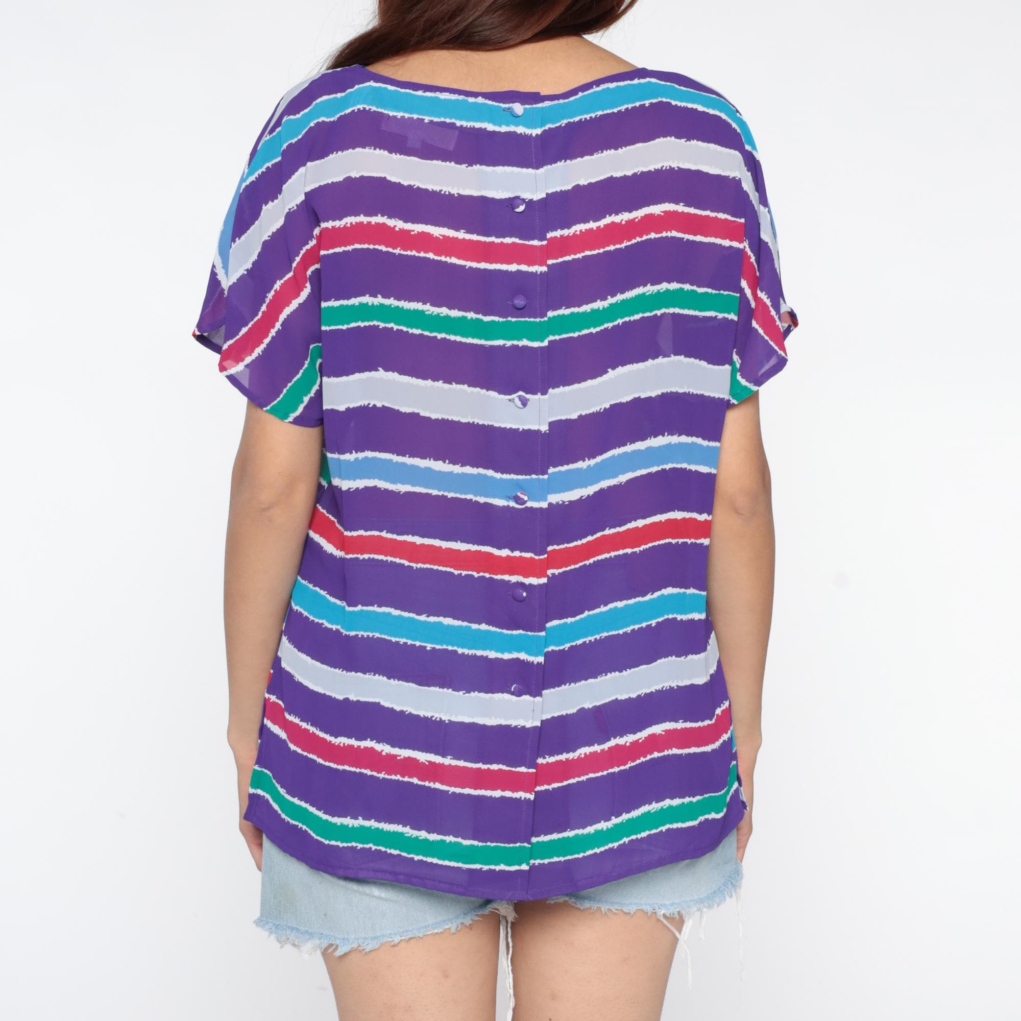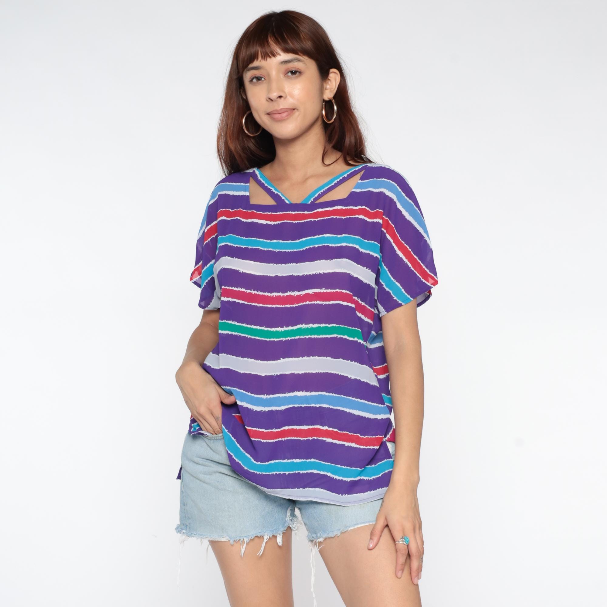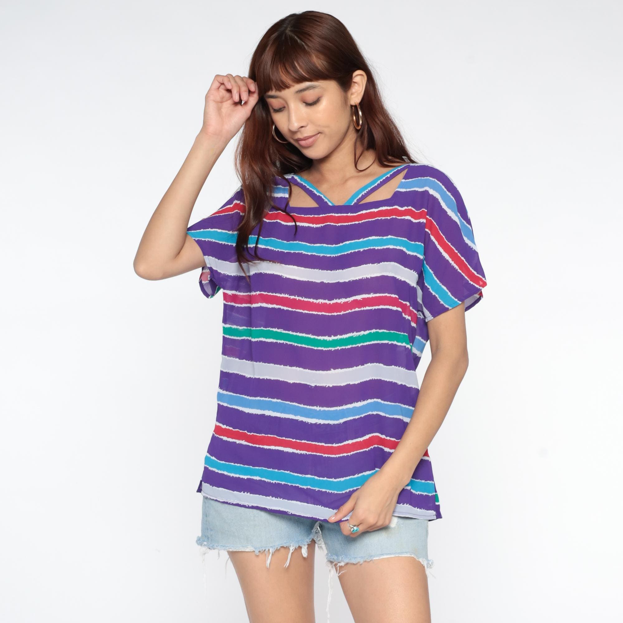 Purple striped top from the 80s with horizontal stripes in turquoise, red, white, green, and lavender across a purple base. Relaxed silhouette with short sleeves, cutout detail at the upper back neckline with crossing straps creating geometric openings.