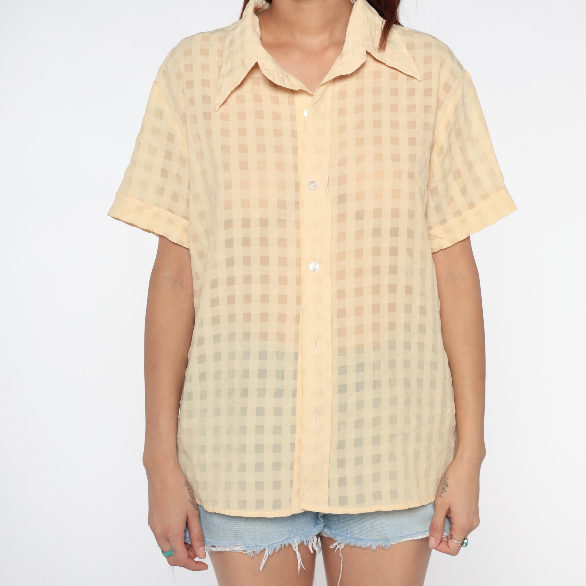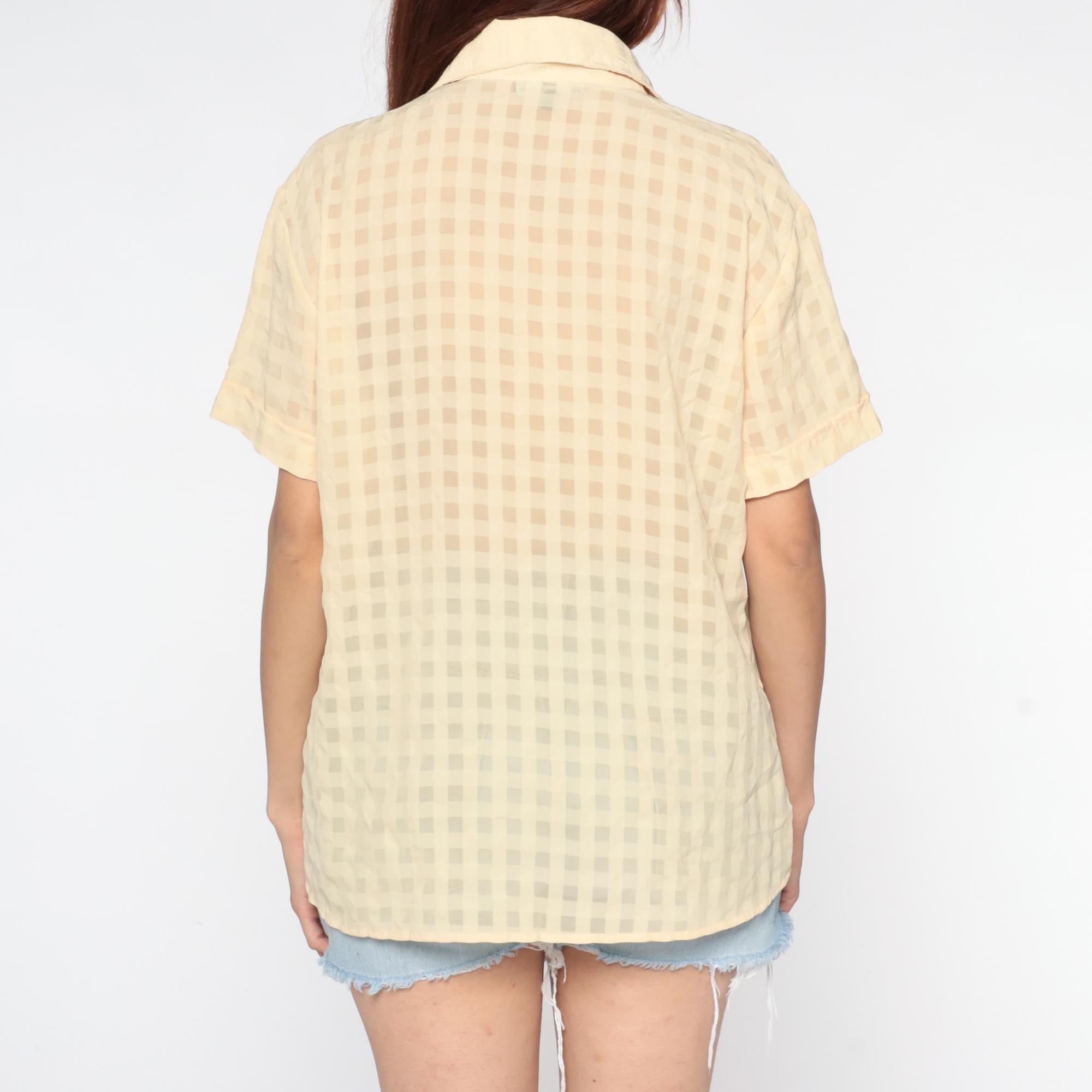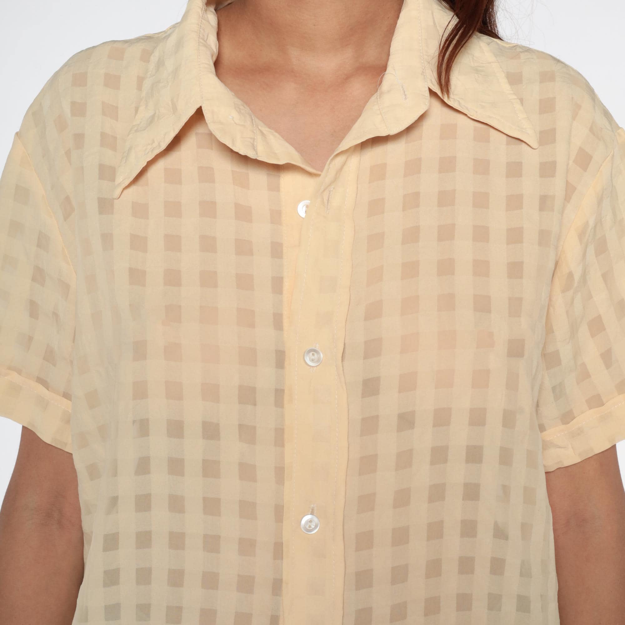 Cream gingham button-up shirt from the 90s by Denis Battochio. Short sleeves with classic collar and button front closure with white buttons. Boxy, relaxed fit through the body.