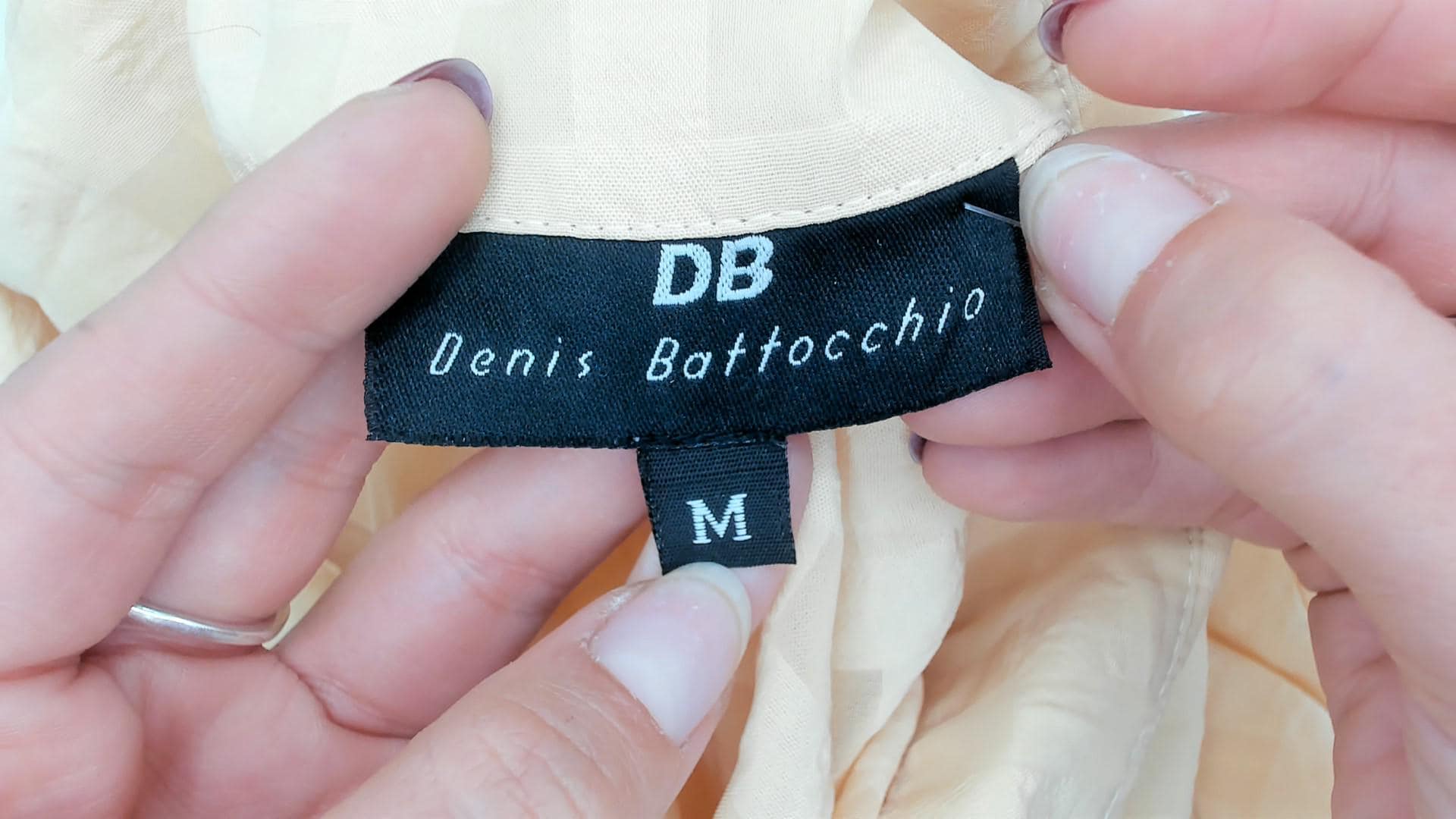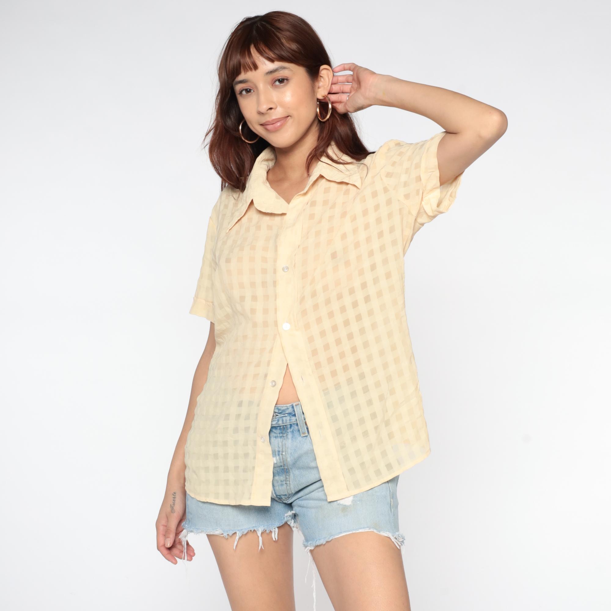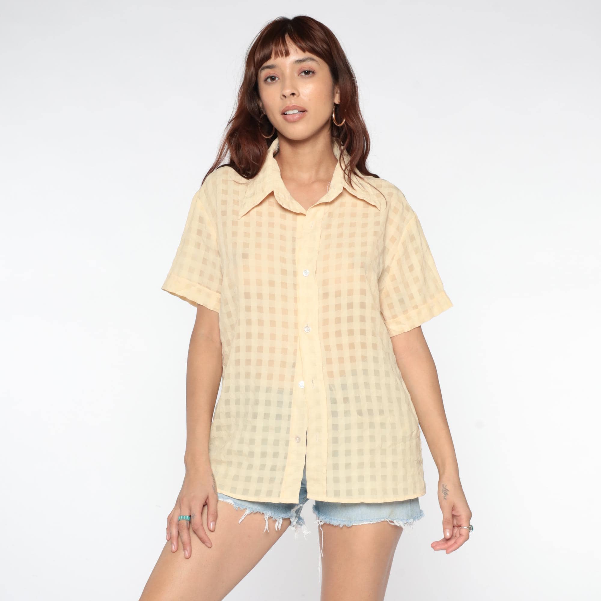 Cream gingham button-up shirt from the 90s by Denis Battochio. Short sleeves with classic collar and button front closure with white buttons. Boxy, relaxed fit through the body.