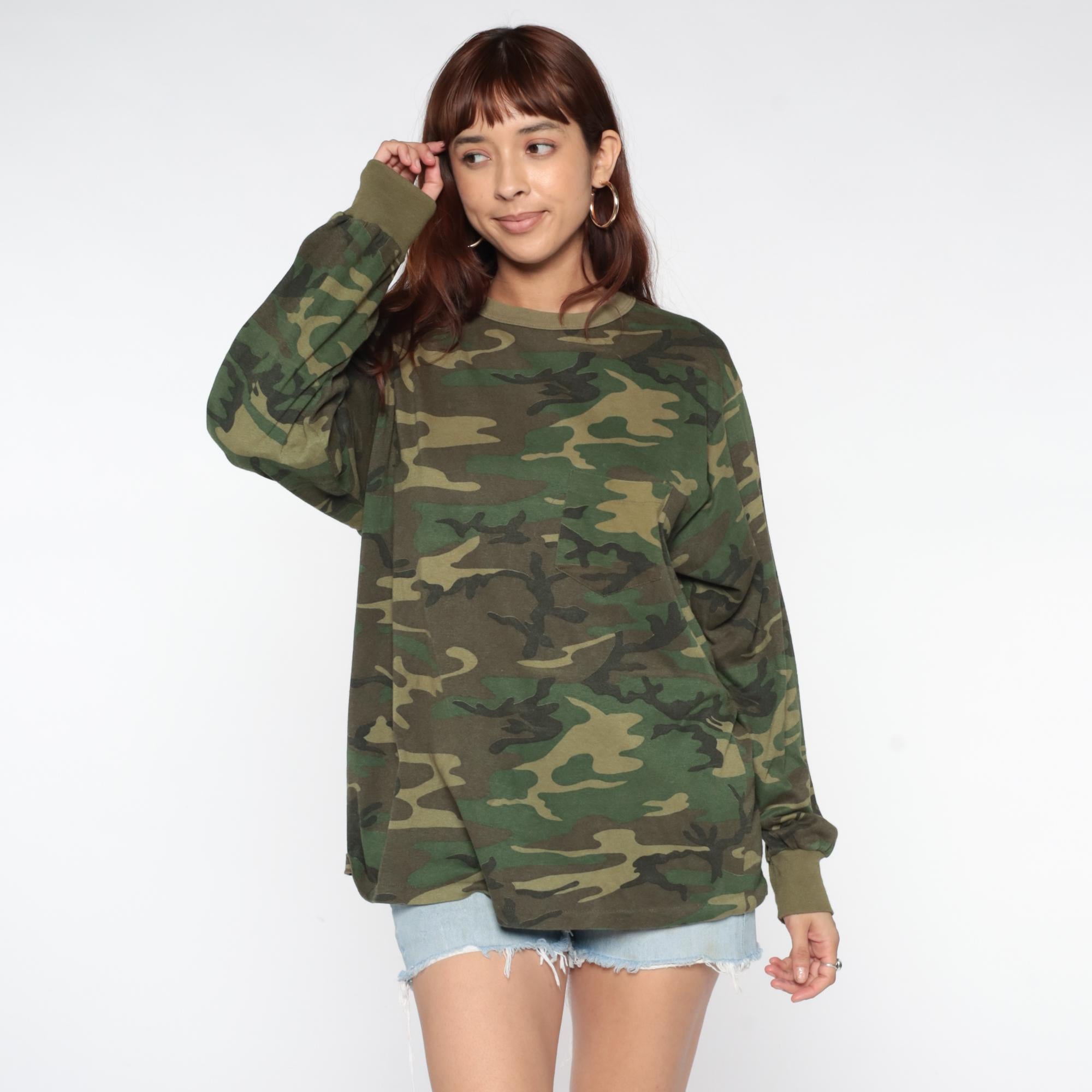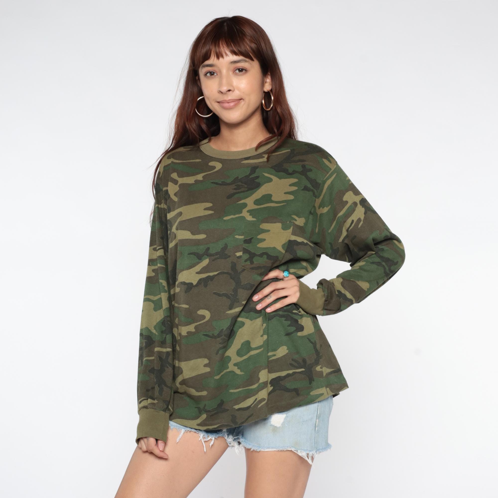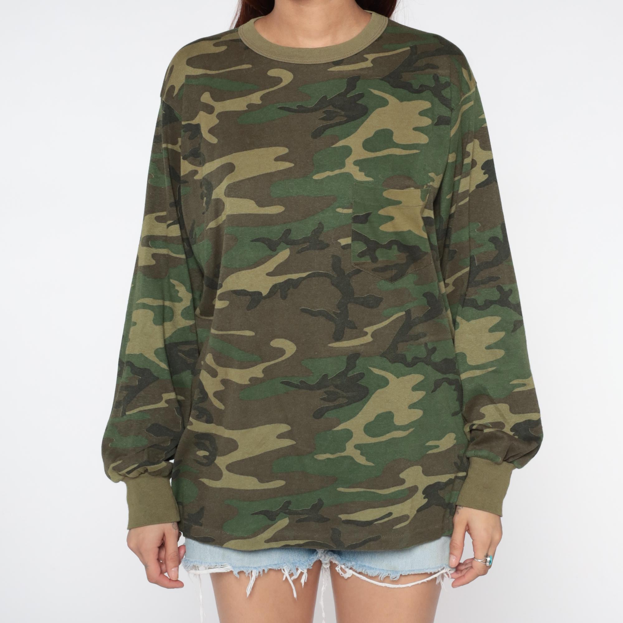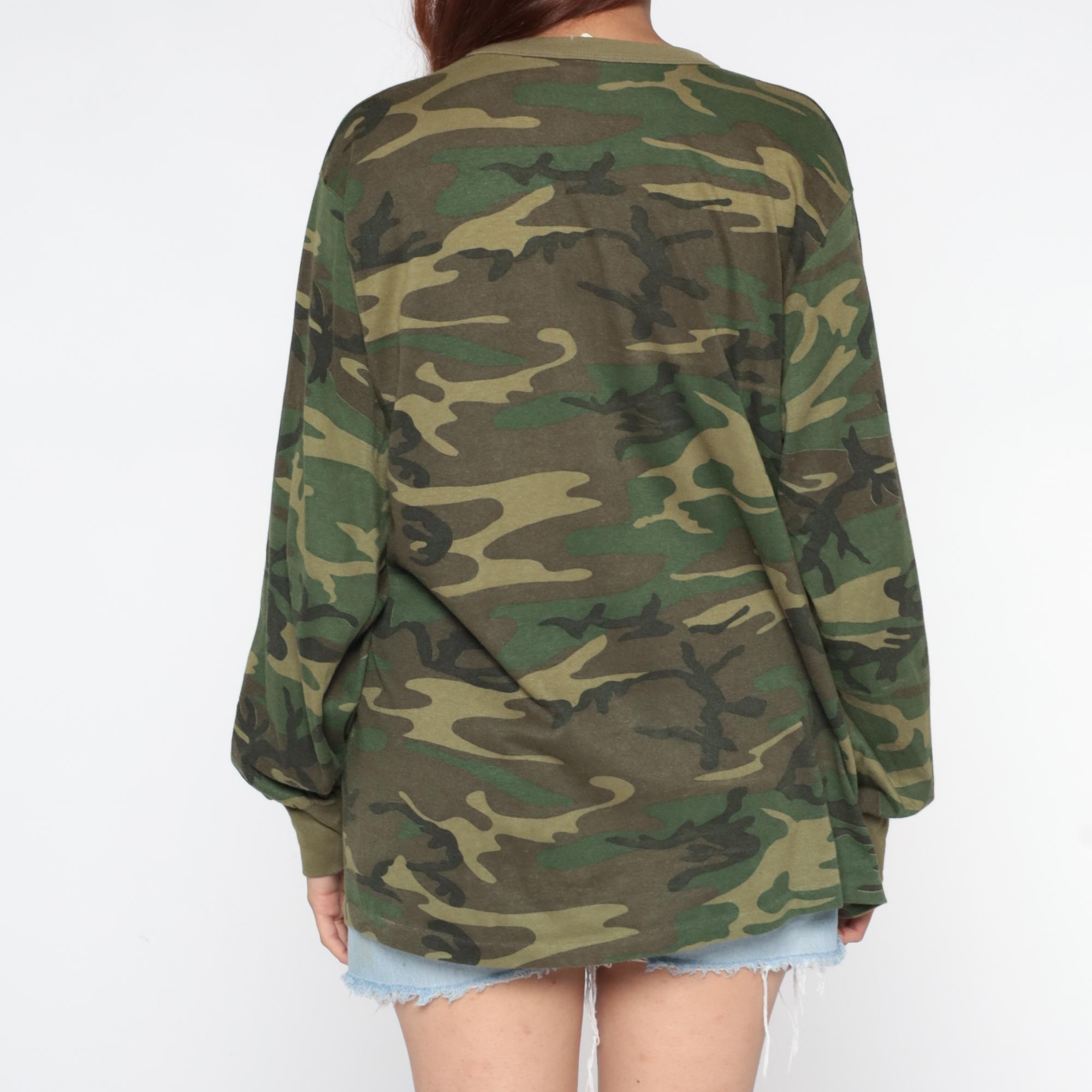 Vintage 90s camouflage long sleeve top from Crafted with Pride in America. Woodland camo print in green, brown, tan, and black across the fabric. Crew neckline and long sleeves with ribbed cuffs and hem.