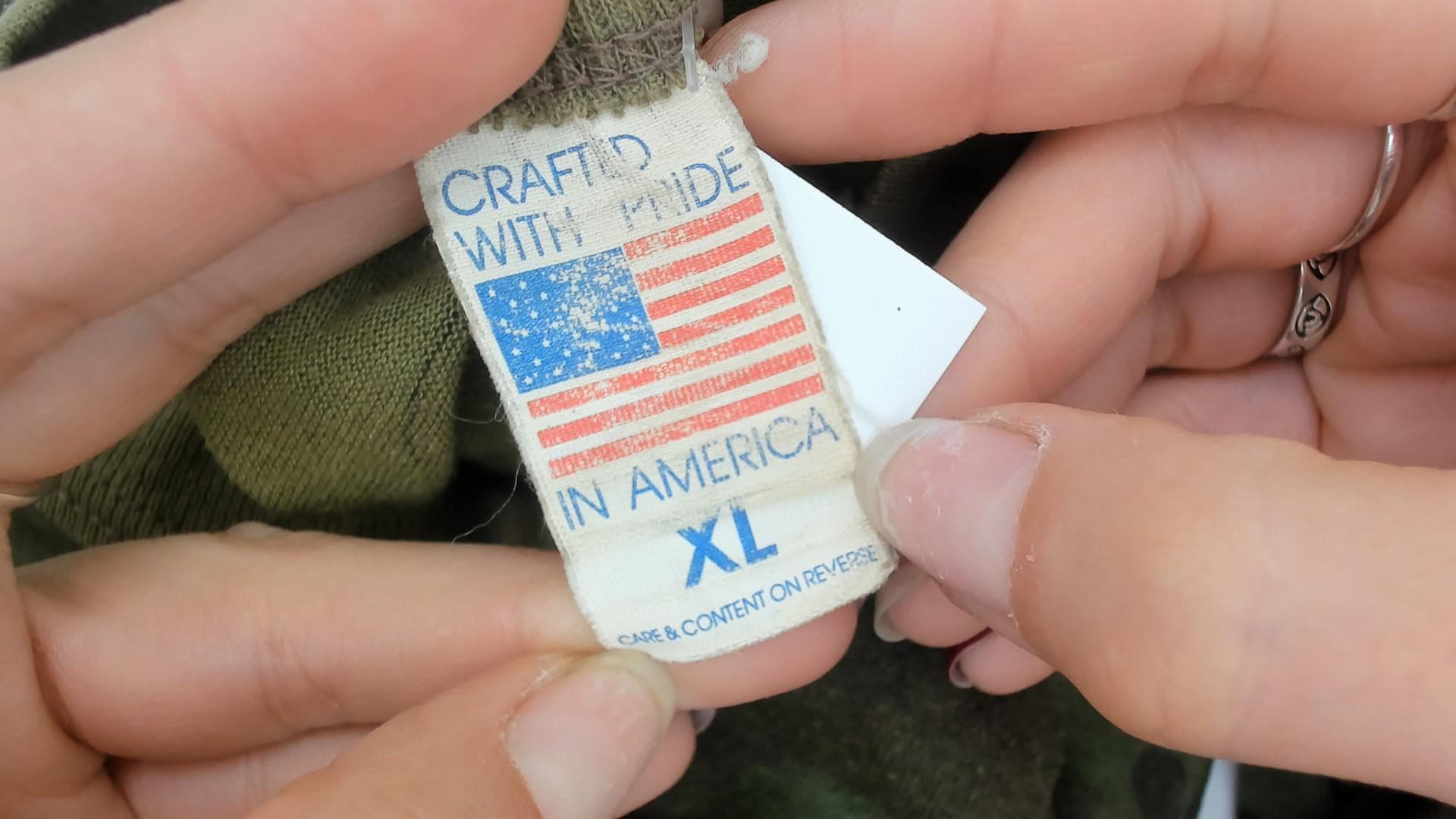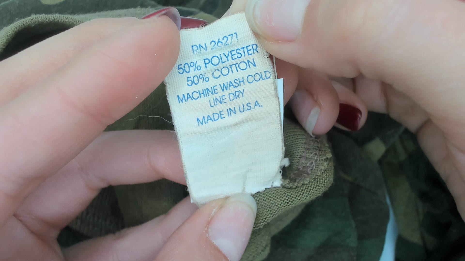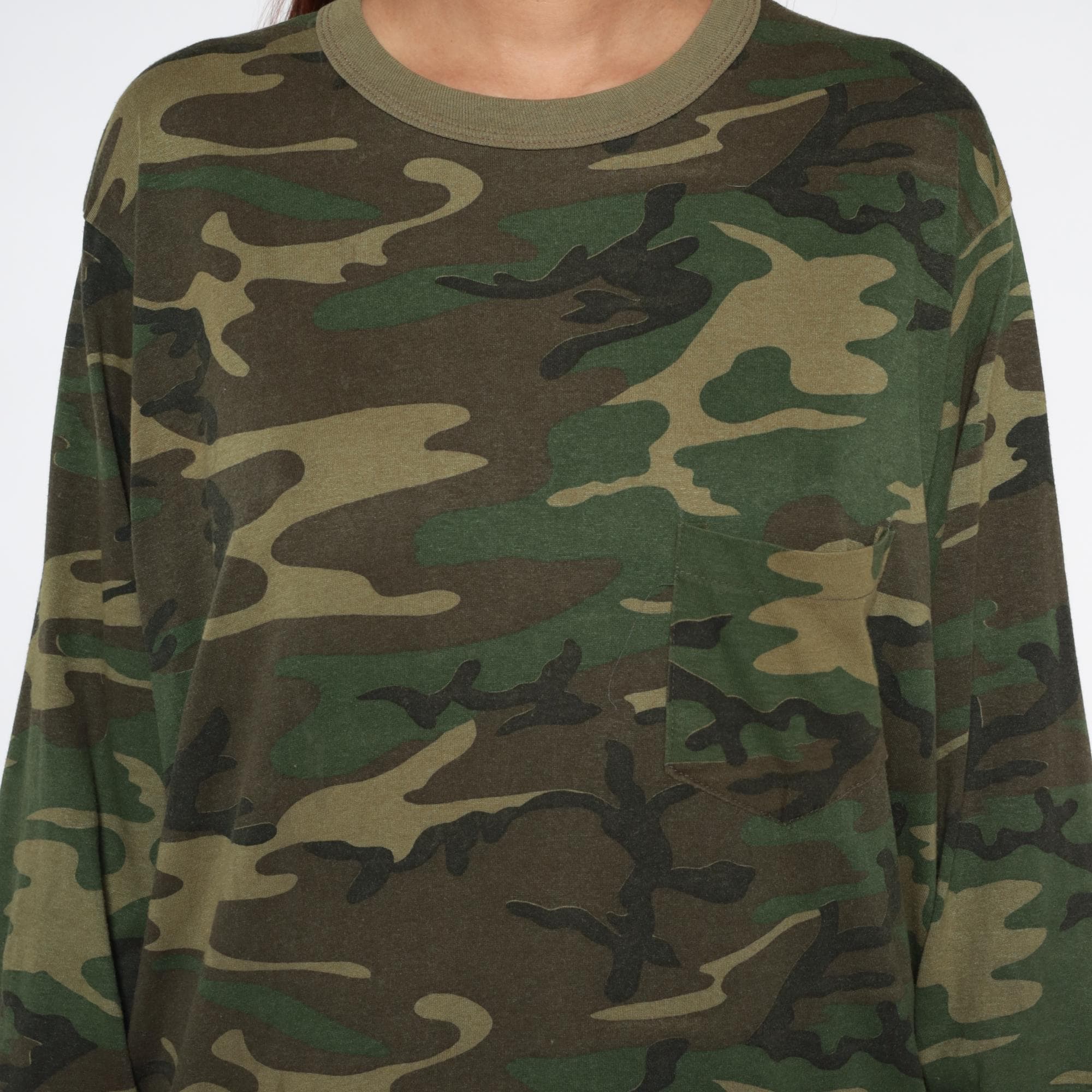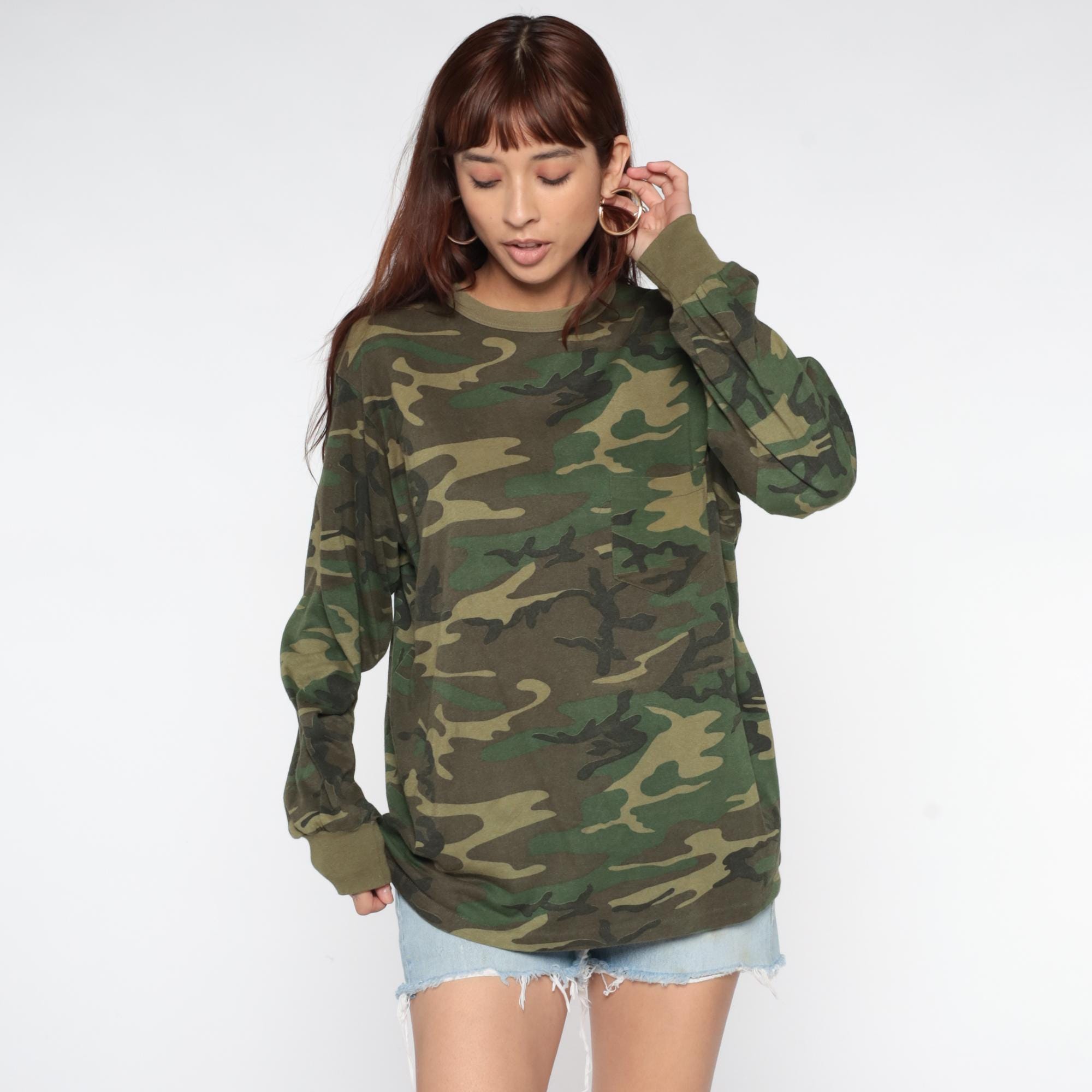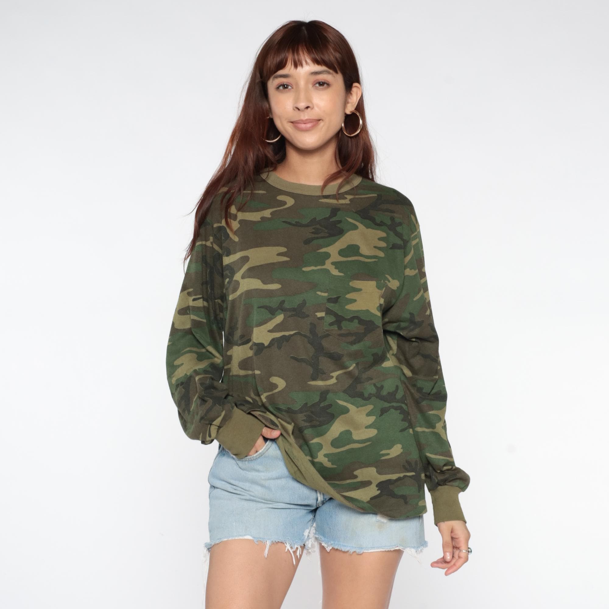 Vintage 90s camouflage long sleeve top from Crafted with Pride in America. Woodland camo print in green, brown, tan, and black across the fabric. Crew neckline and long sleeves with ribbed cuffs and hem.