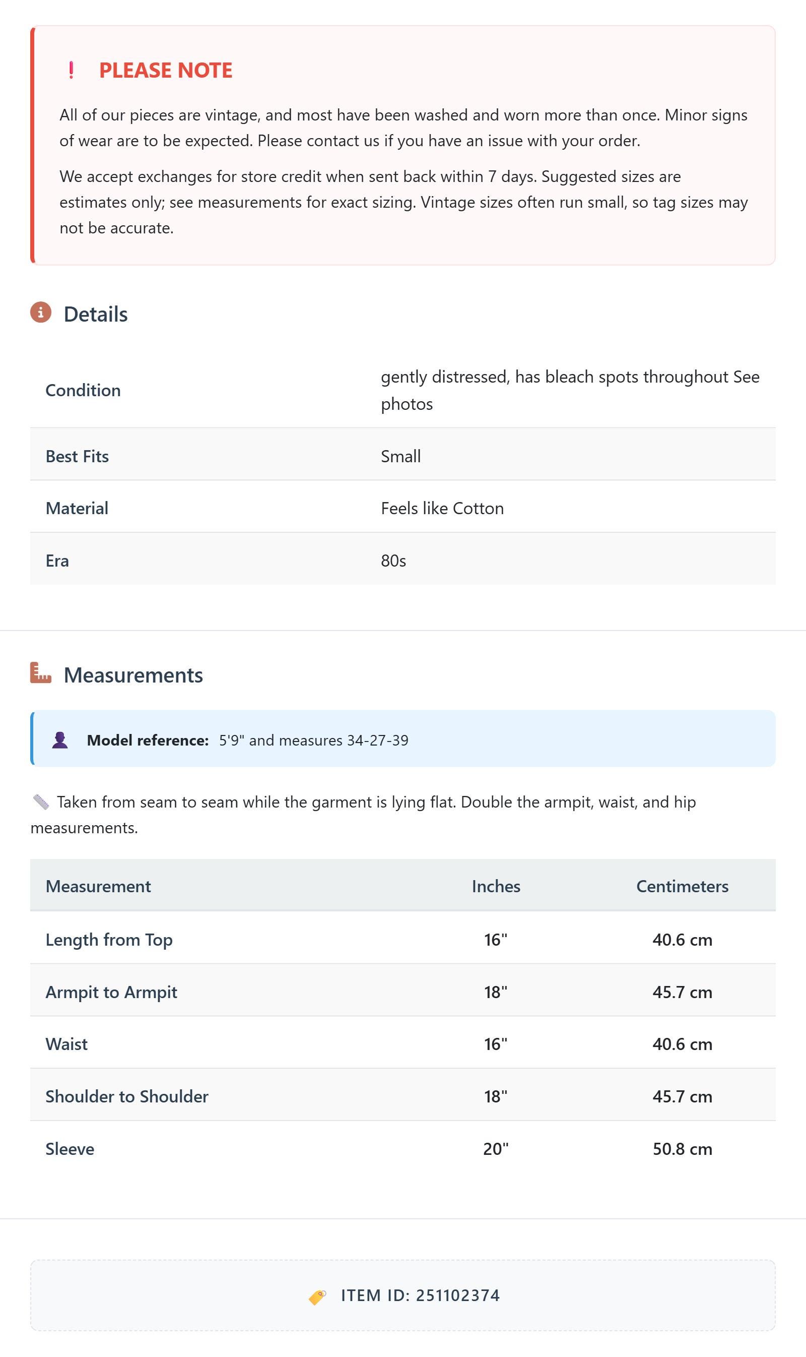 All of our pieces are vintage, and most have been washed and worn more than once. Minor signs of wear are to be expected. Please contact us if you have an issue with your order. We accept exchanges for store credit when sent back within 7 days.