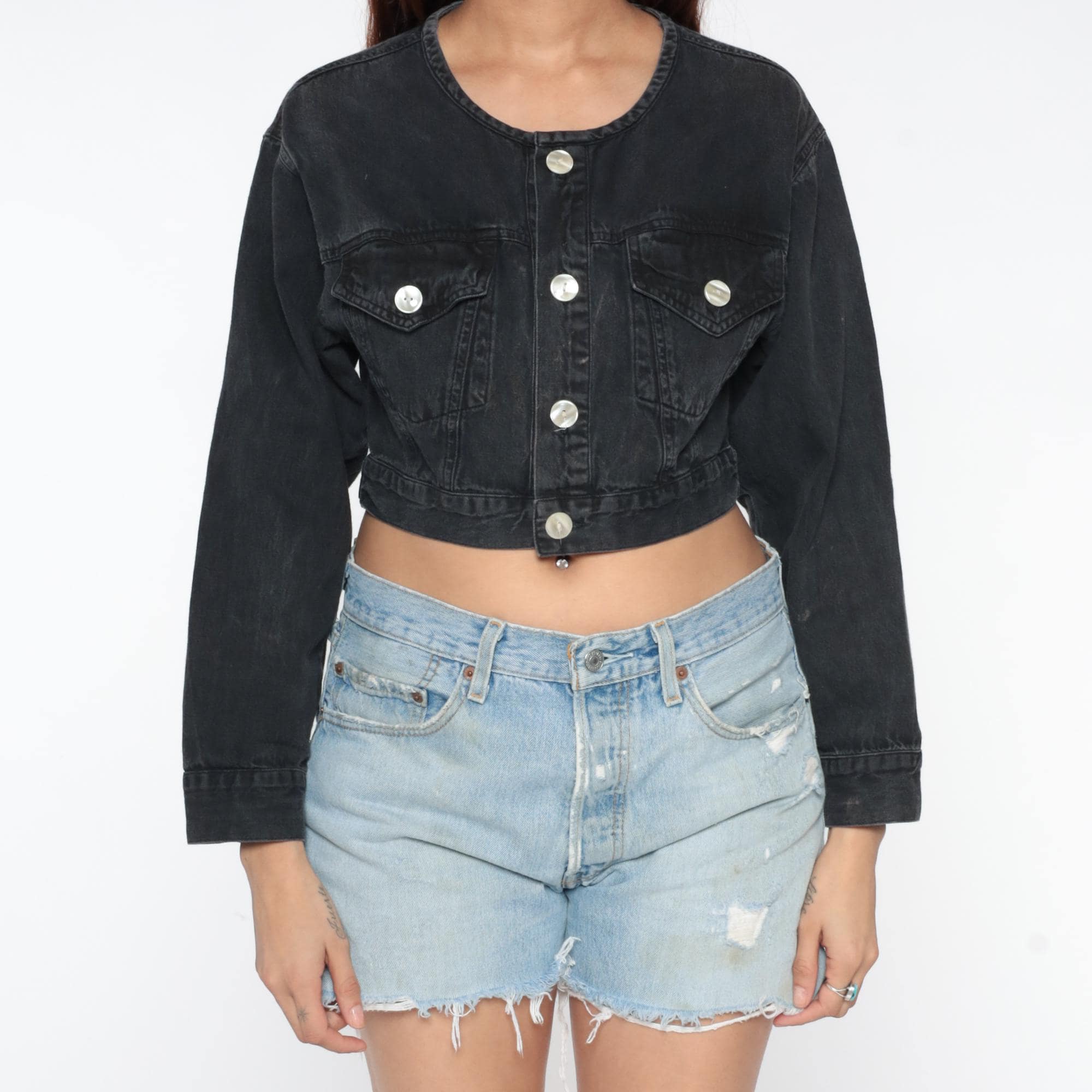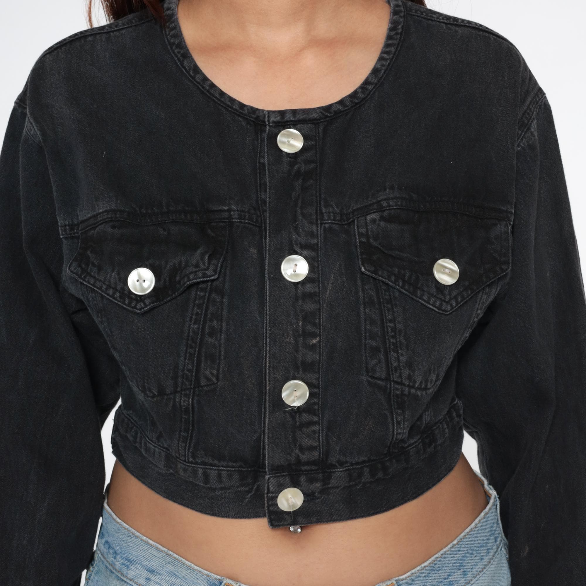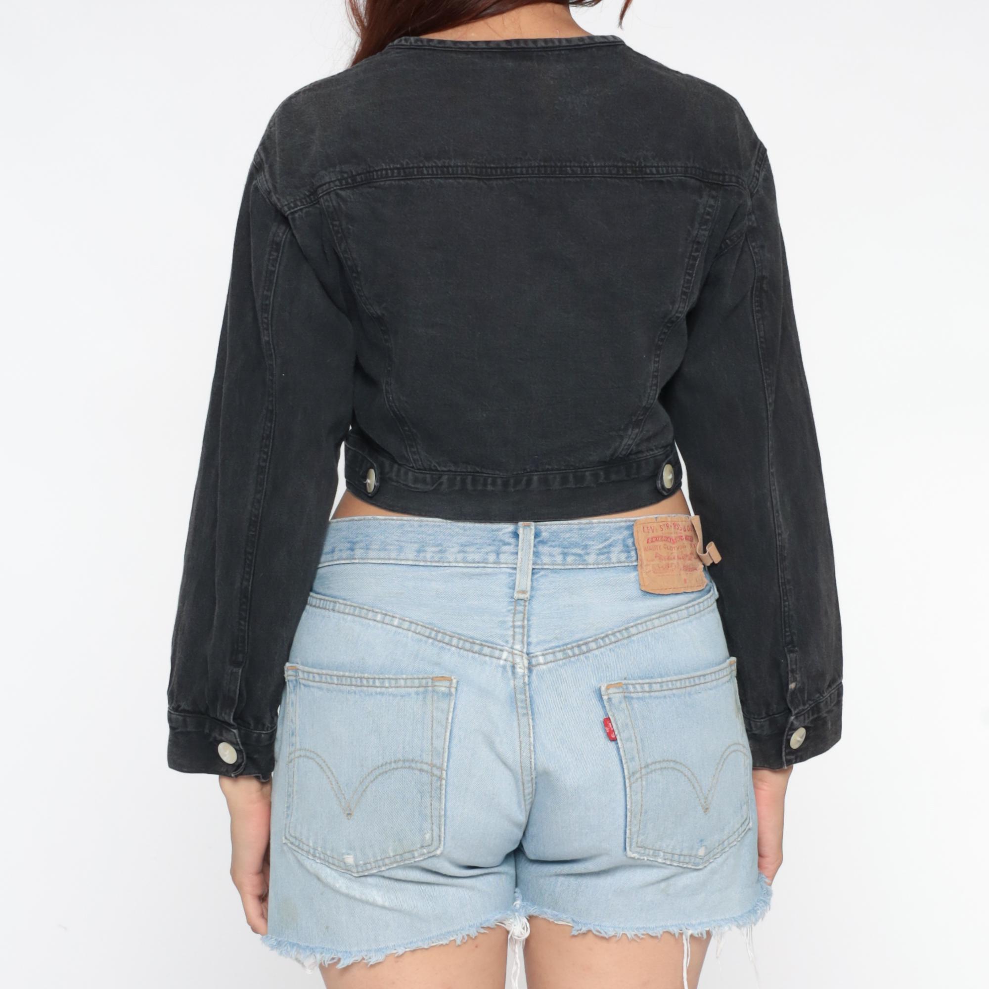 Black denim jacket from the 80s with cropped, fitted silhouette and slightly distressed finish with bleach spots throughout. Round collarless neckline with button front closure and long sleeves with button cuffs. Two chest pockets with button flaps and adjustable button tabs at the waist.