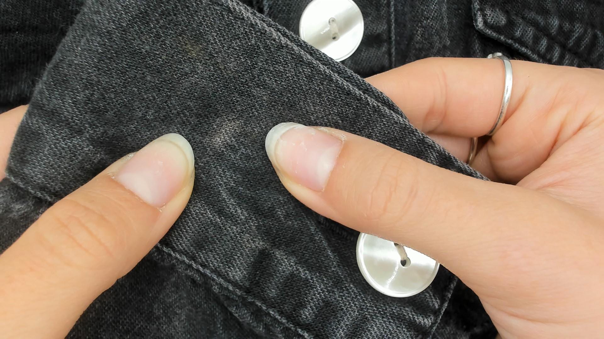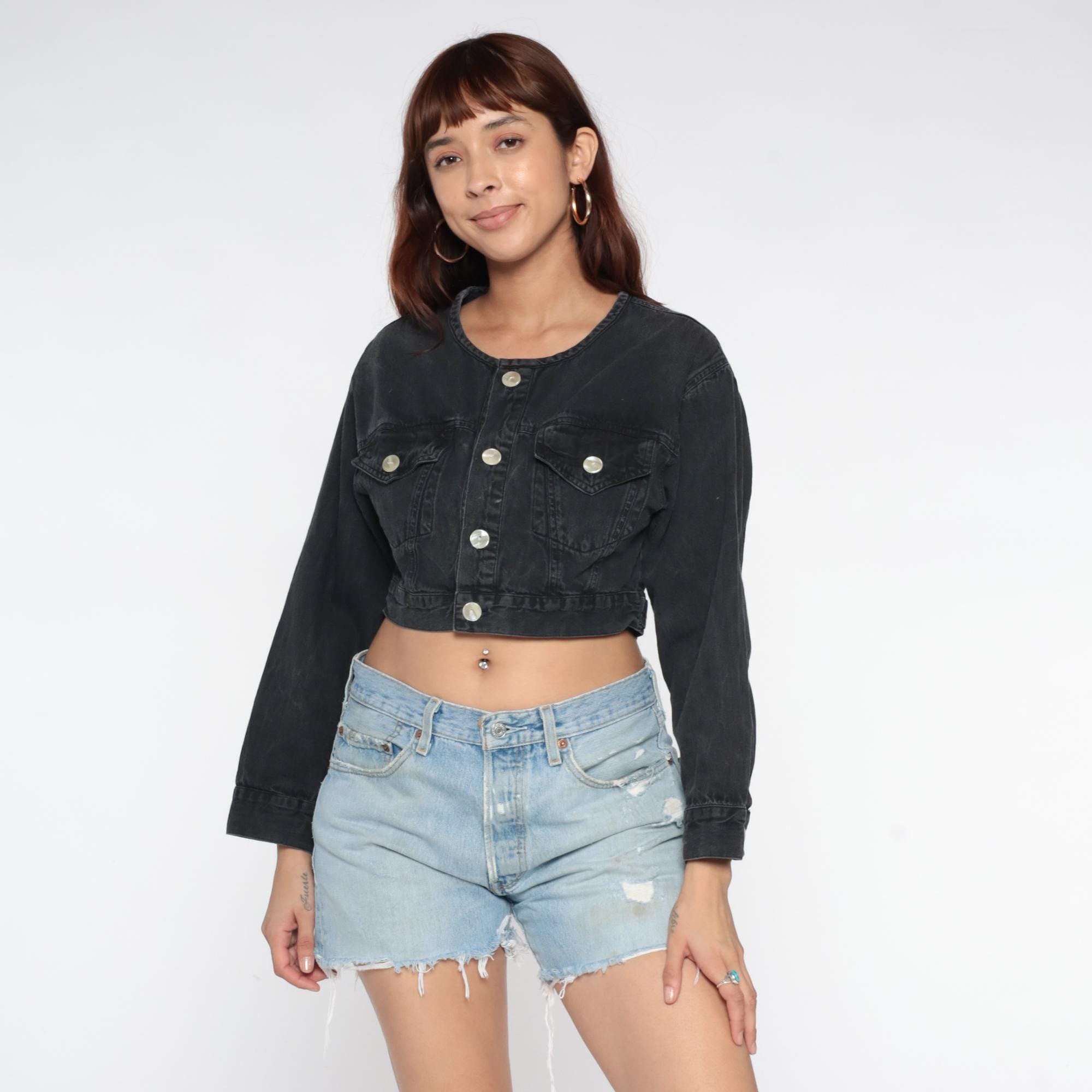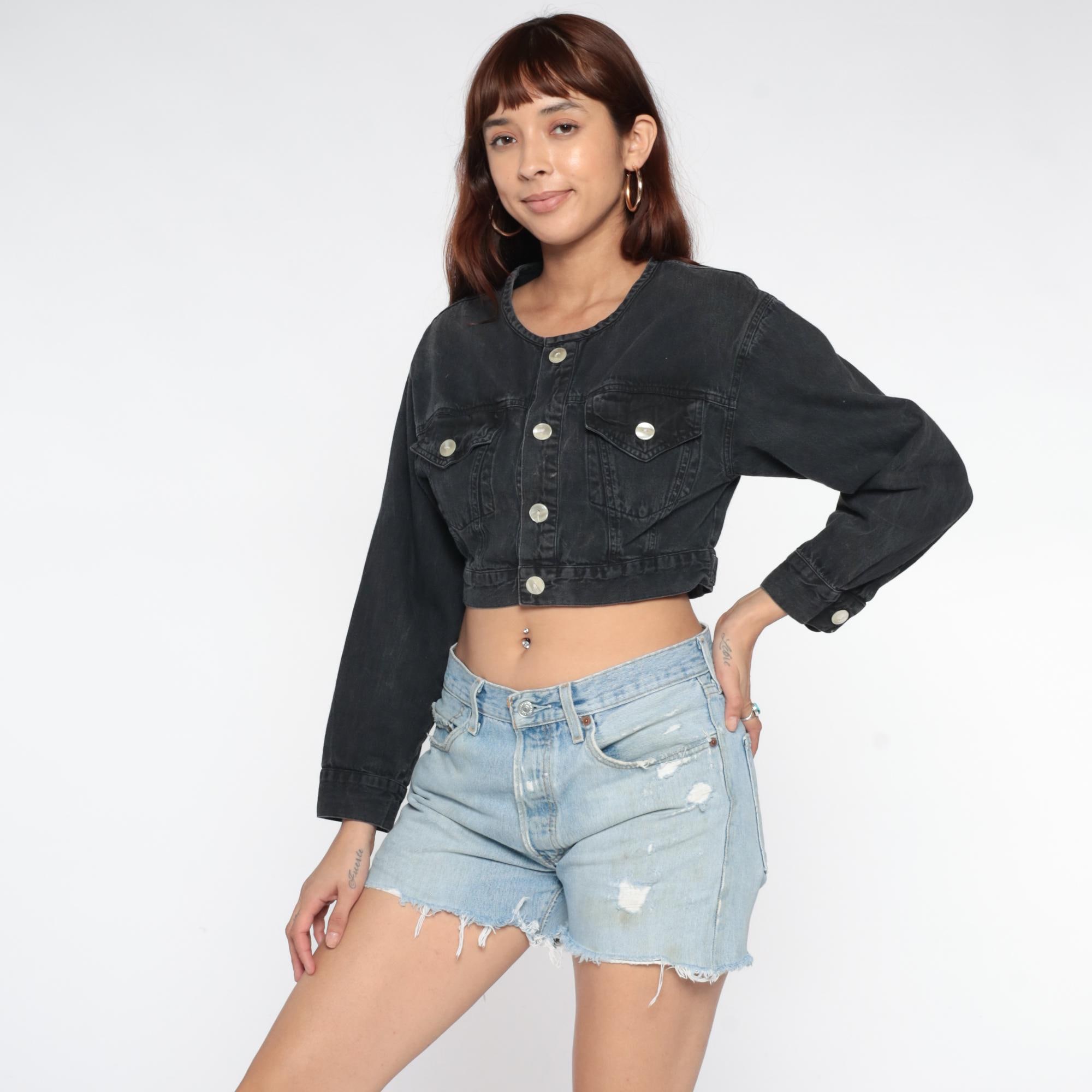 Black denim jacket from the 80s with cropped, fitted silhouette and slightly distressed finish with bleach spots throughout. Round collarless neckline with button front closure and long sleeves with button cuffs. Two chest pockets with button flaps and adjustable button tabs at the waist.