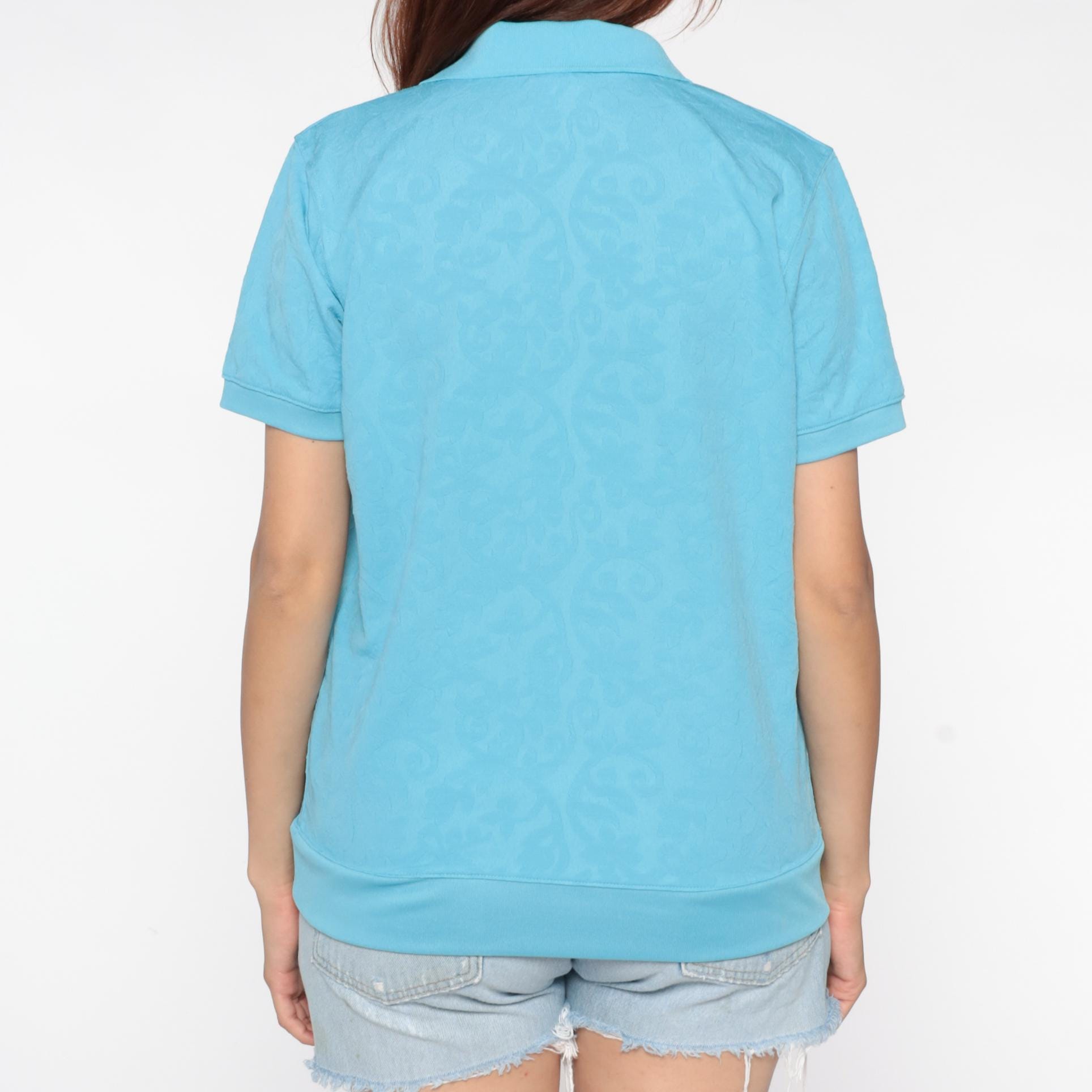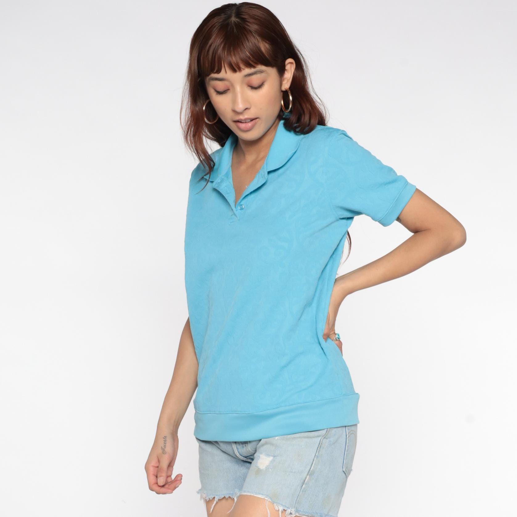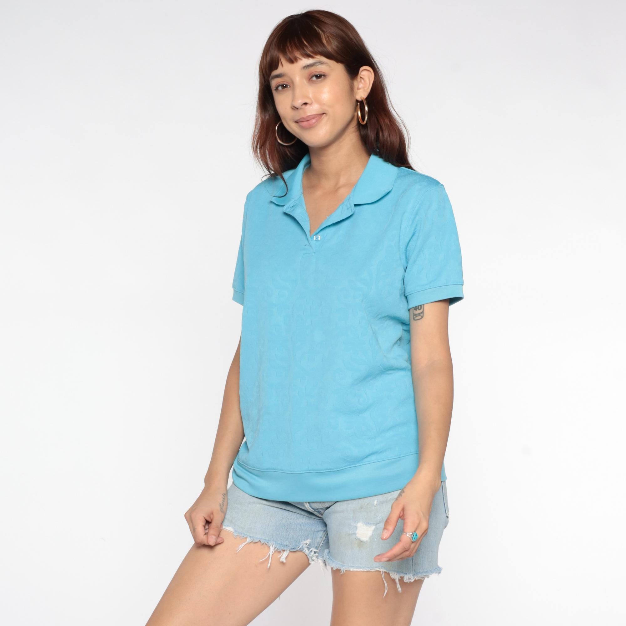Aqua blue polo top from the 90s with collared neckline and three-button placket. Short sleeves with rolled cuffs and banded hem. Has a faint paisley print.