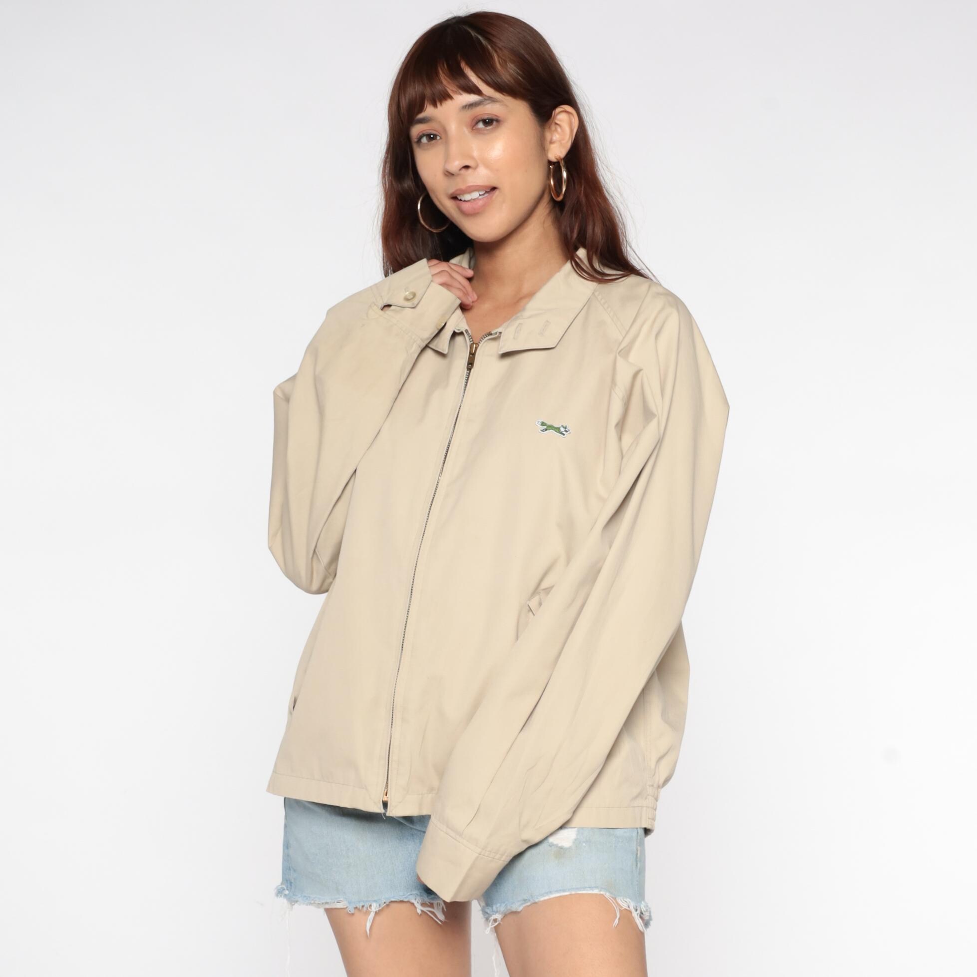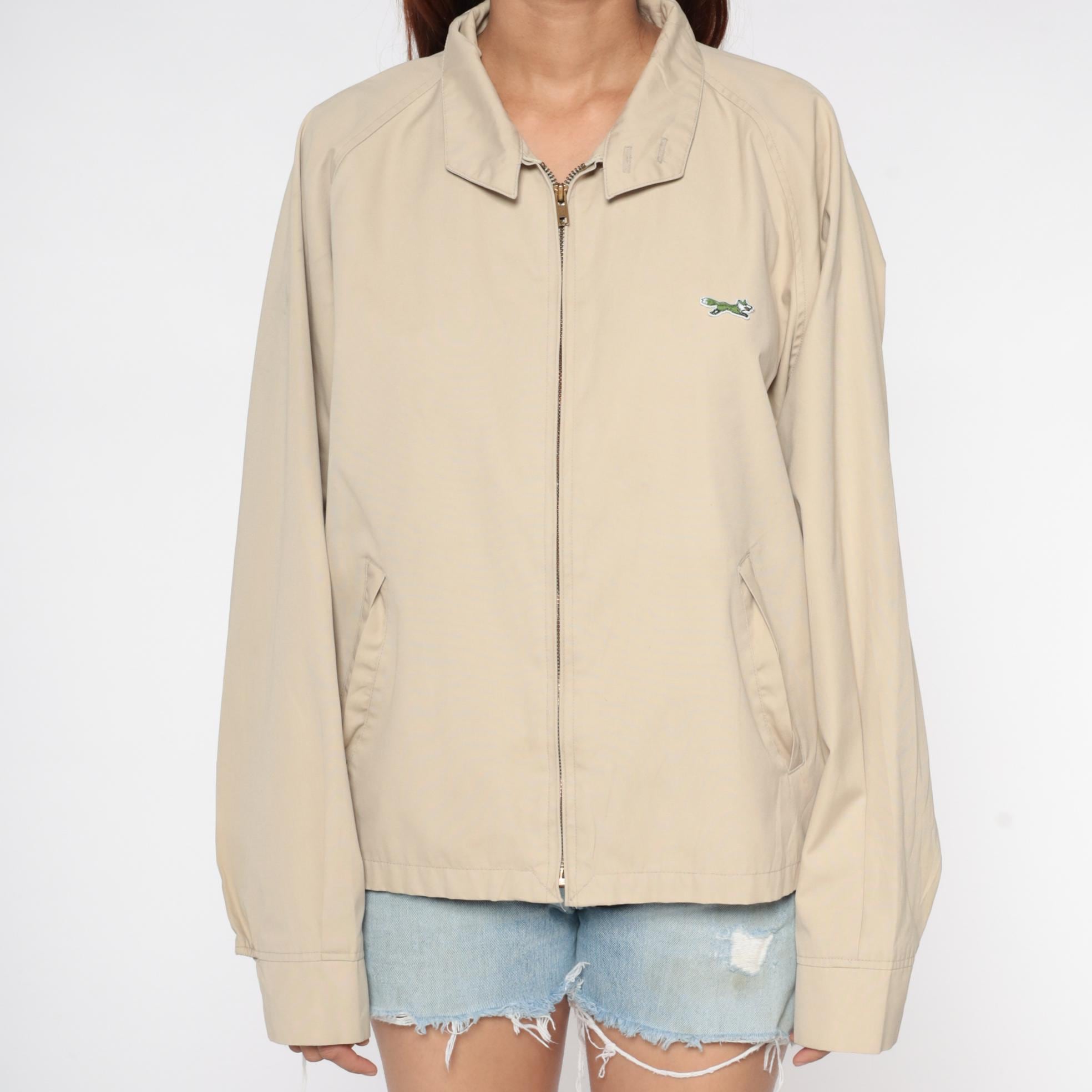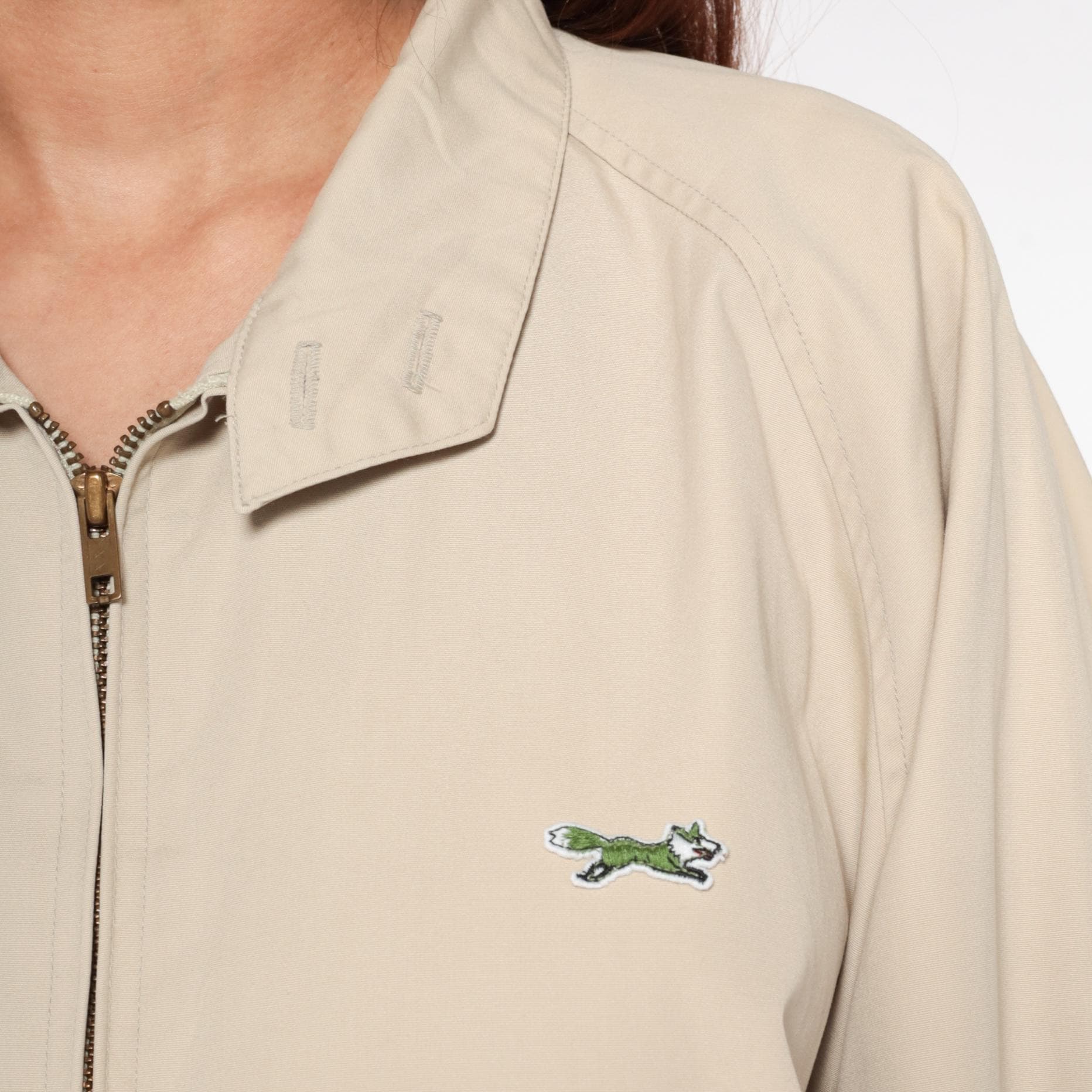 Beige zip-up jacket from the 80s with pointed collar and raglan sleeves. Front zip closure with visible zipper pull and small embroidered fox logo on the left chest. Elastic gathered hem and cuffs.