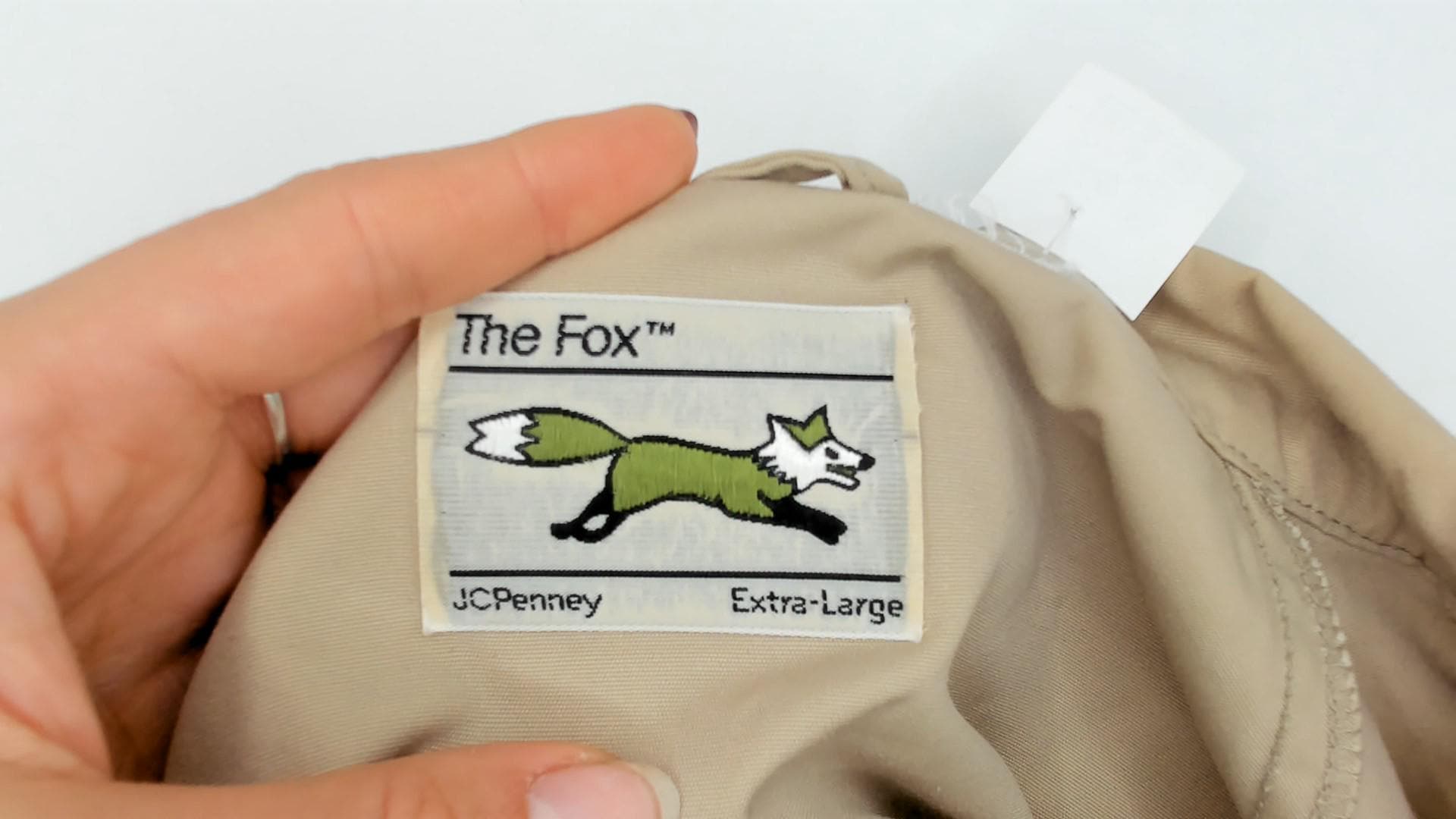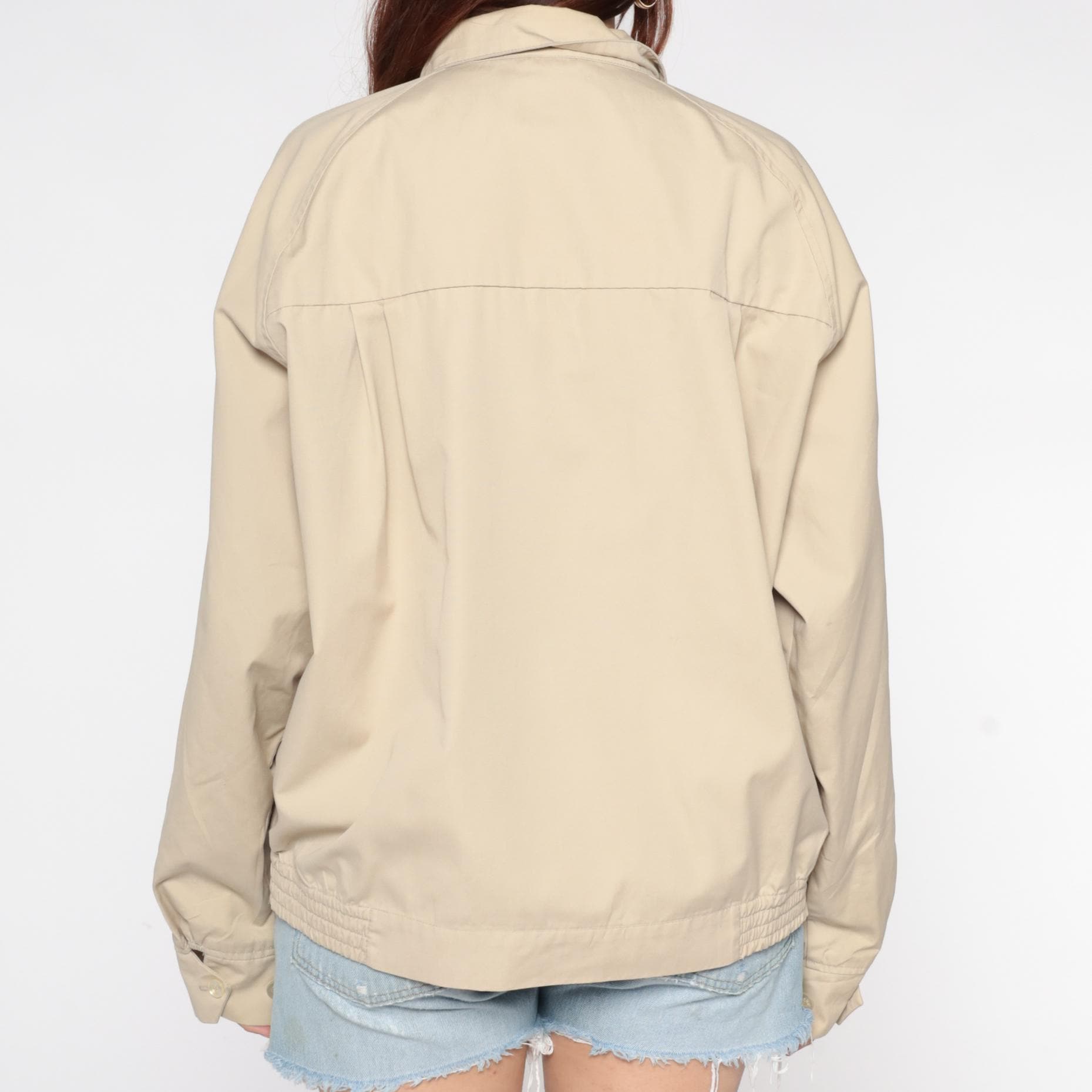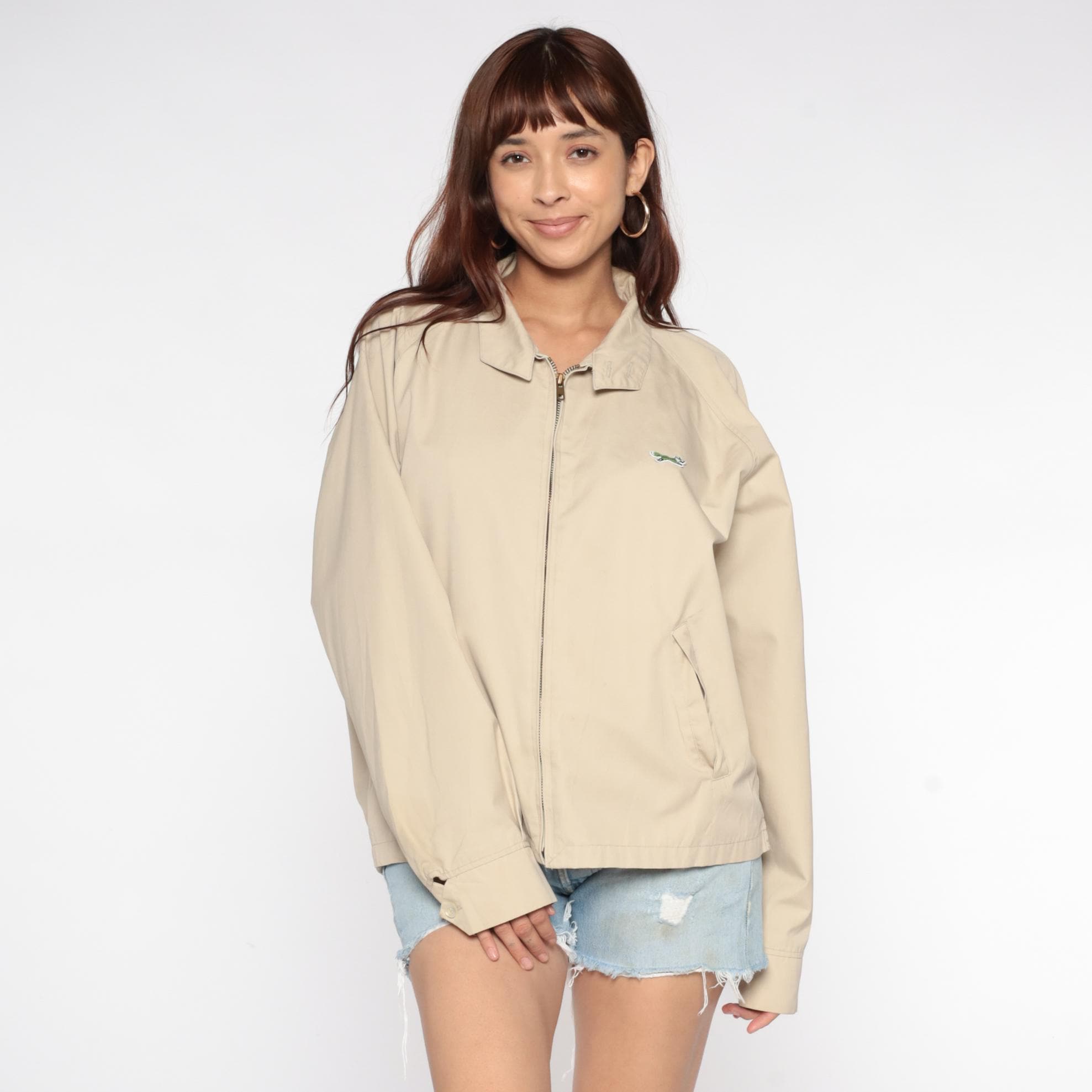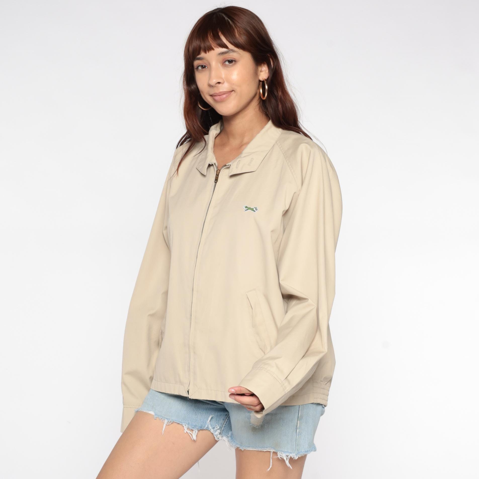 Beige zip-up jacket from the 80s with pointed collar and raglan sleeves. Front zip closure with visible zipper pull and small embroidered fox logo on the left chest. Elastic gathered hem and cuffs.