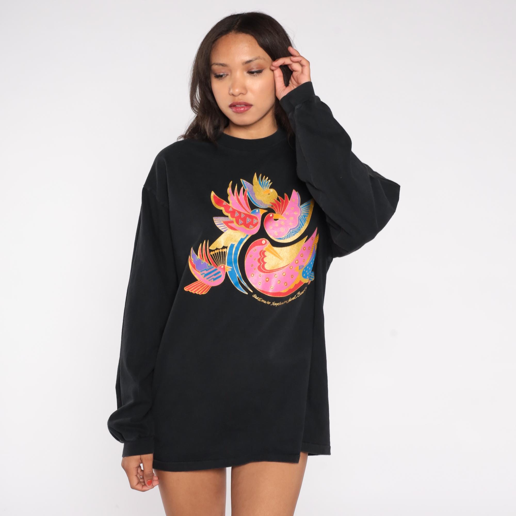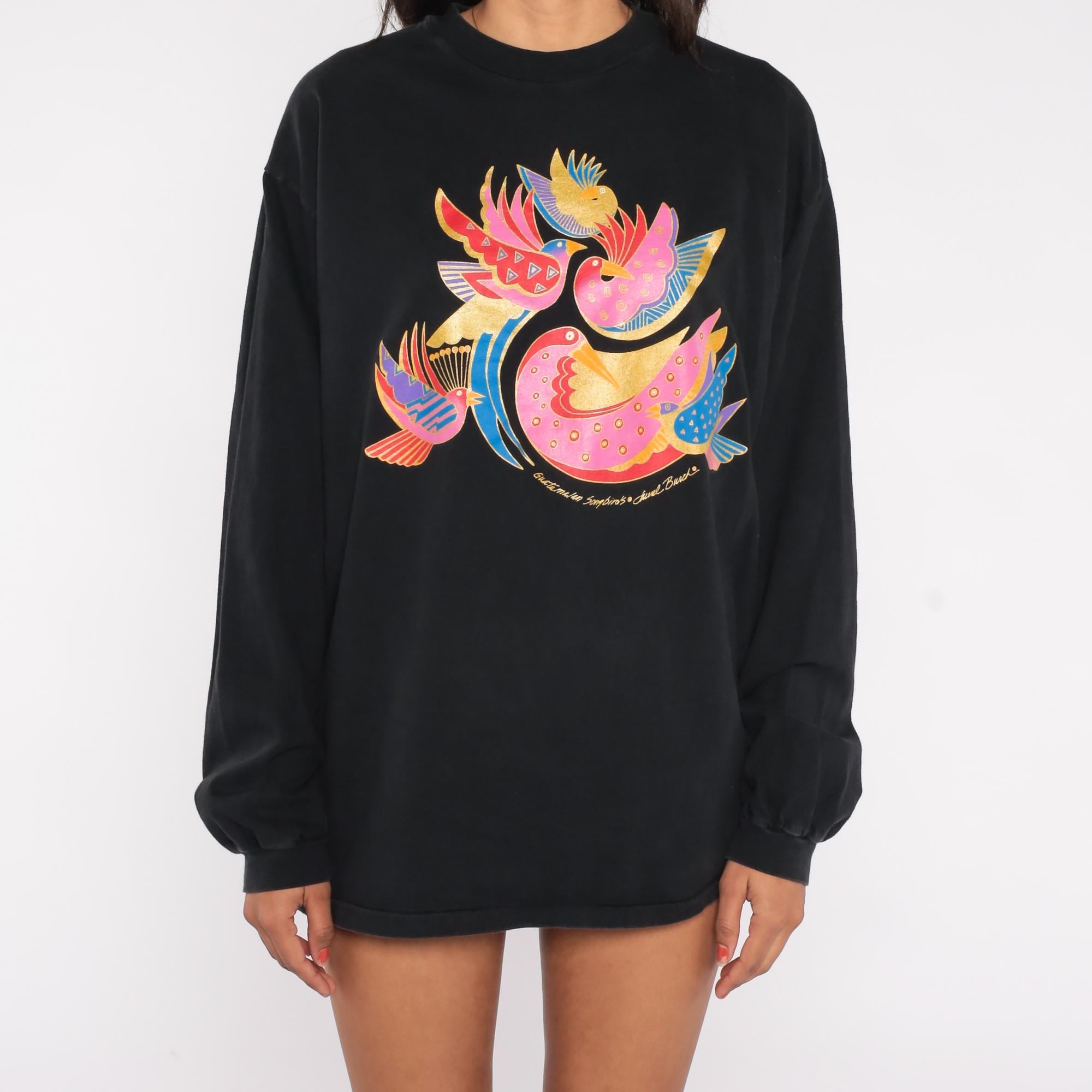 90s black shirt from Laurel Burch with colorful bird graphic across the front. Three stylized birds in pink, yellow, red, and blue with decorative patterns and gold metallic accents. Long sleeves with ribbed cuffs and crew neckline.