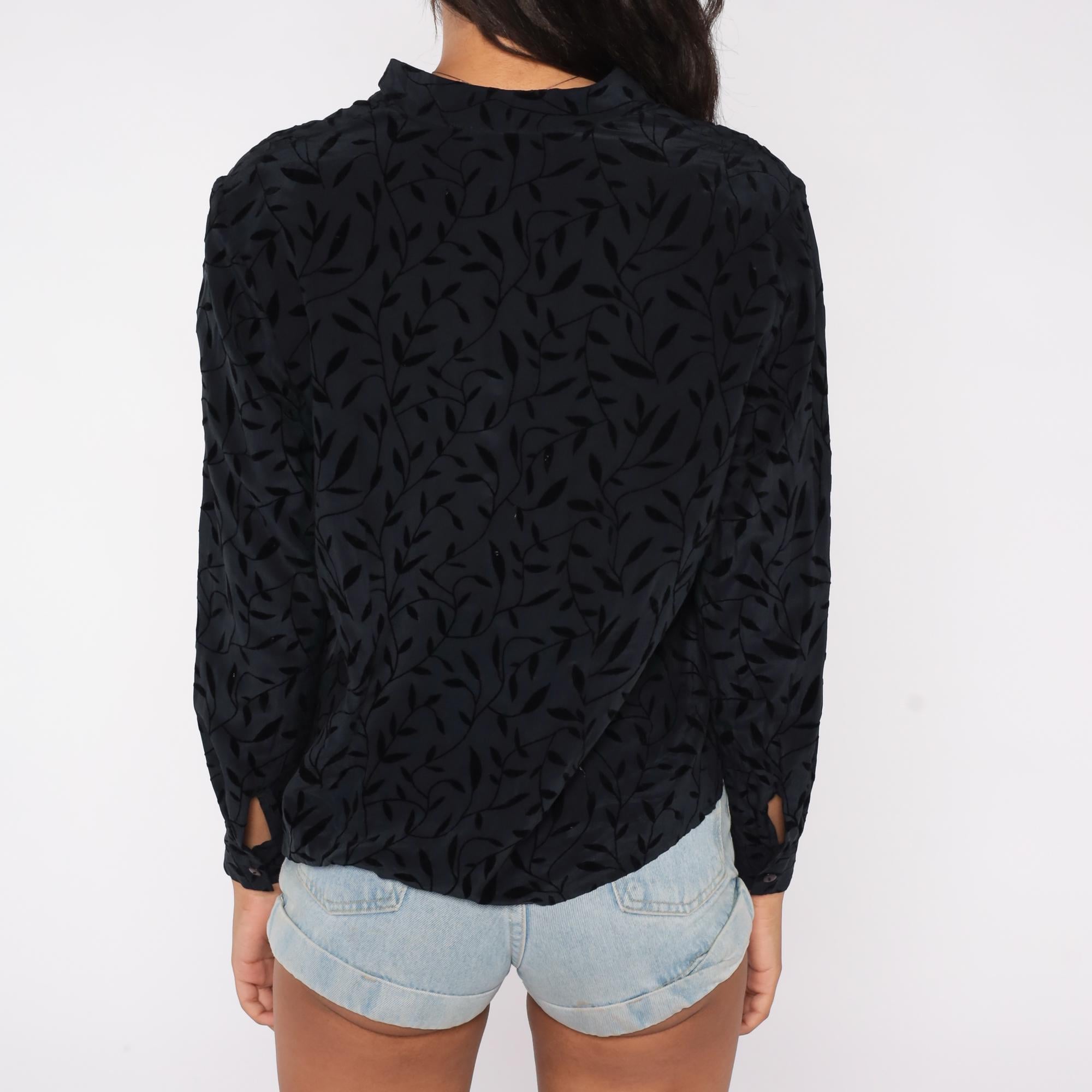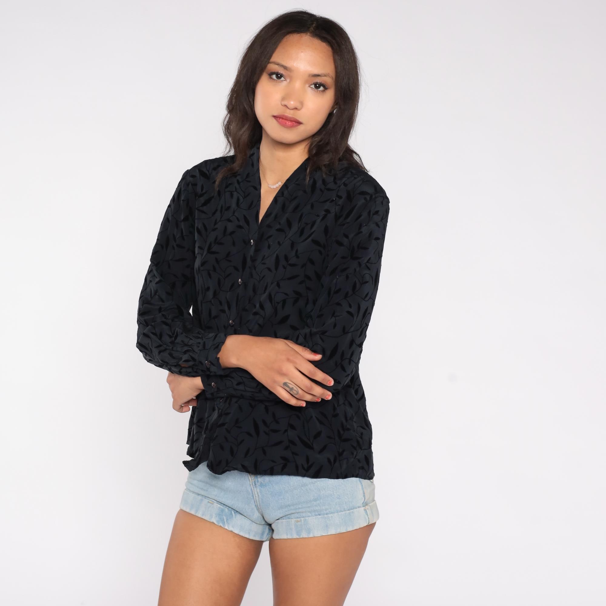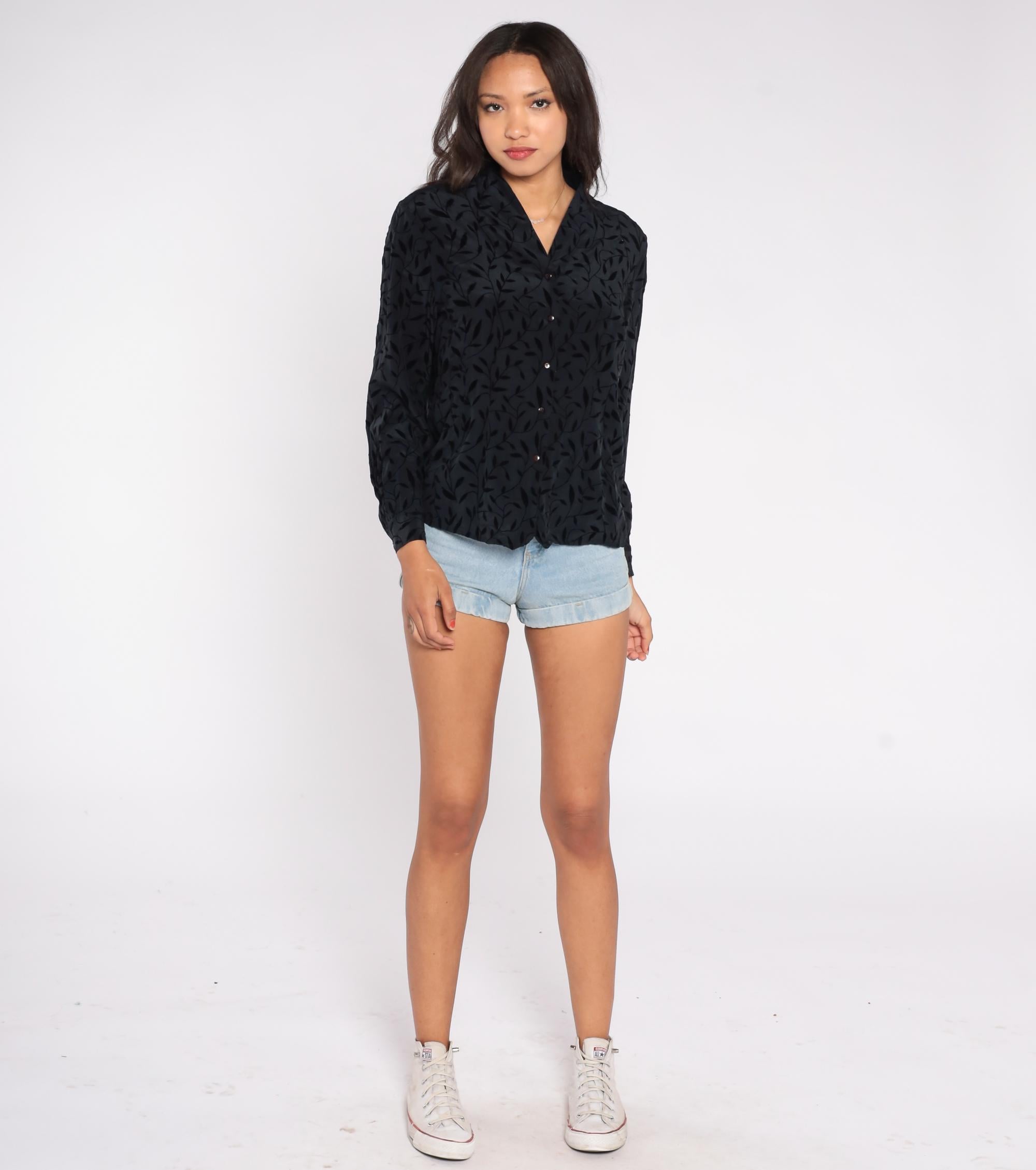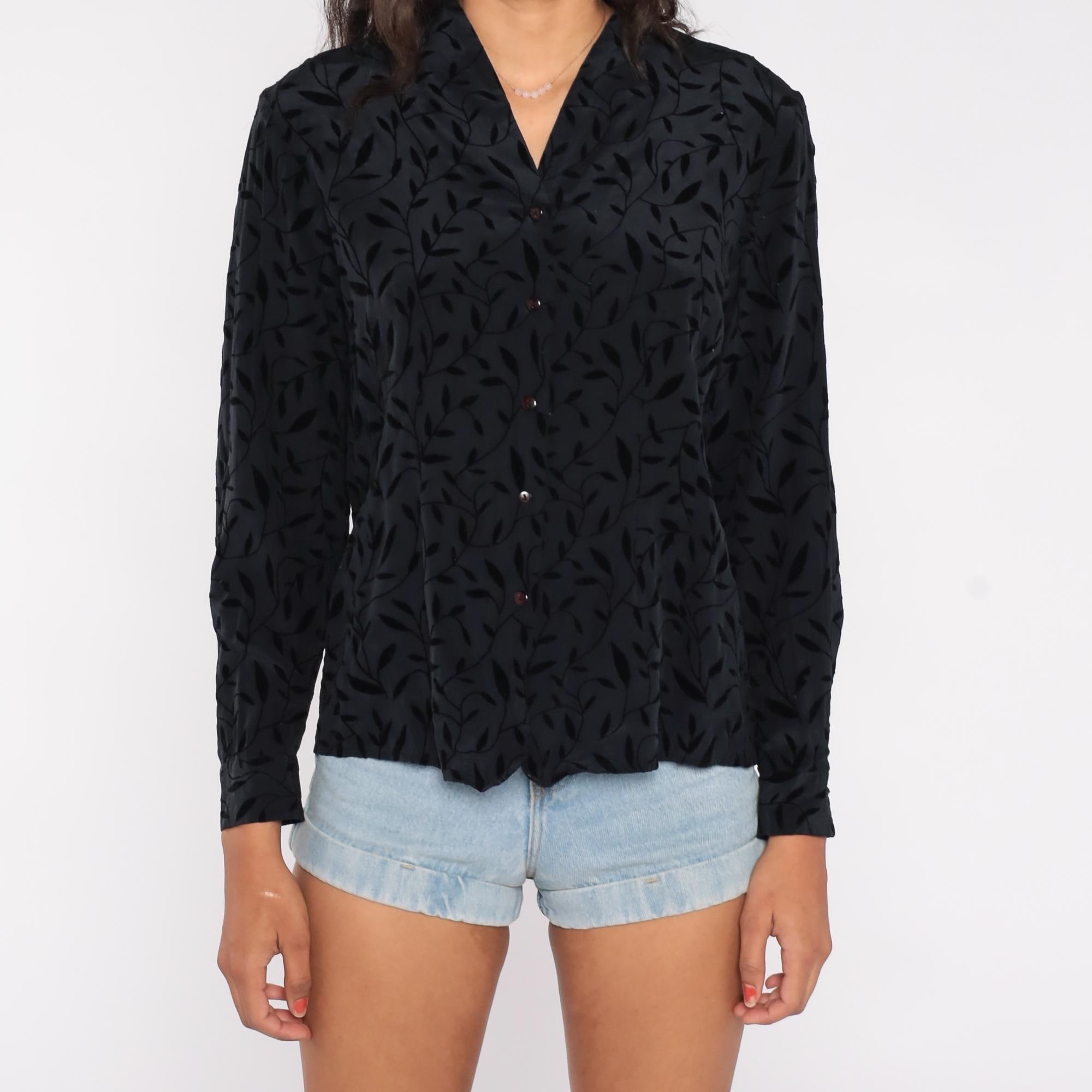 90s black silk blouse from Anna and Frank with tonal leaf branch pattern throughout. Notched collar with button front closure and long sleeves with button cuffs. Slightly relaxed fit through body.