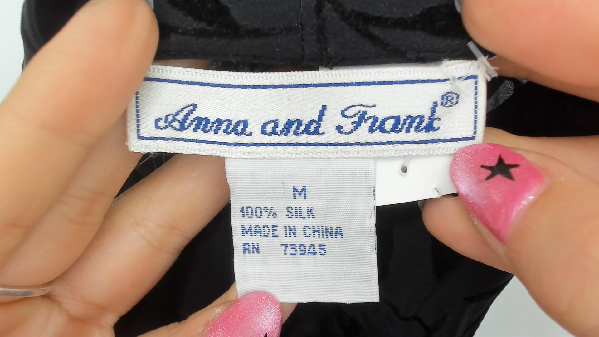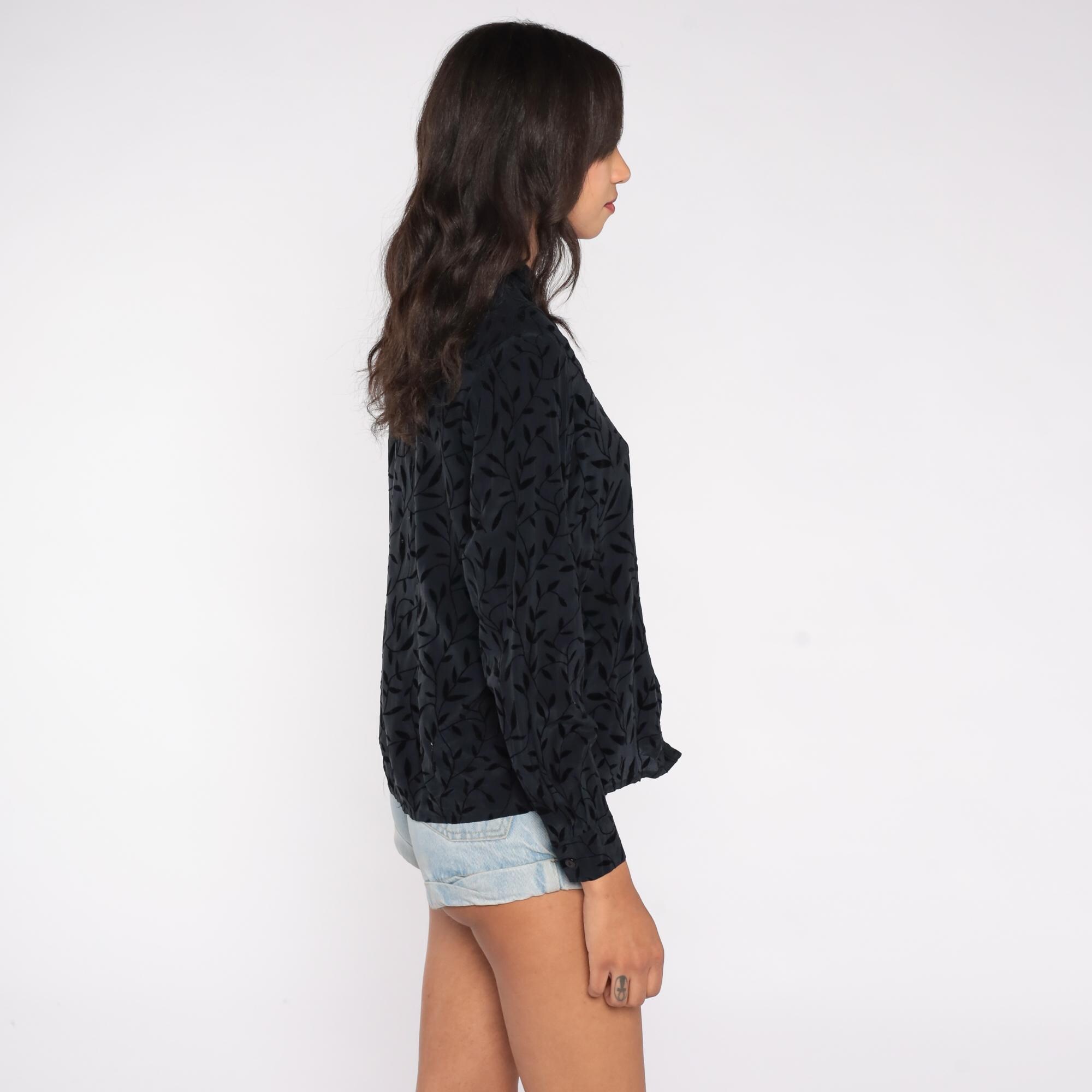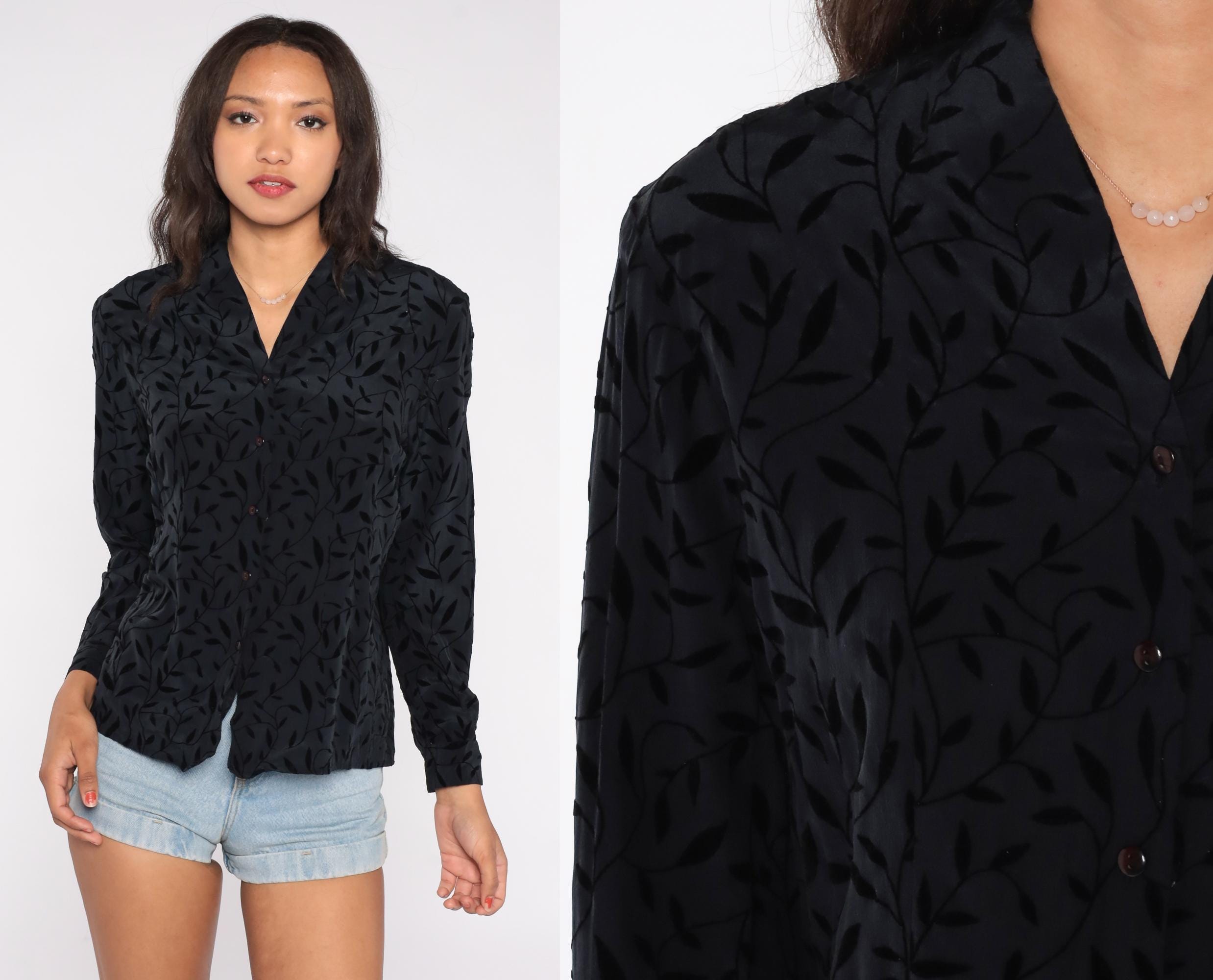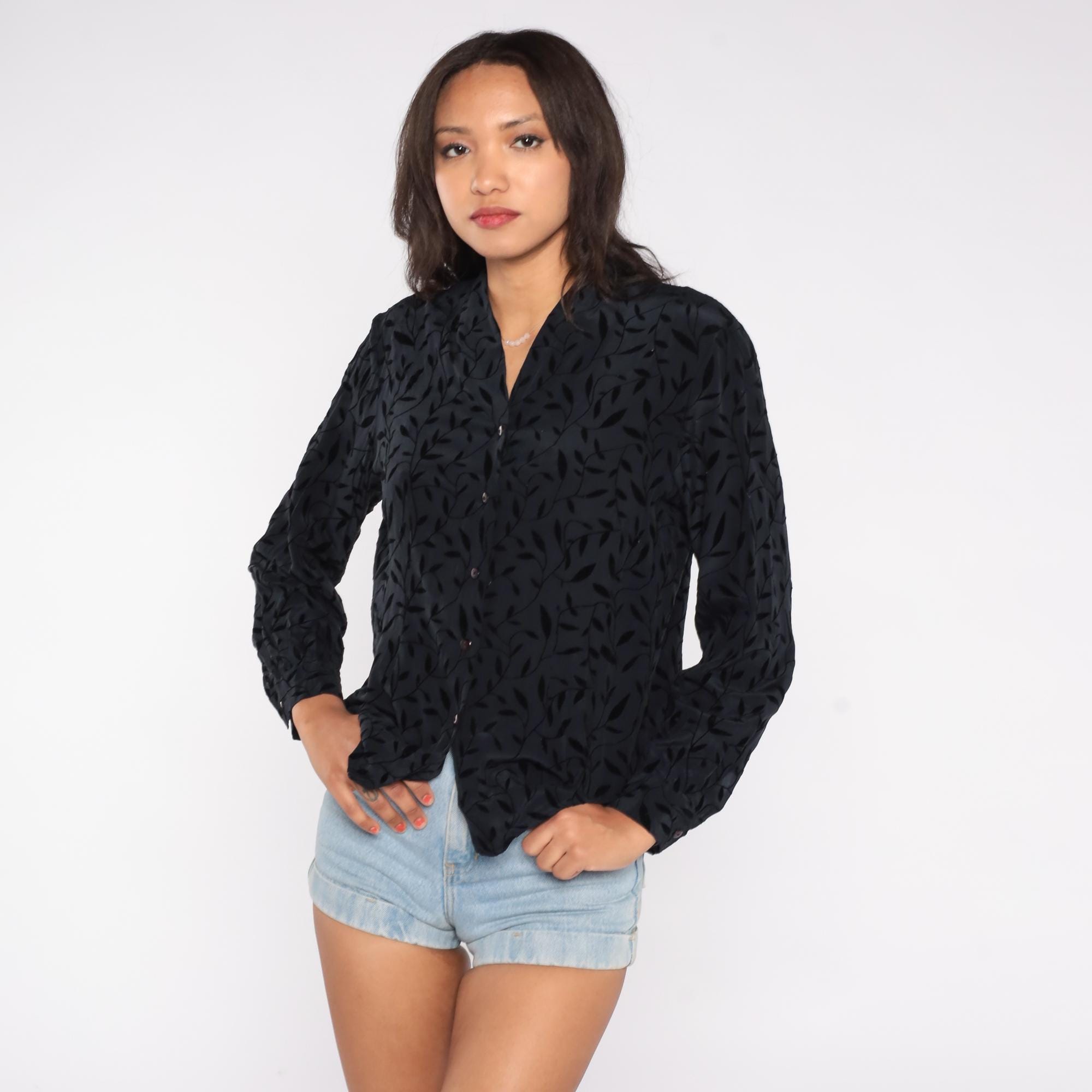 90s black silk blouse from Anna and Frank with tonal leaf branch pattern throughout. Notched collar with button front closure and long sleeves with button cuffs. Slightly relaxed fit through body.