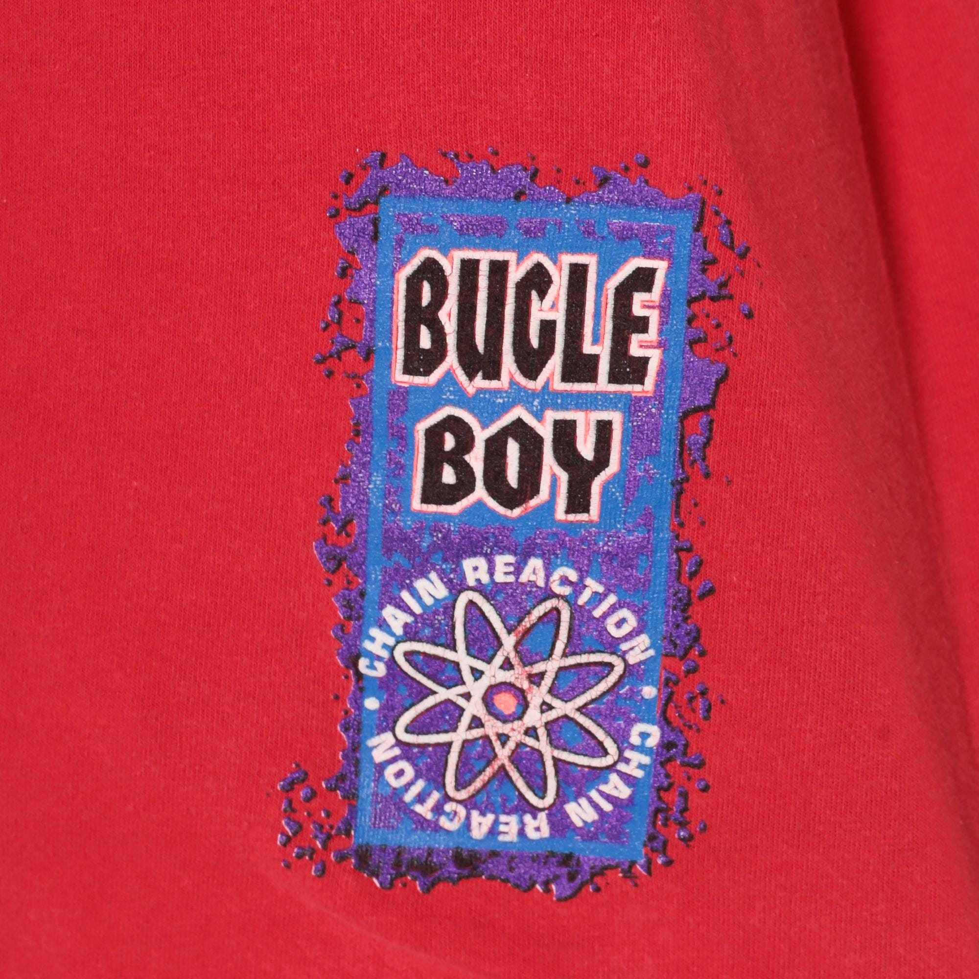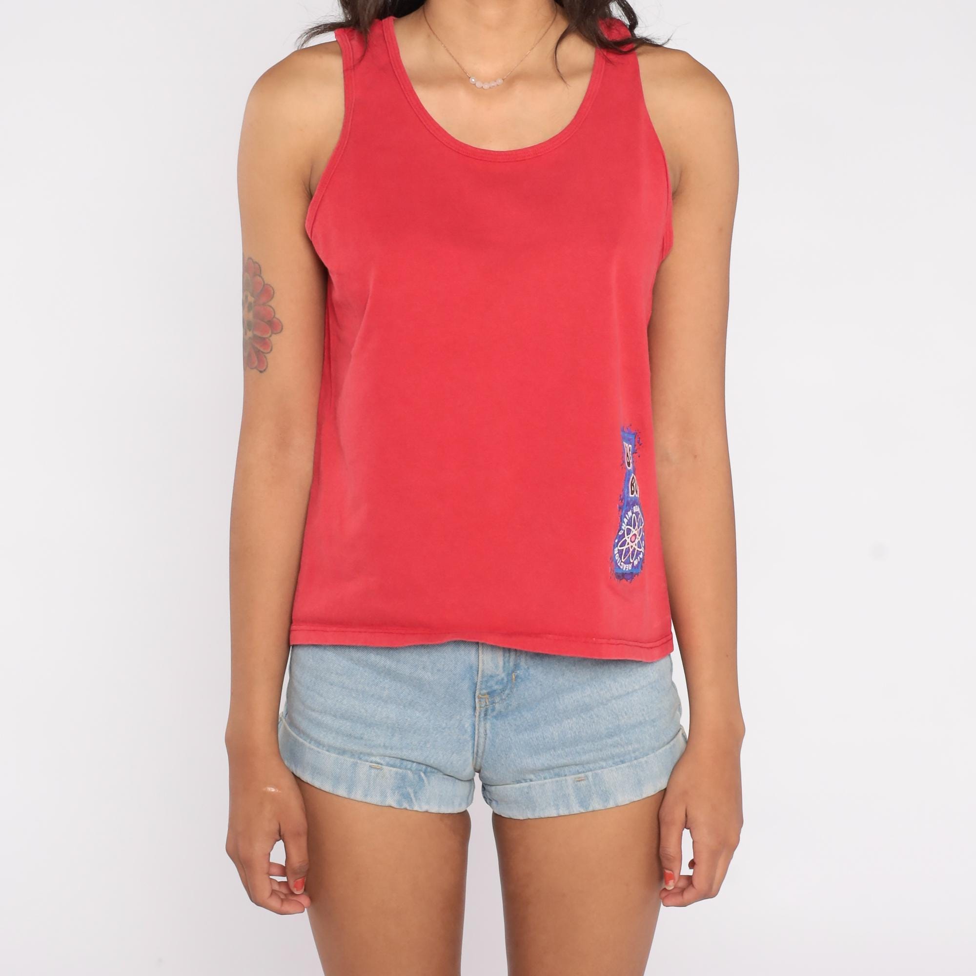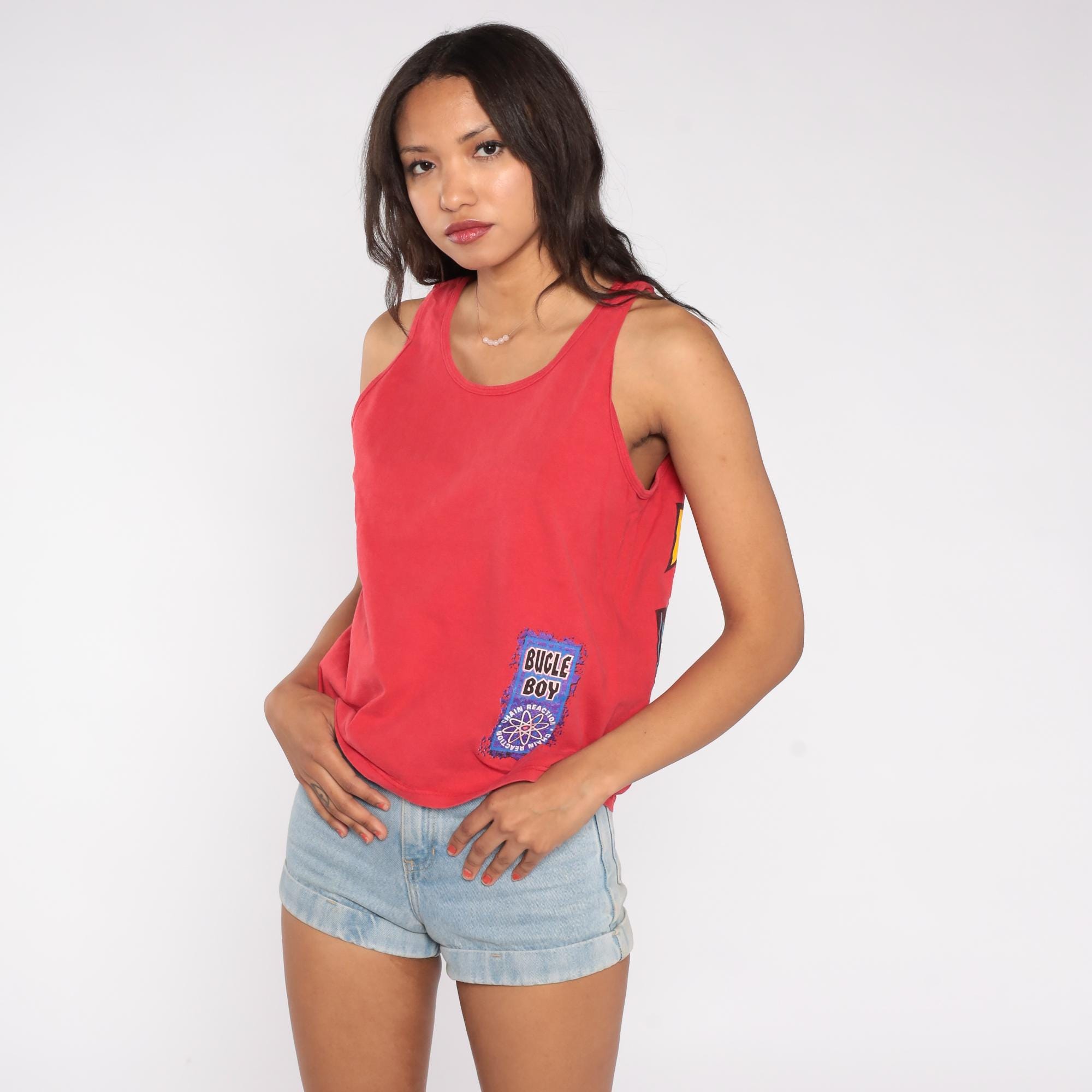 Red tank top from the 90s by Bugle Boy Active with large graphic print on the back. Front has small graphic detail at lower right. Colorful design includes "BUGLE BOY" text in comic-style lettering, arrows in yellow and orange, atom symbol, and "CHAIN REACTION" text arranged in geometric pattern with blue, purple, and turquoise elements against the red fabric.