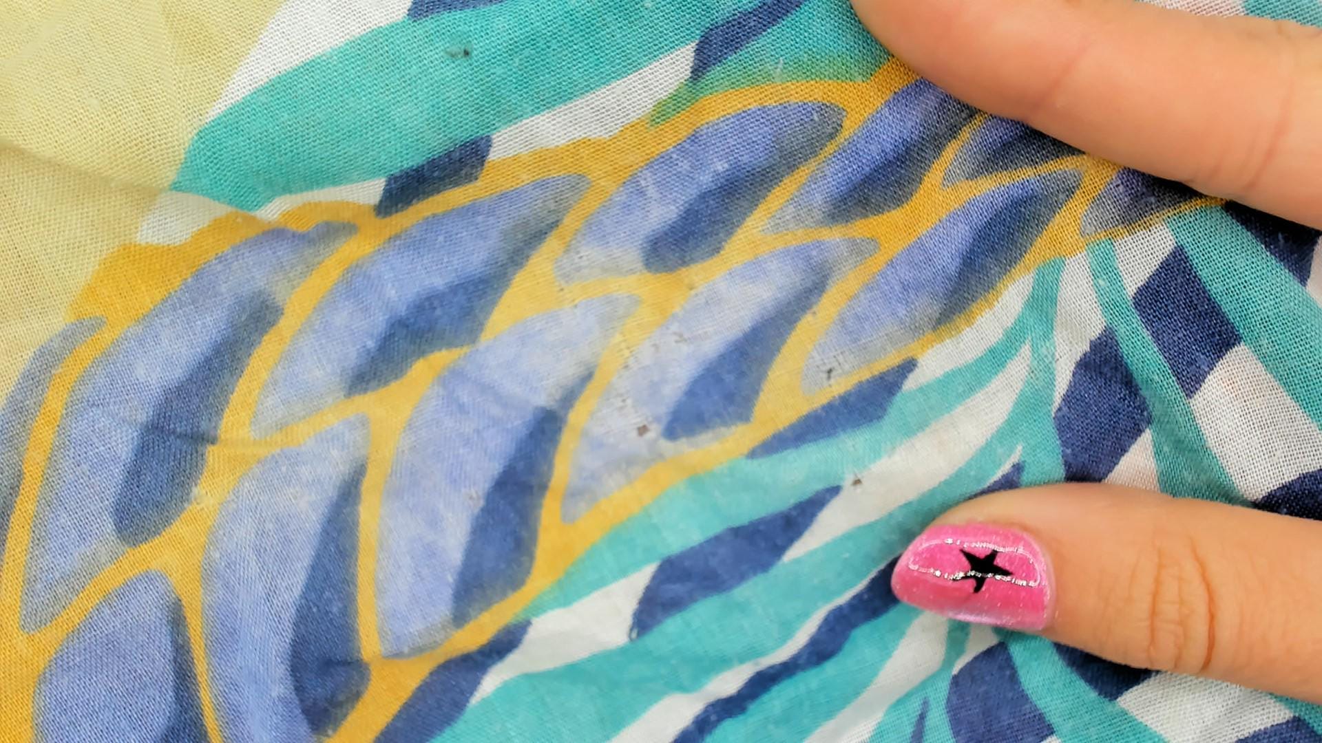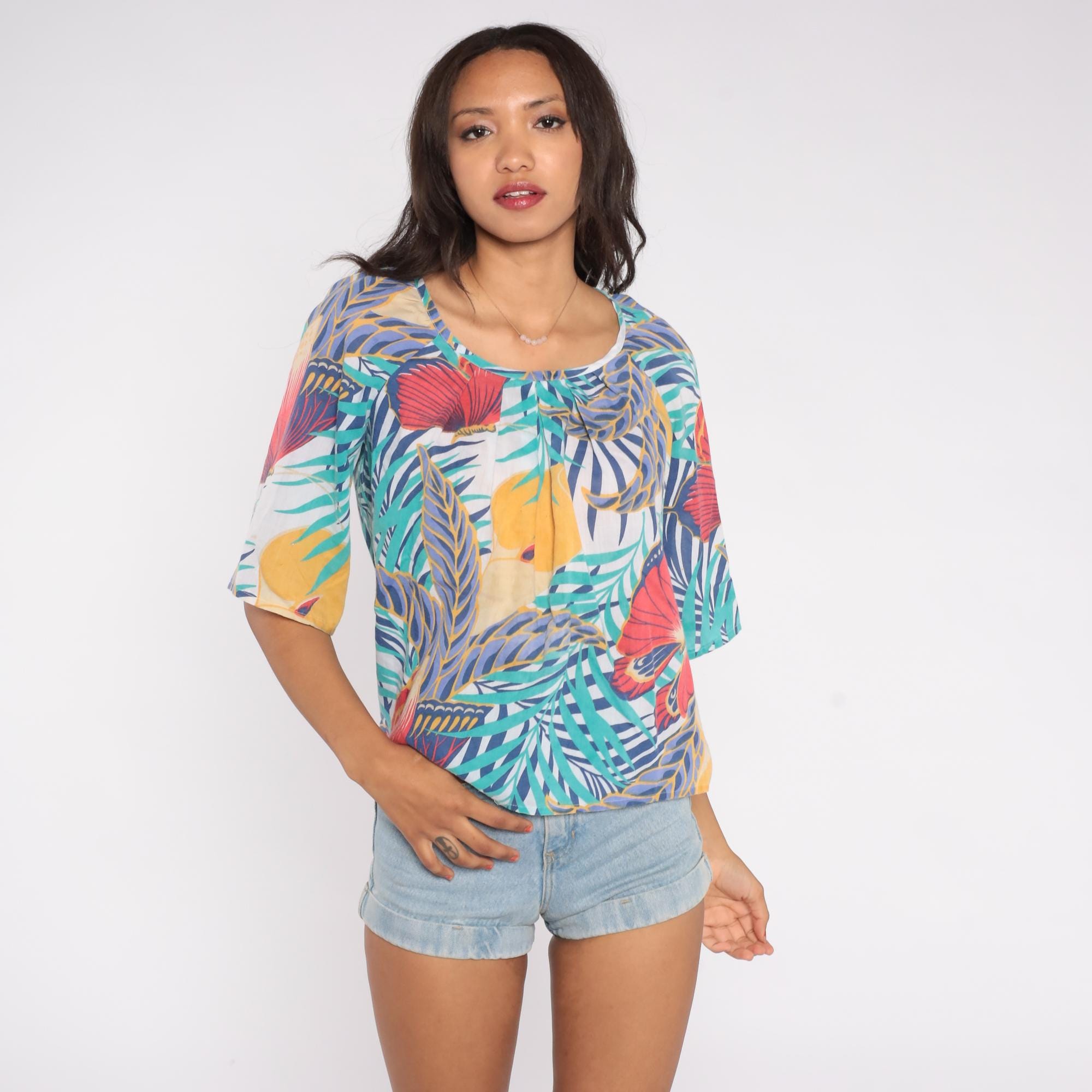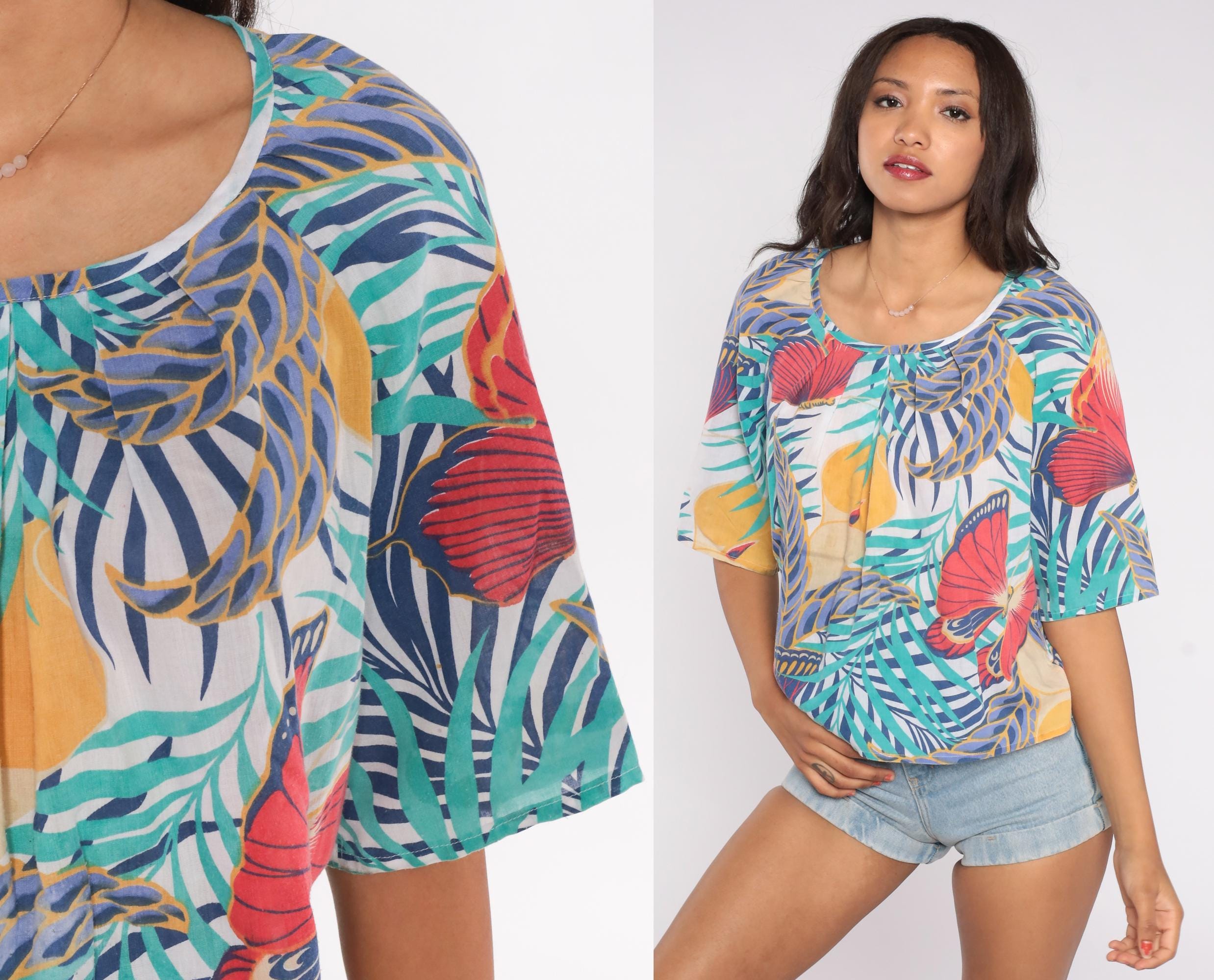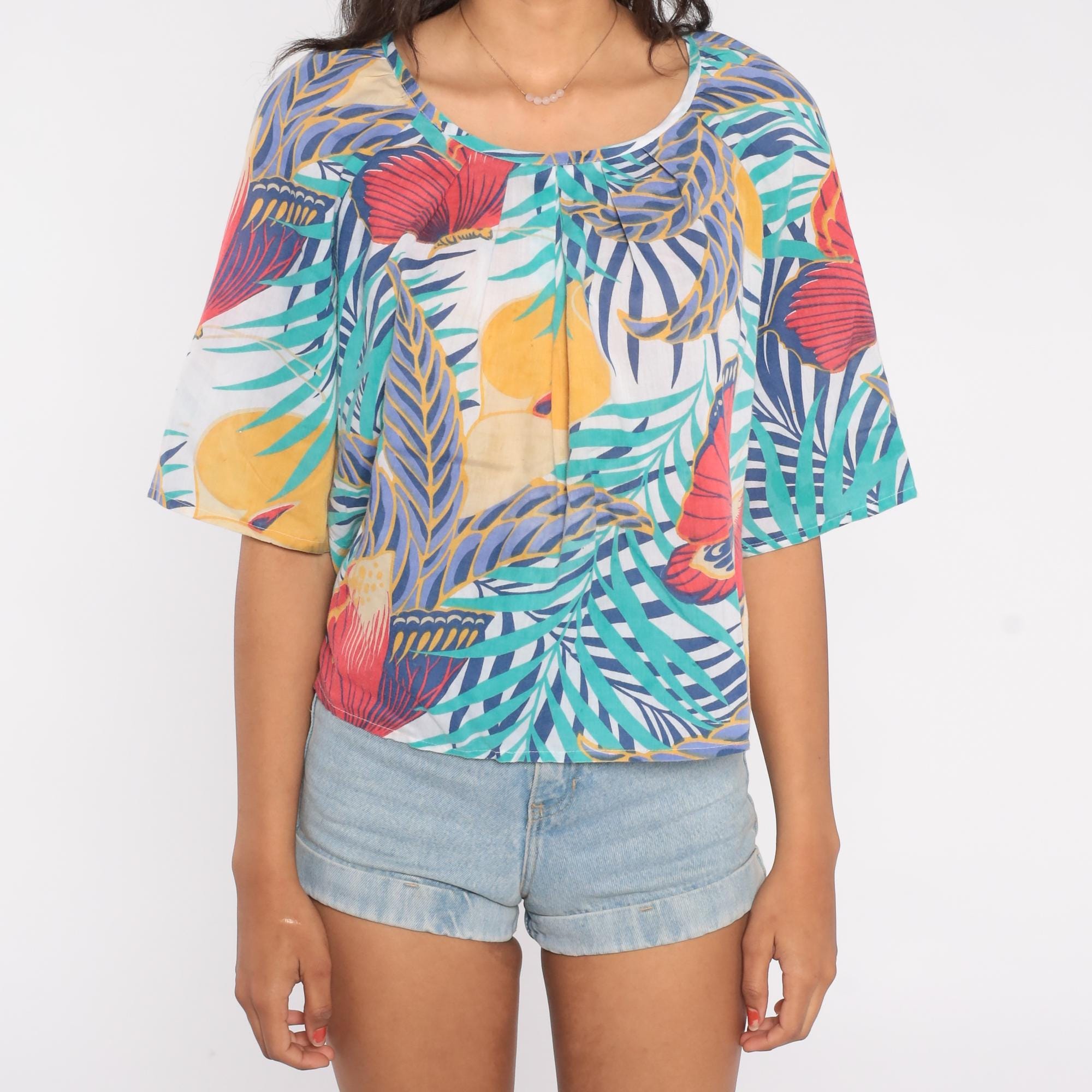 80s tropical print top with vibrant multicolor leaf and floral pattern in teal, navy, coral red, yellow, and cream. Round scoop neckline with short sleeves. Loose fit with relaxed silhouette. All-over botanical print with abstract leaves and flower motifs.