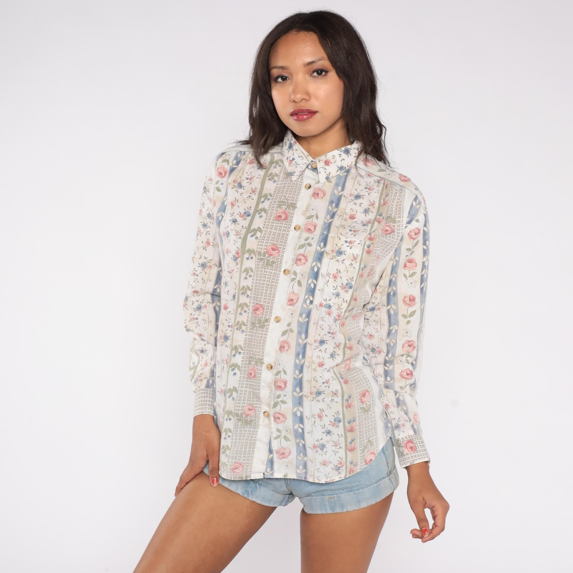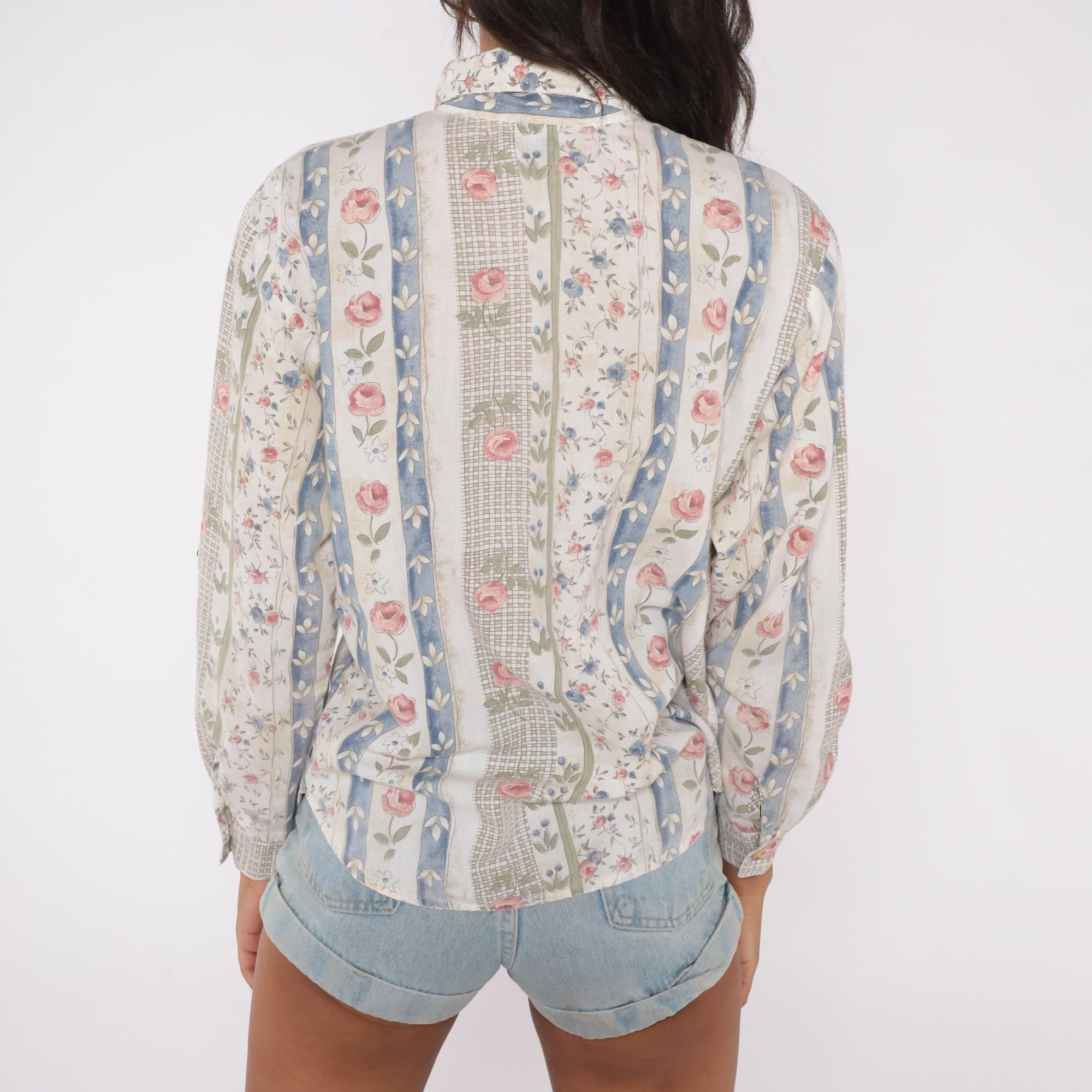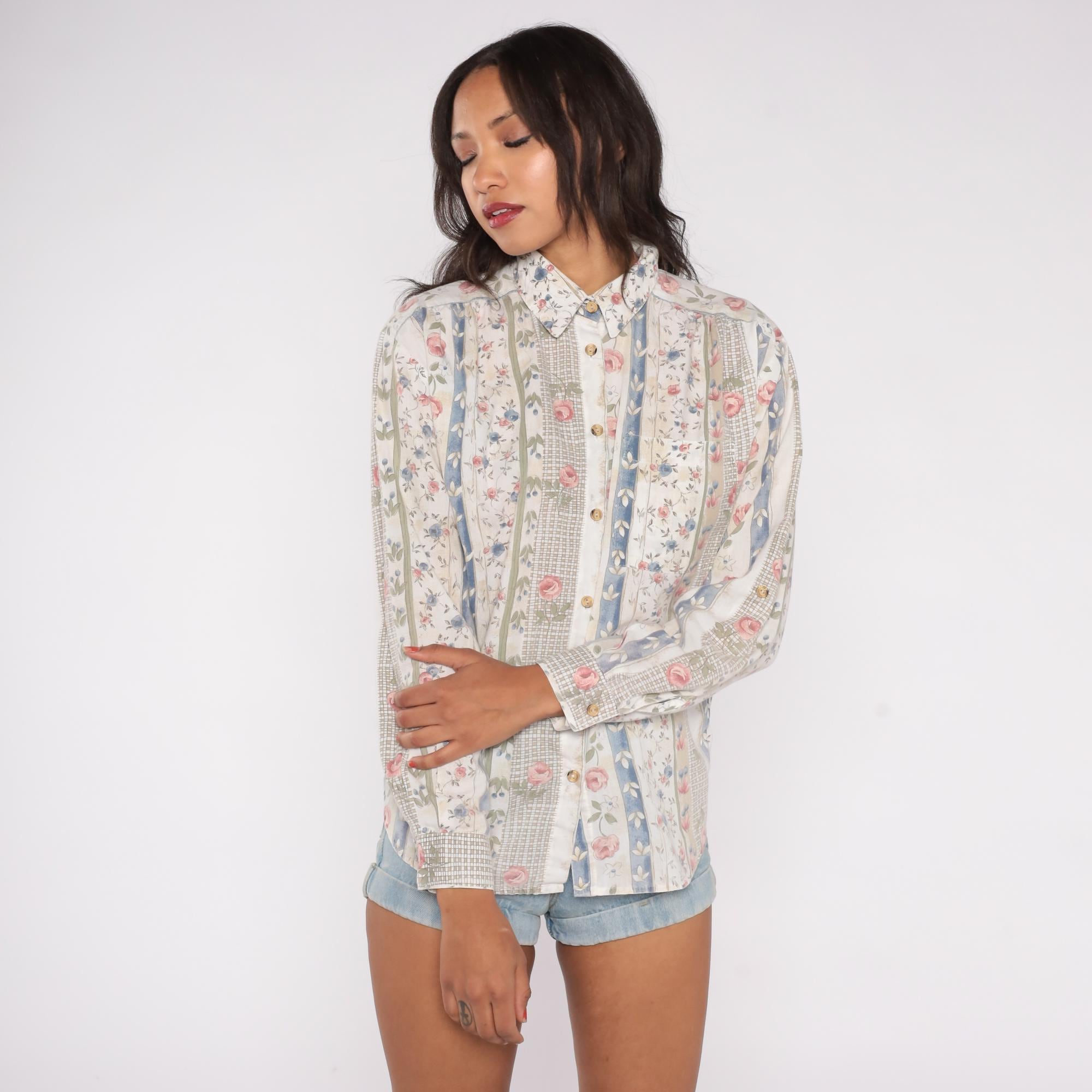 90s floral stripe shirt with vertical panels of alternating patterns. Cream base with vertical stripes featuring pink roses with green leaves, blue floral vines with ivory details, and sage green crosshatch texture. Button front closure with collar and long sleeves.