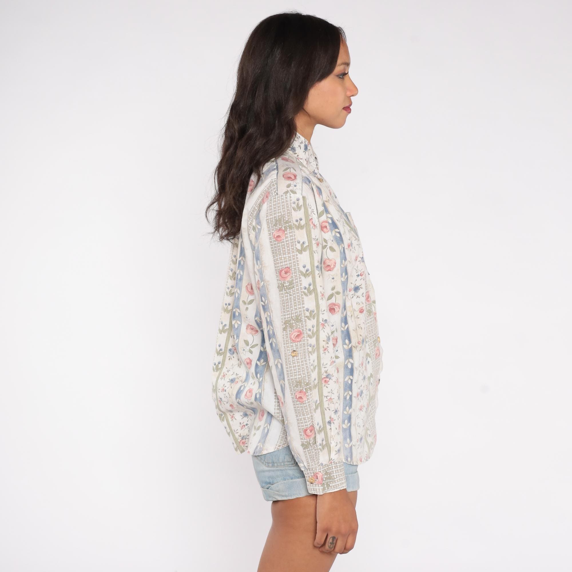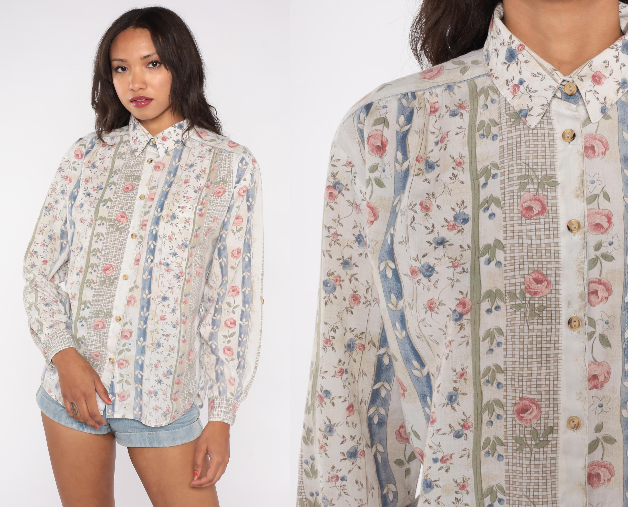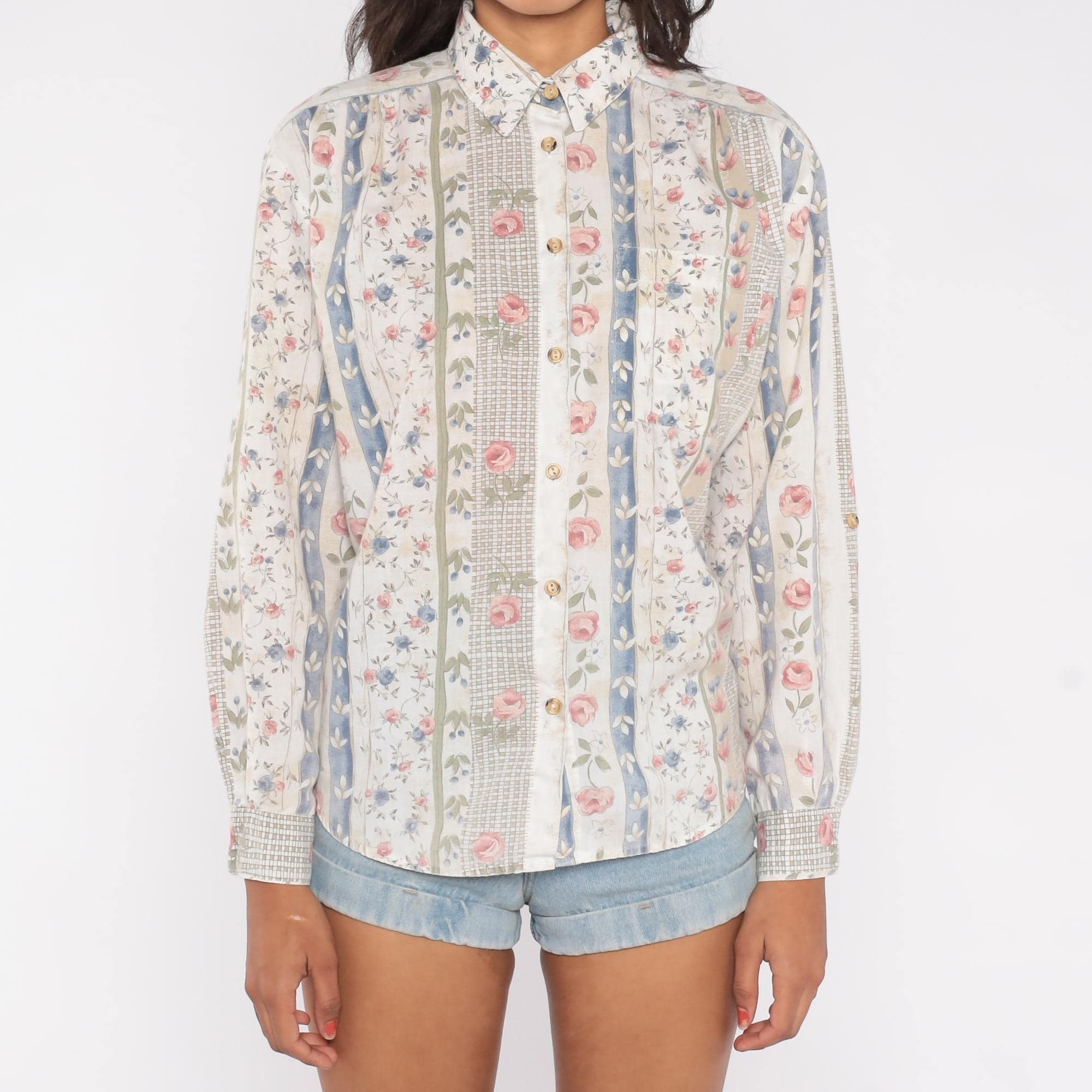 90s floral stripe shirt with vertical panels of alternating patterns. Cream base with vertical stripes featuring pink roses with green leaves, blue floral vines with ivory details, and sage green crosshatch texture. Button front closure with collar and long sleeves.