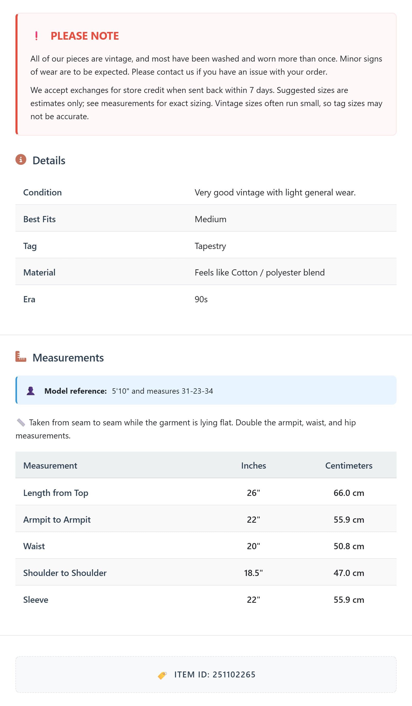 Suggested sizes are estimates only; see measurements for exact sizing. Vintage sizes often run small, so tag sizes may not be accurate.