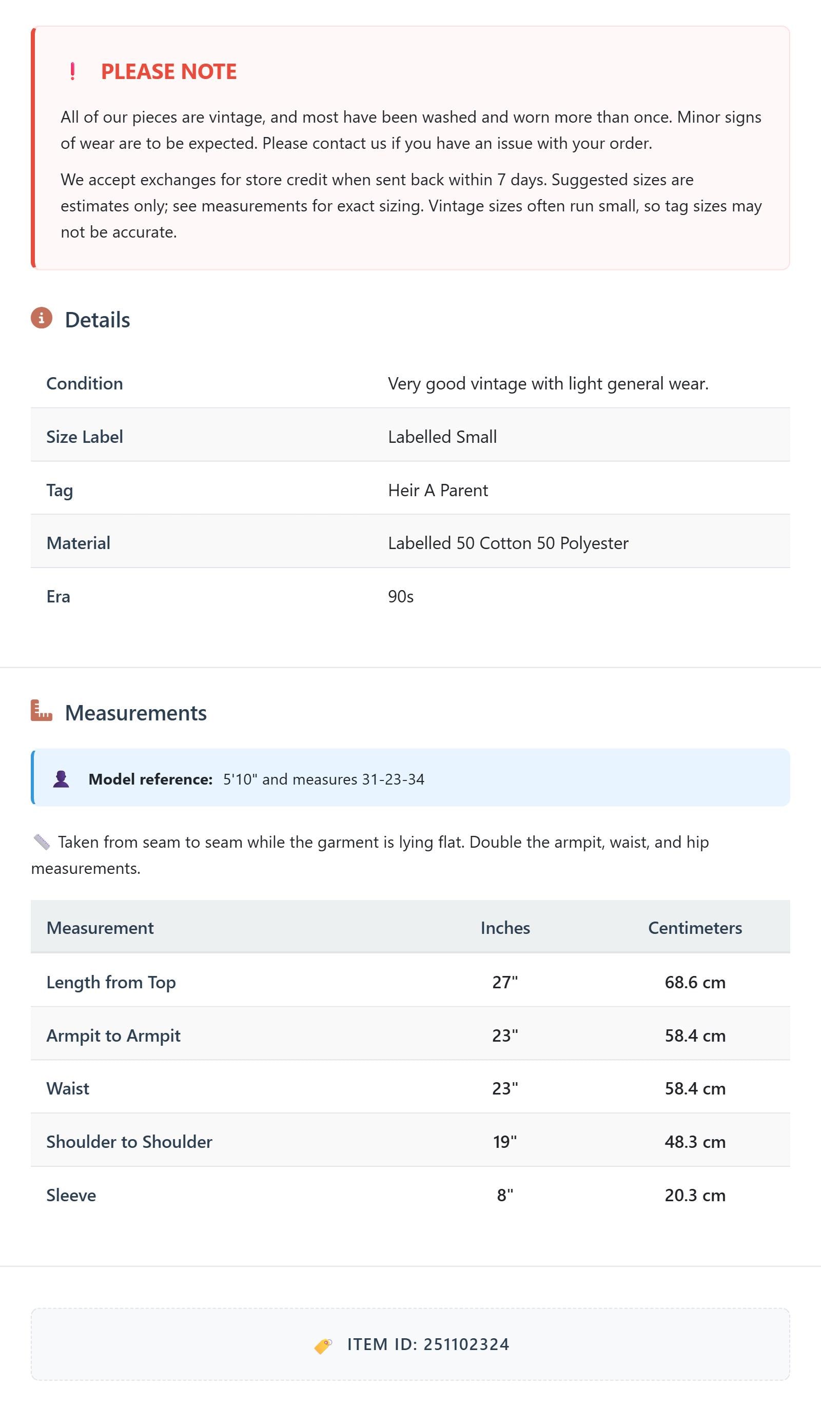 Suggested sizes are estimates only; see measurements for exact sizing. Vintage sizes often run small, so tag sizes may not be accurate.