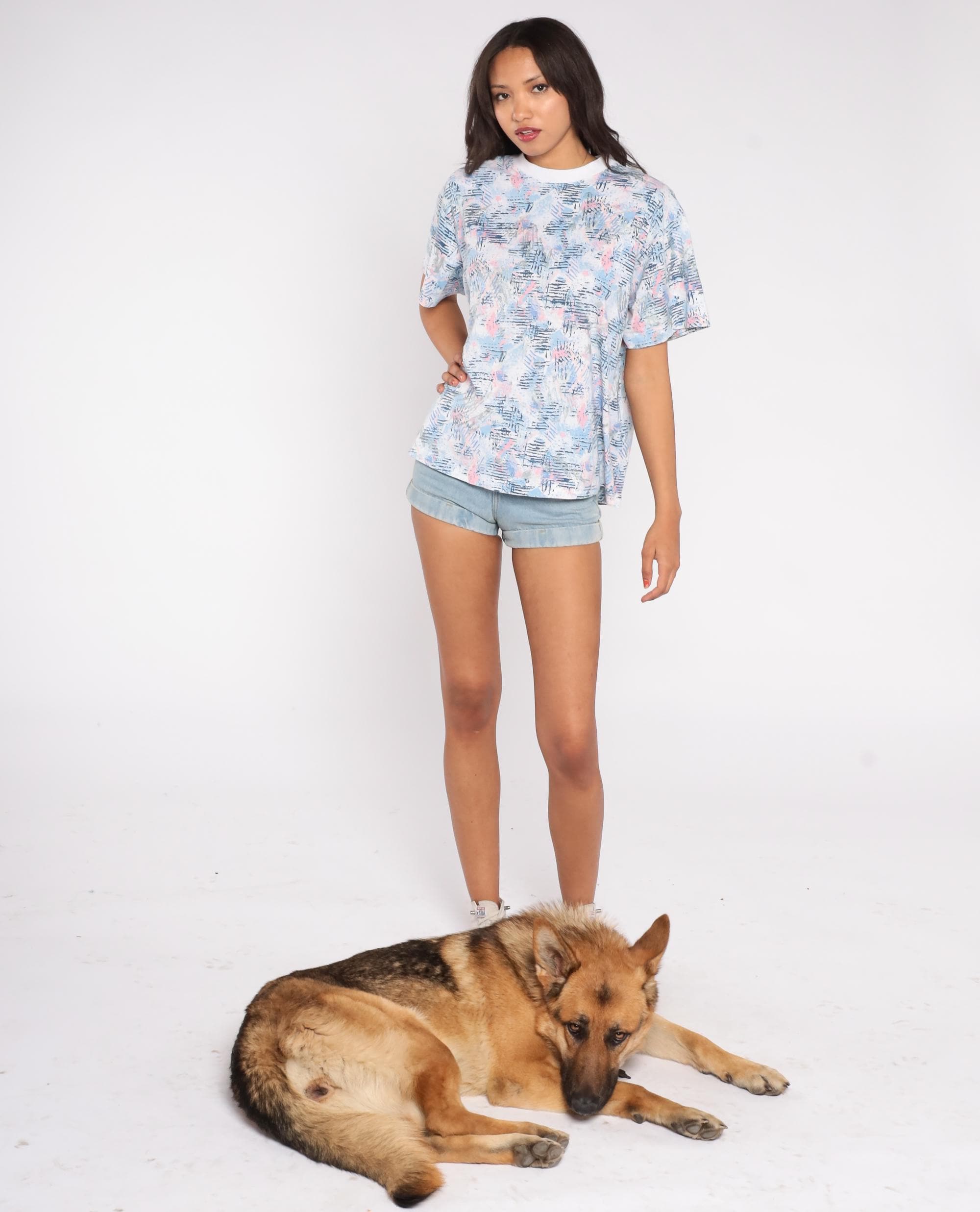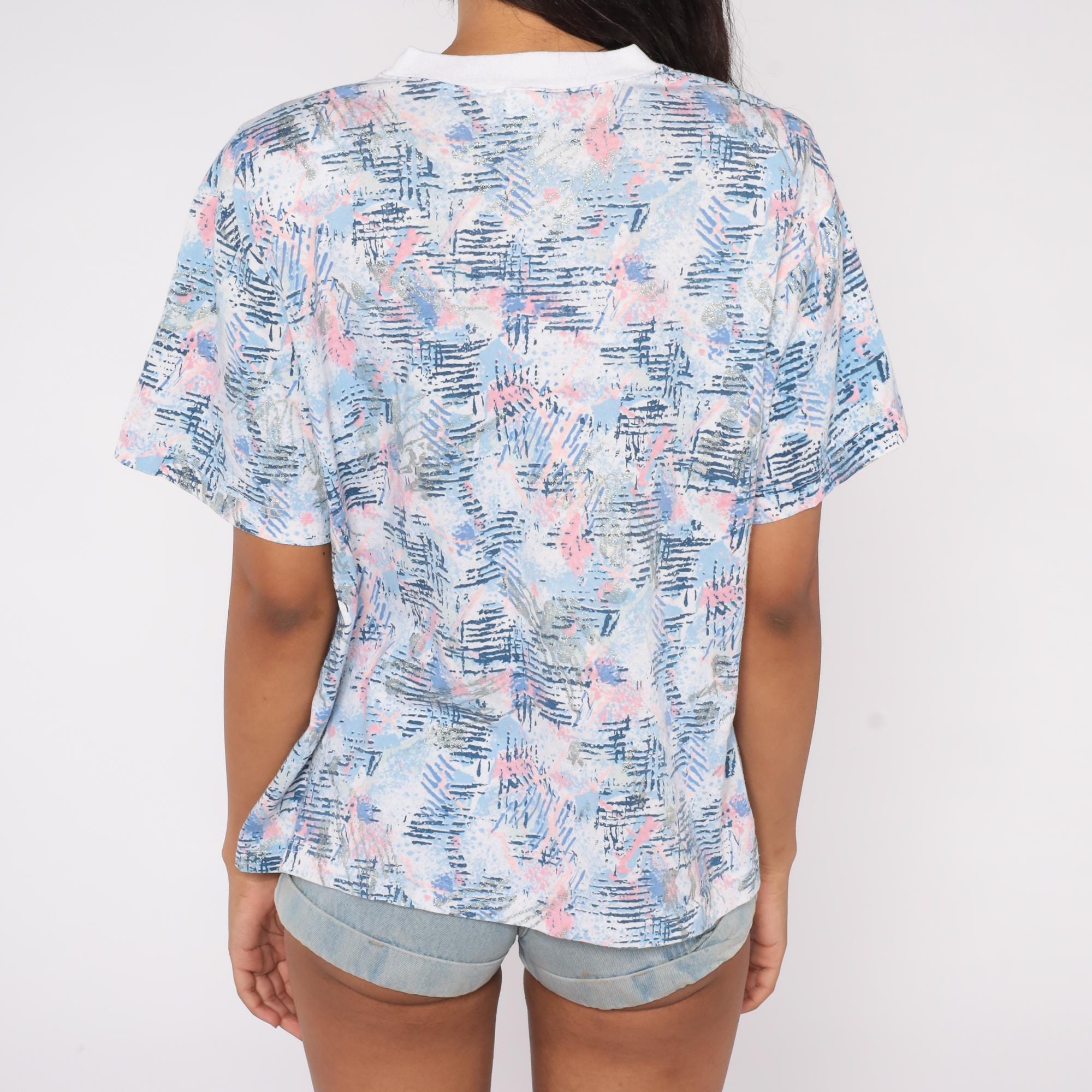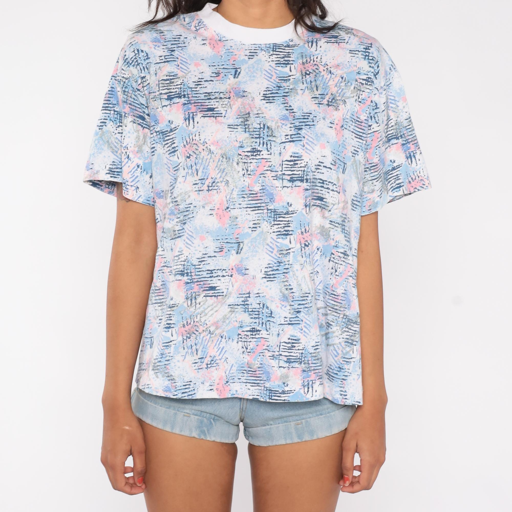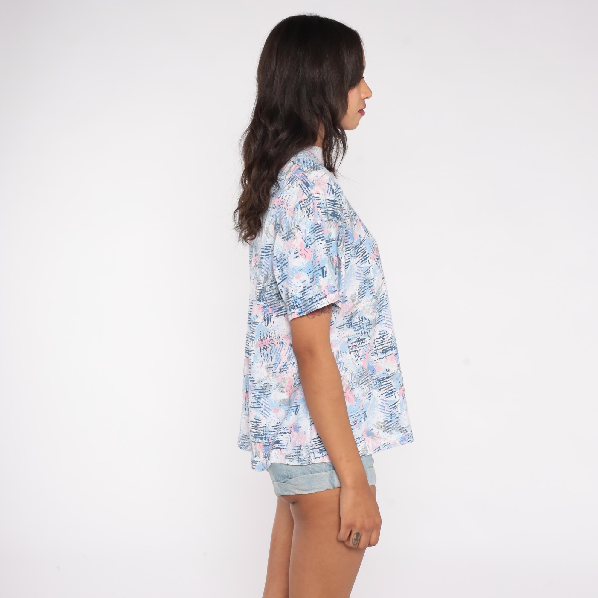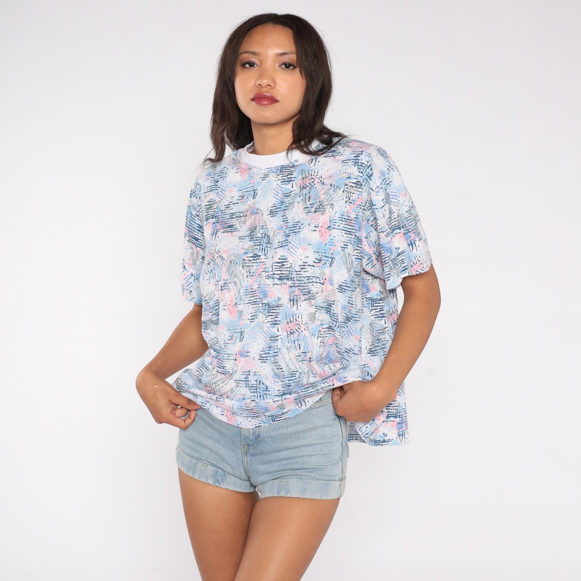 90s abstract print t-shirt in soft pastel tones with blue, pink, gray, and white brushstroke pattern across the fabric. Short sleeves, crew neckline, and relaxed fit.
