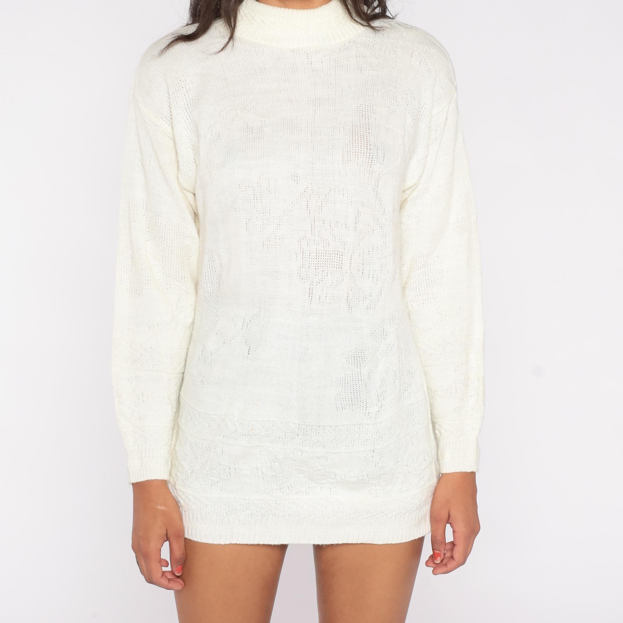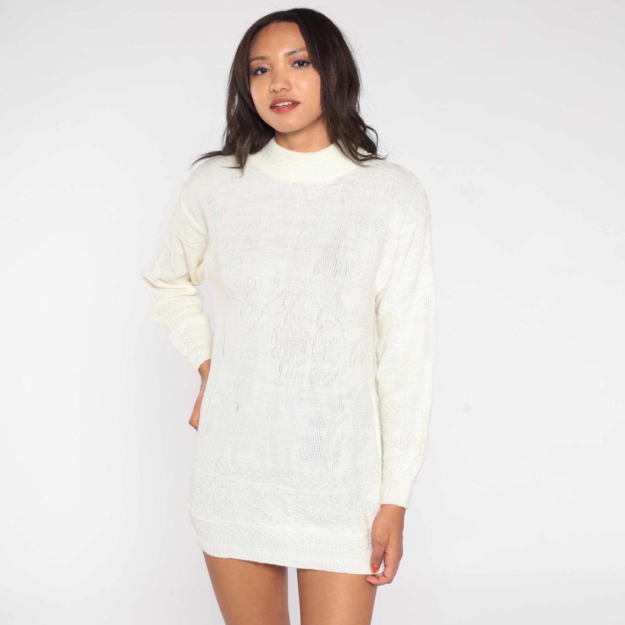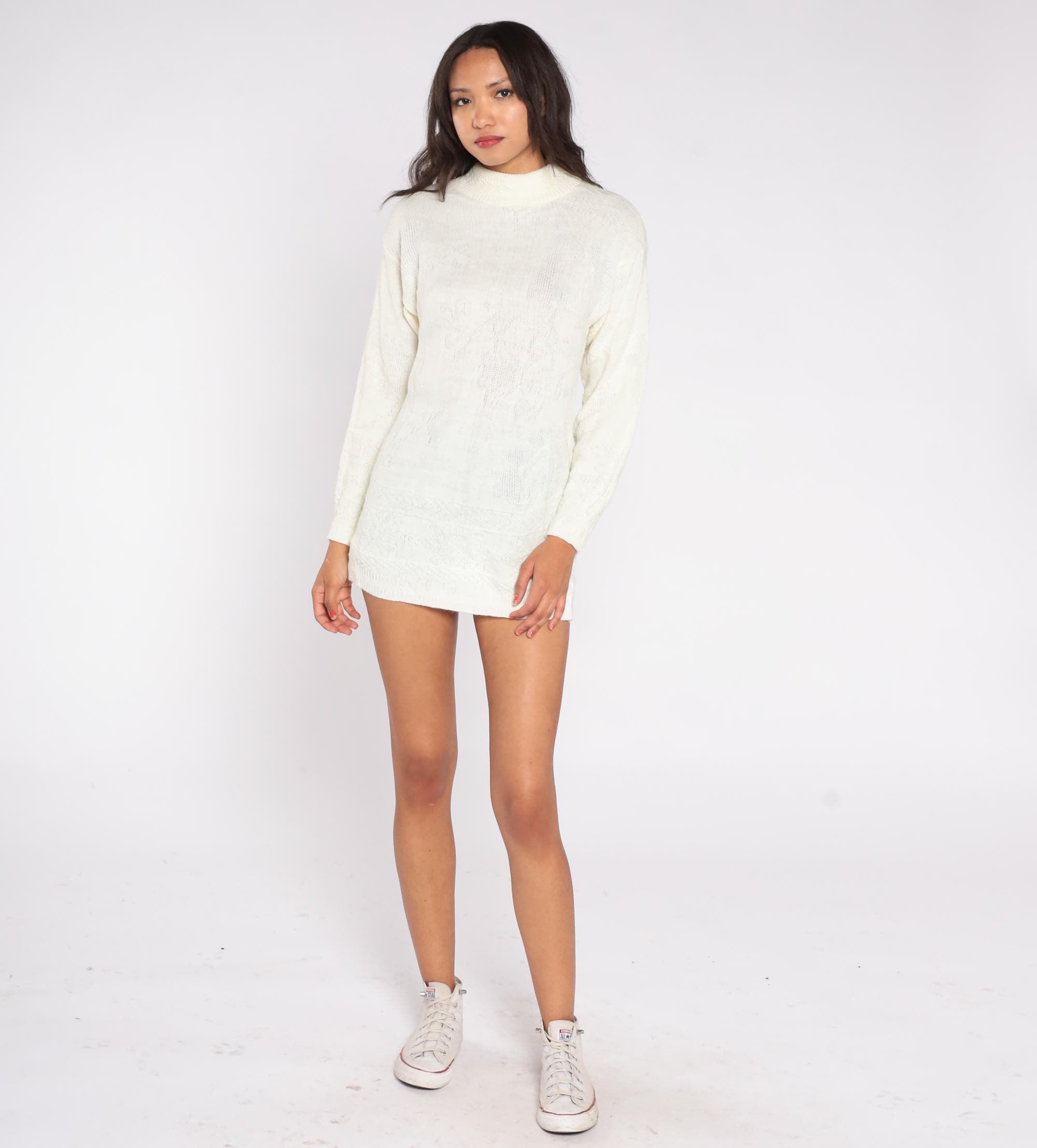 Cream knit sweater from the 80s by Village Fair with mock turtleneck and long sleeves. Mini length, straight silhouette with ribbed knit texture throughout.