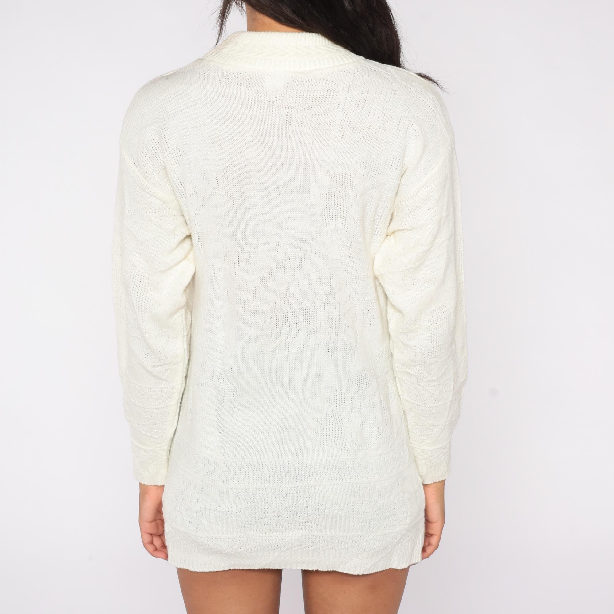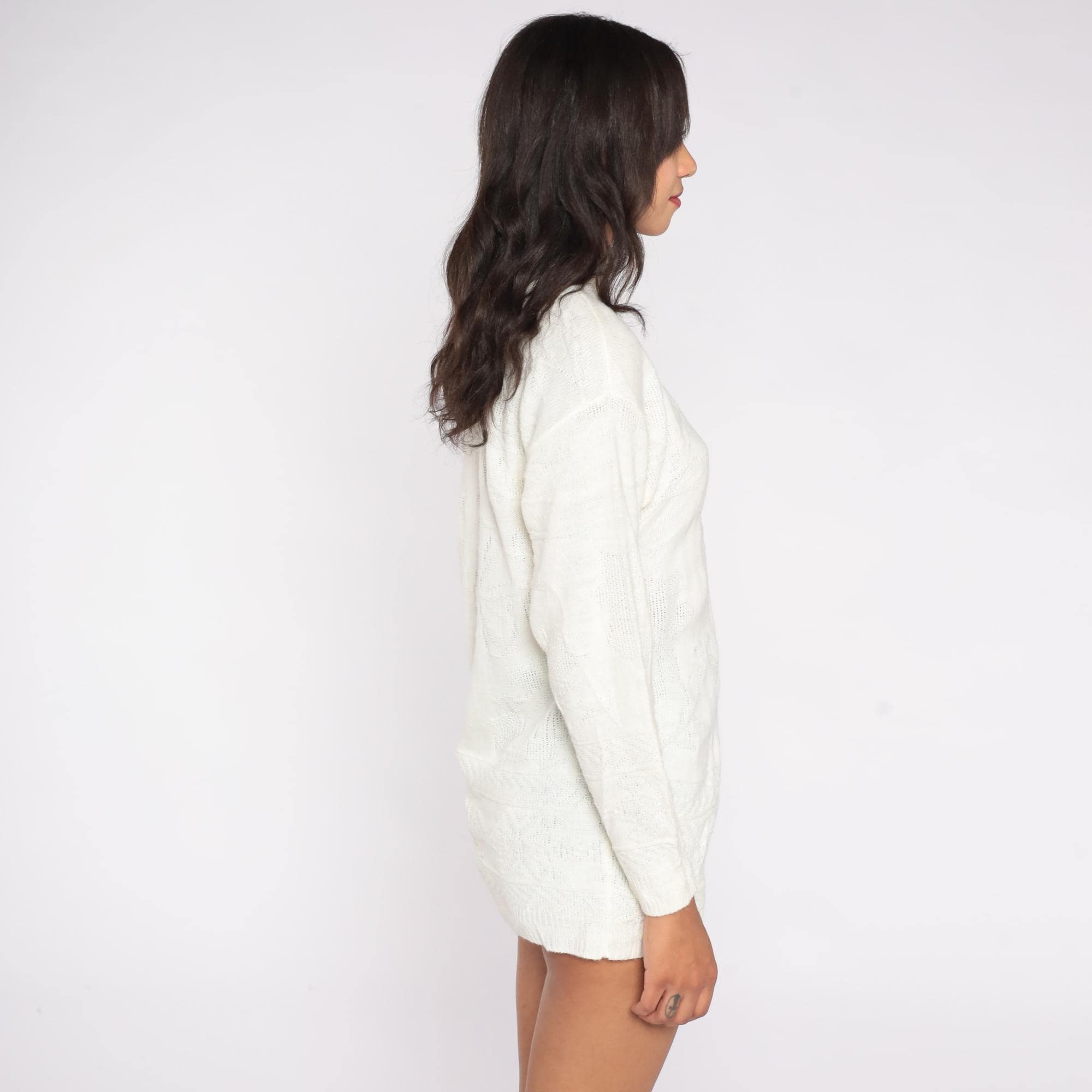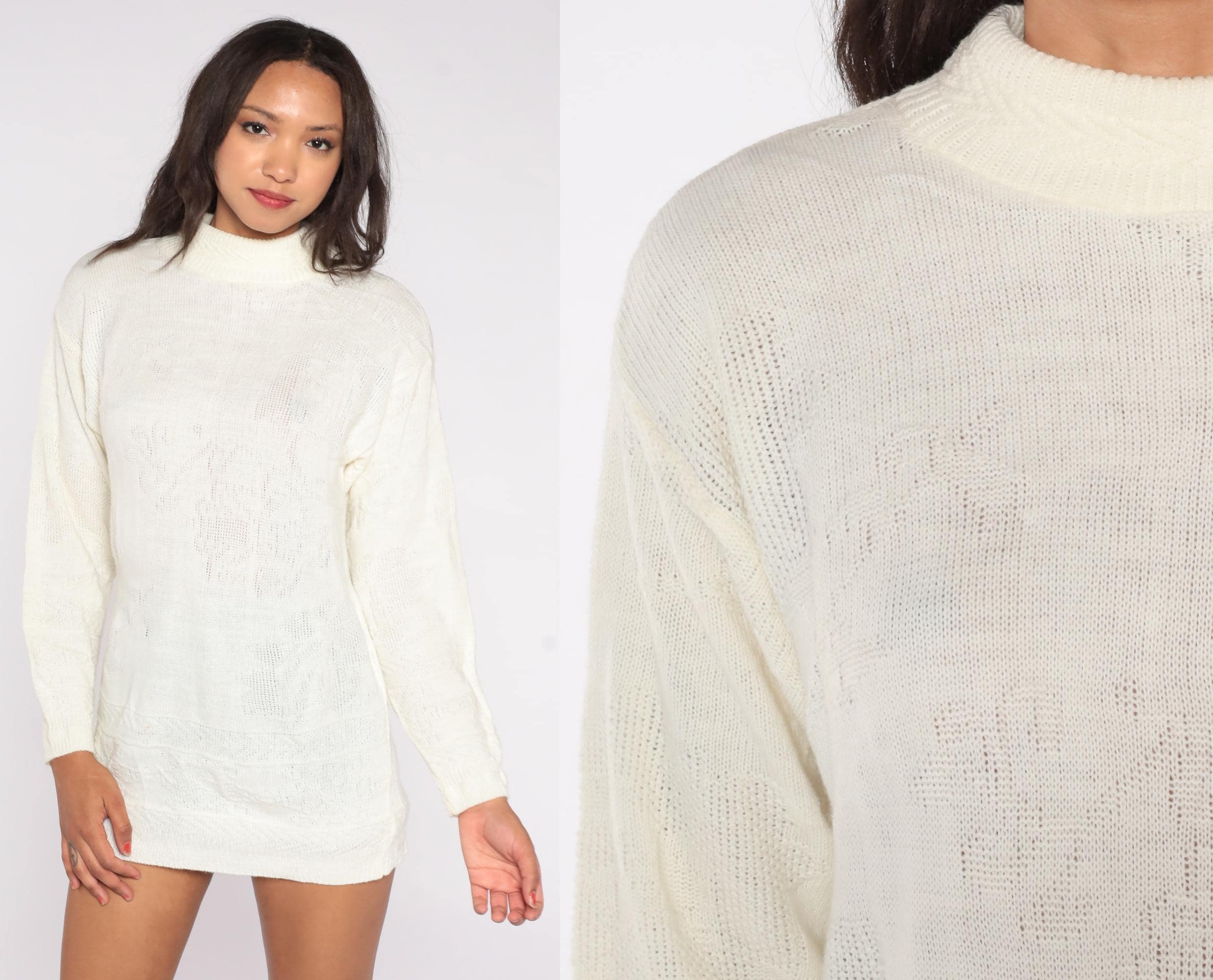 Cream knit sweater from the 80s by Village Fair with mock turtleneck and long sleeves. Mini length, straight silhouette with ribbed knit texture throughout.