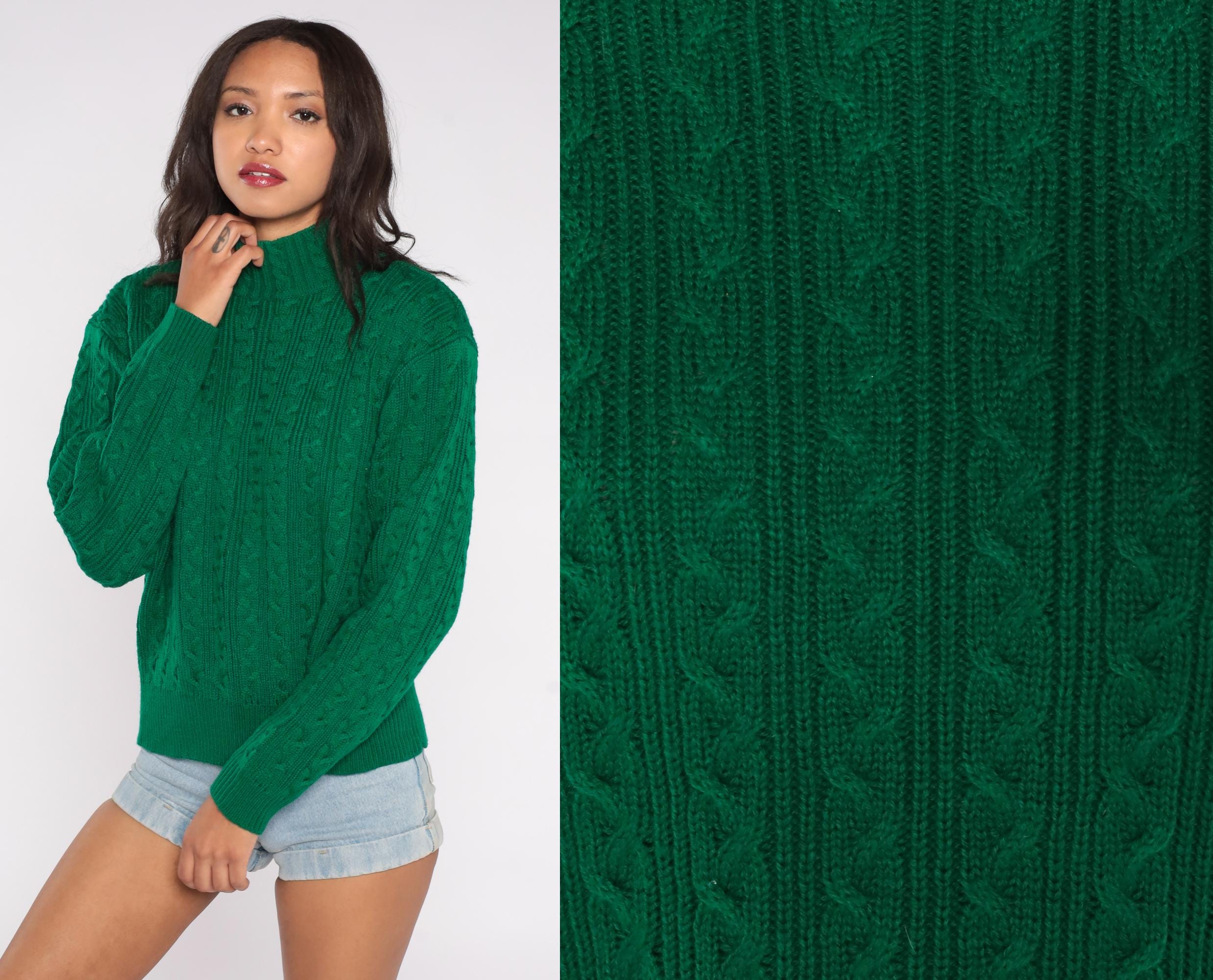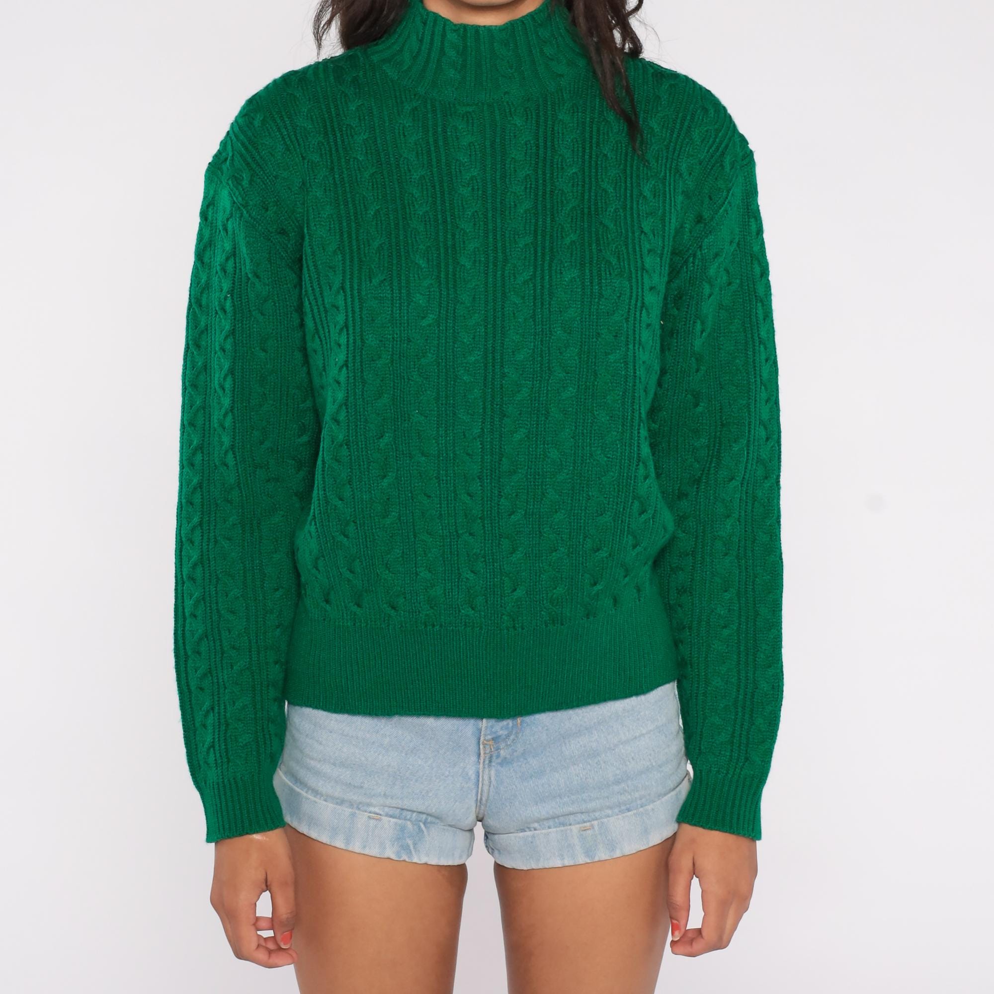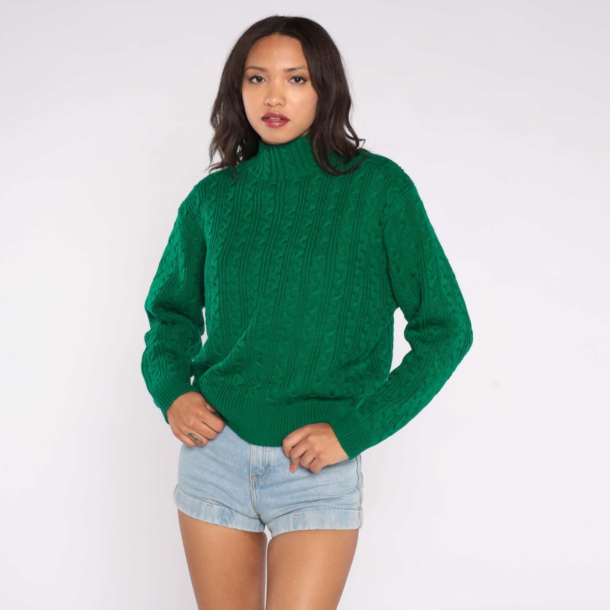 90s green cable knit turtleneck sweater by Karen Scott. Features classic cable knit pattern throughout with mock turtleneck collar and long sleeves.
