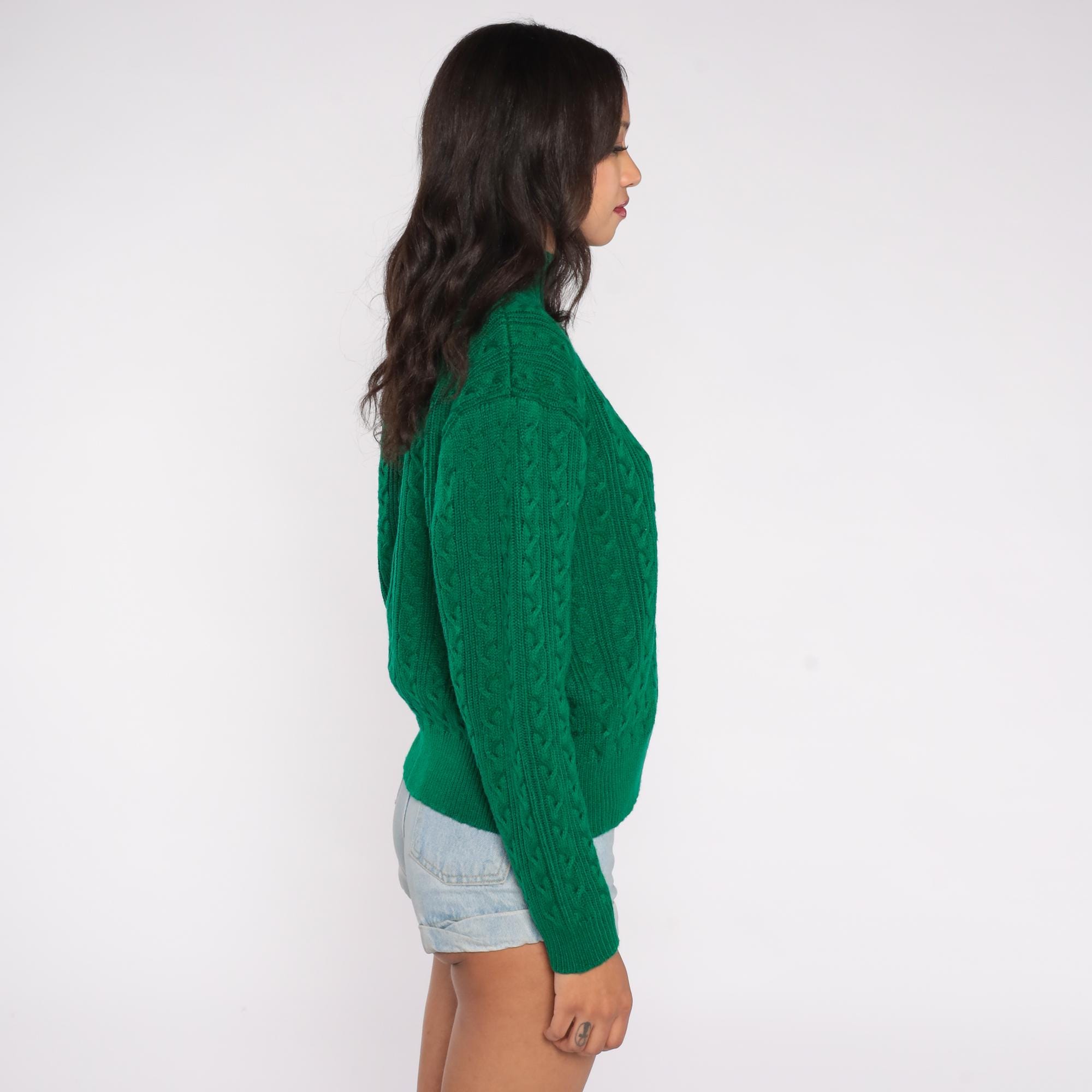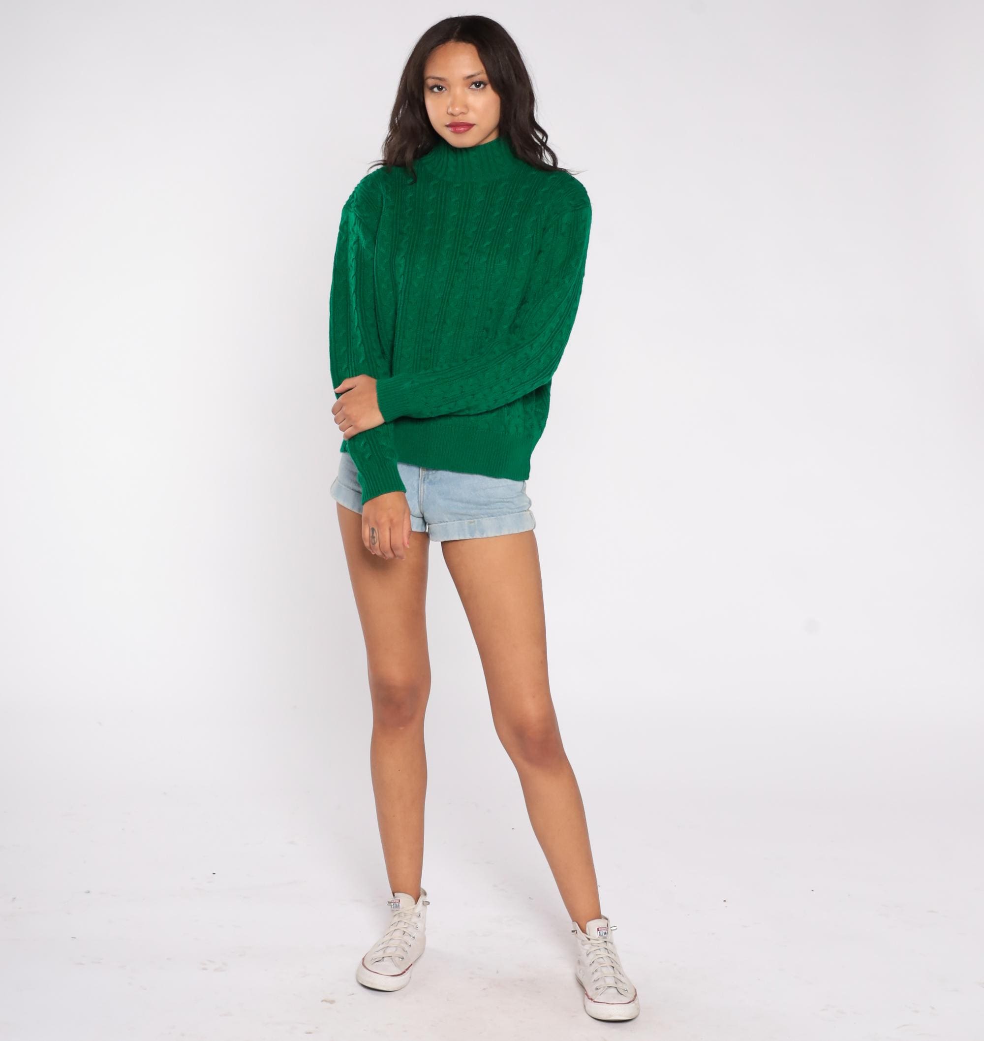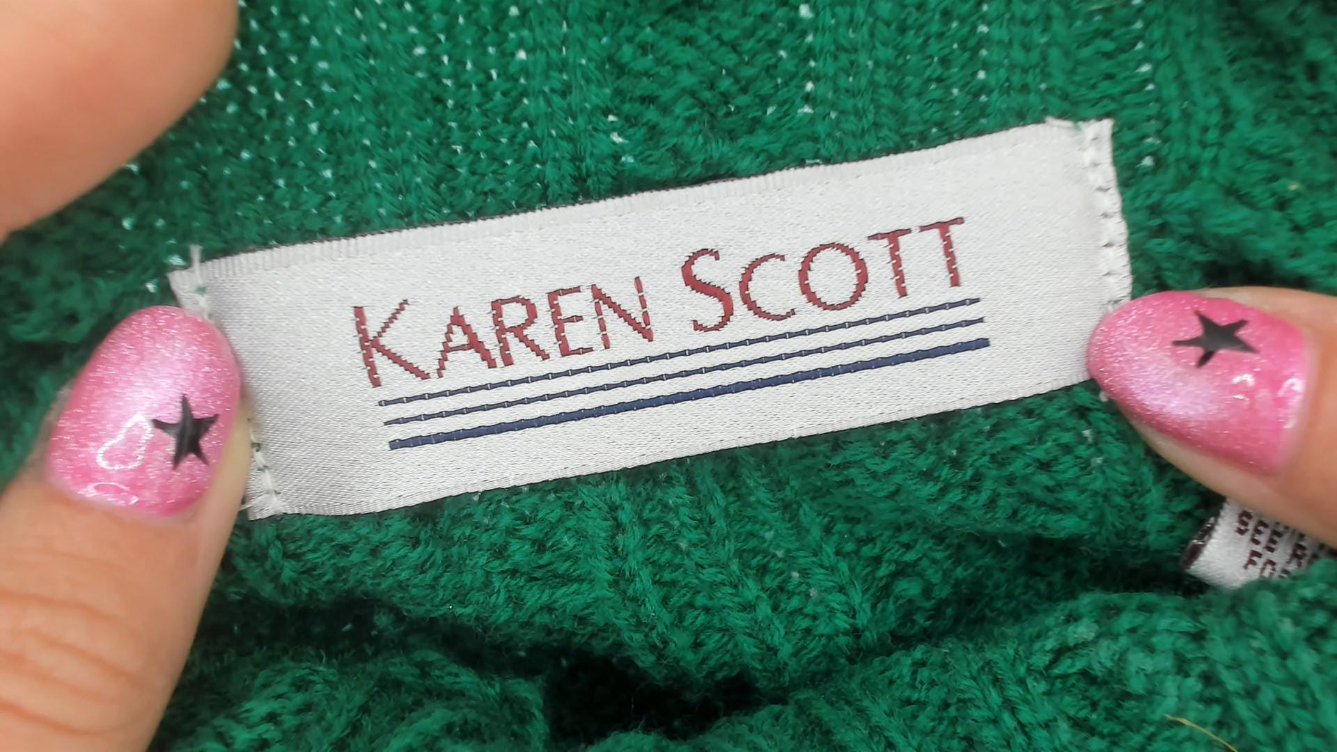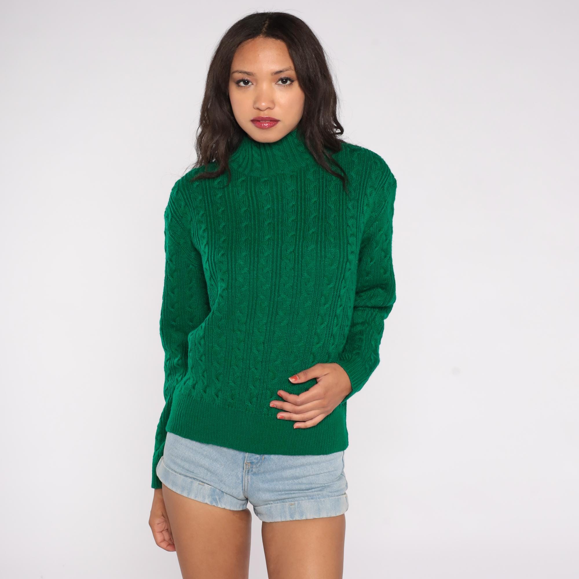 90s green cable knit turtleneck sweater by Karen Scott. Features classic cable knit pattern throughout with mock turtleneck collar and long sleeves.