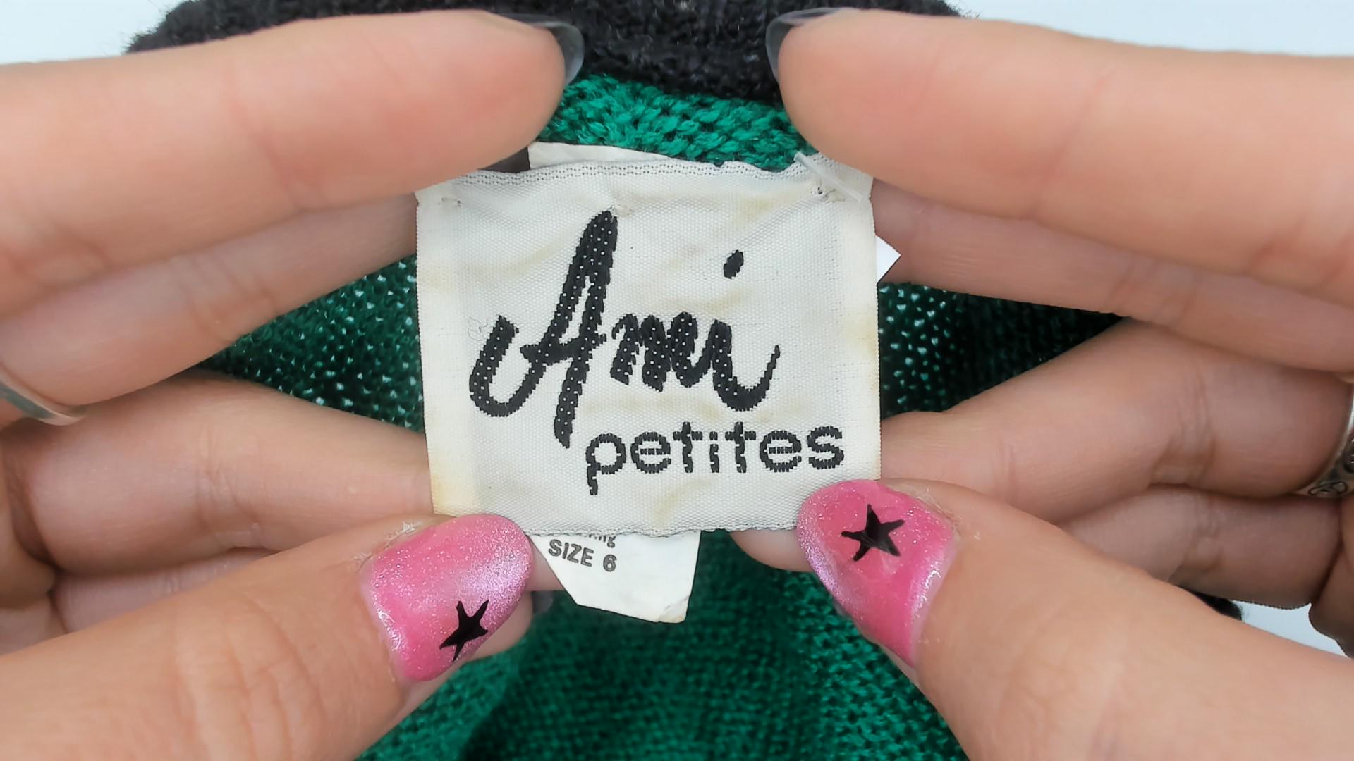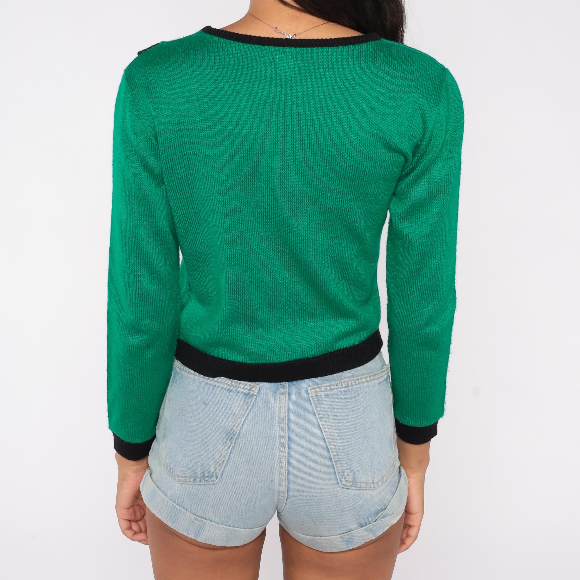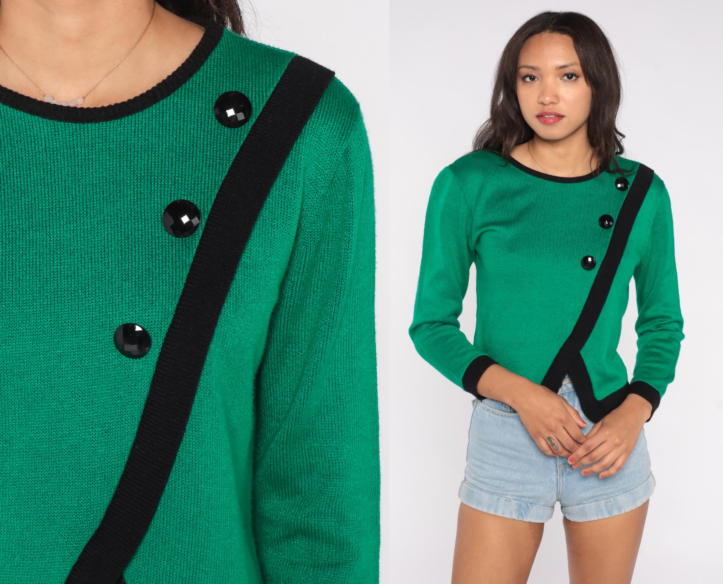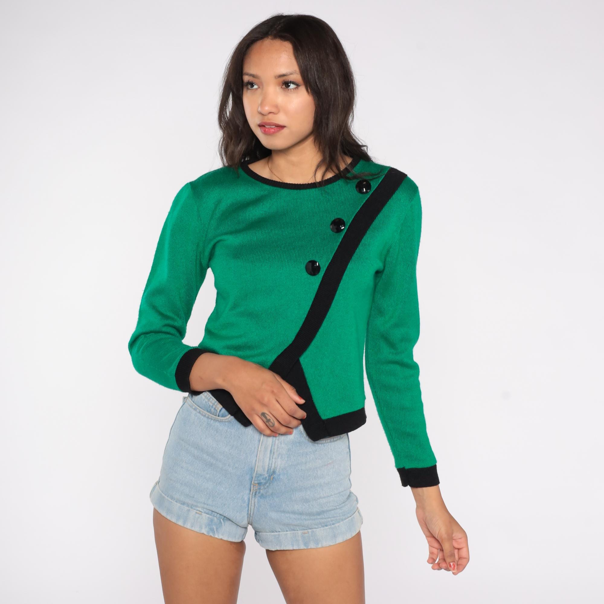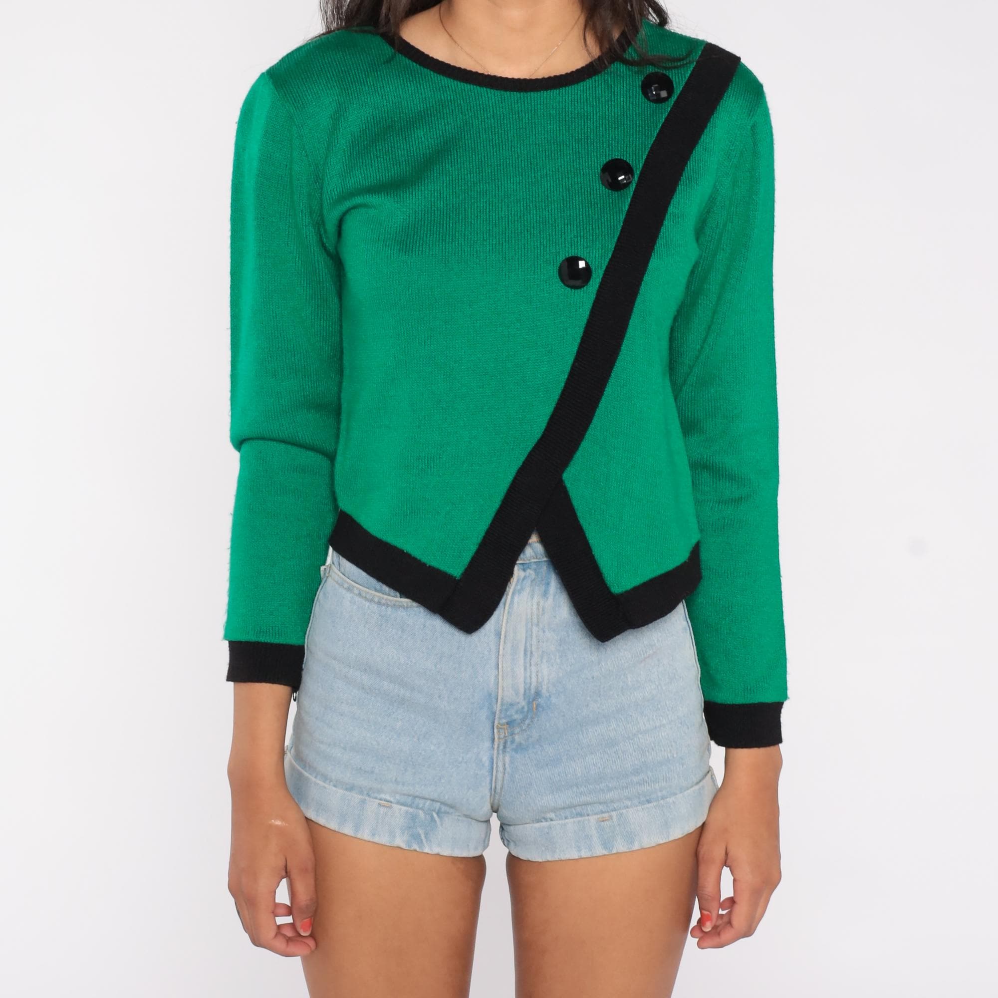 80s asymmetrical cardigan by Ari Petites. Features diagonal button closure with black round buttons, green knit body with black contrast trim at neckline, cuffs, and hem. Cropped length with wrap-style front panel.