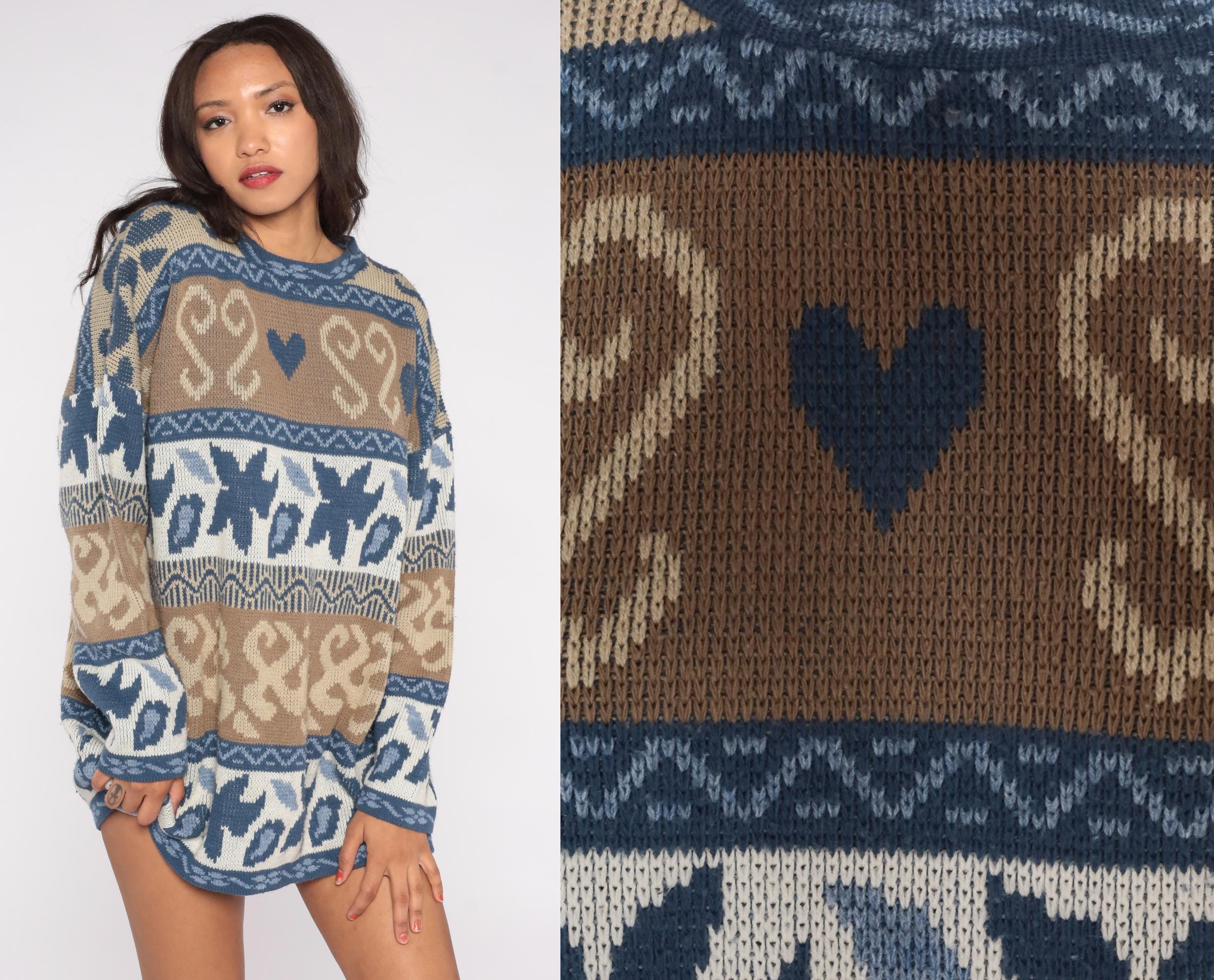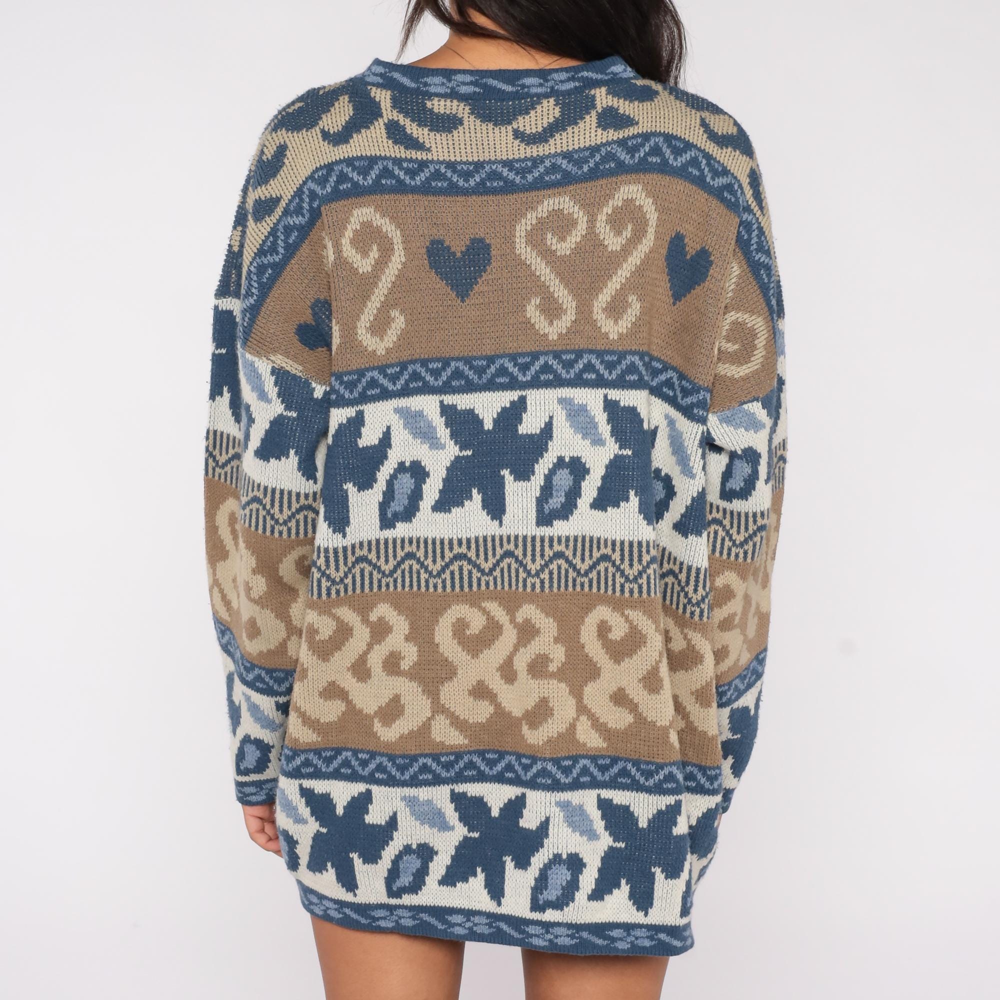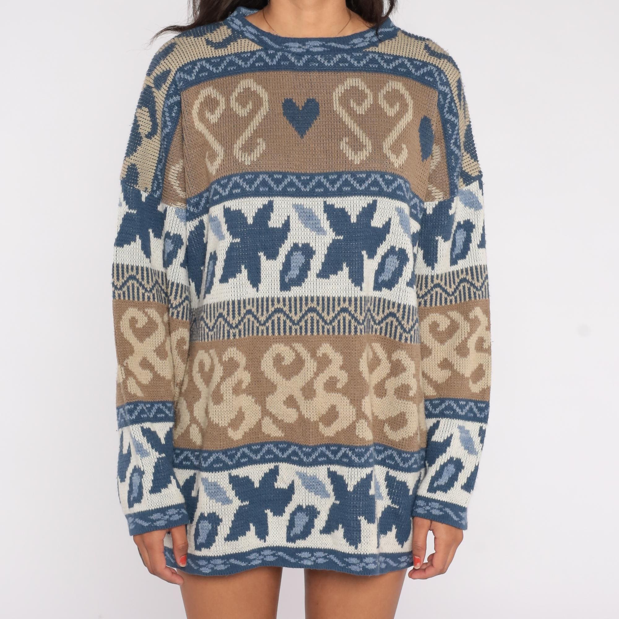 80s Nordic fair isle sweater by Nan Dorsey featuring blue and brown paisley heart pattern with geometric borders. Classic crew neck design with long sleeves and relaxed fit.