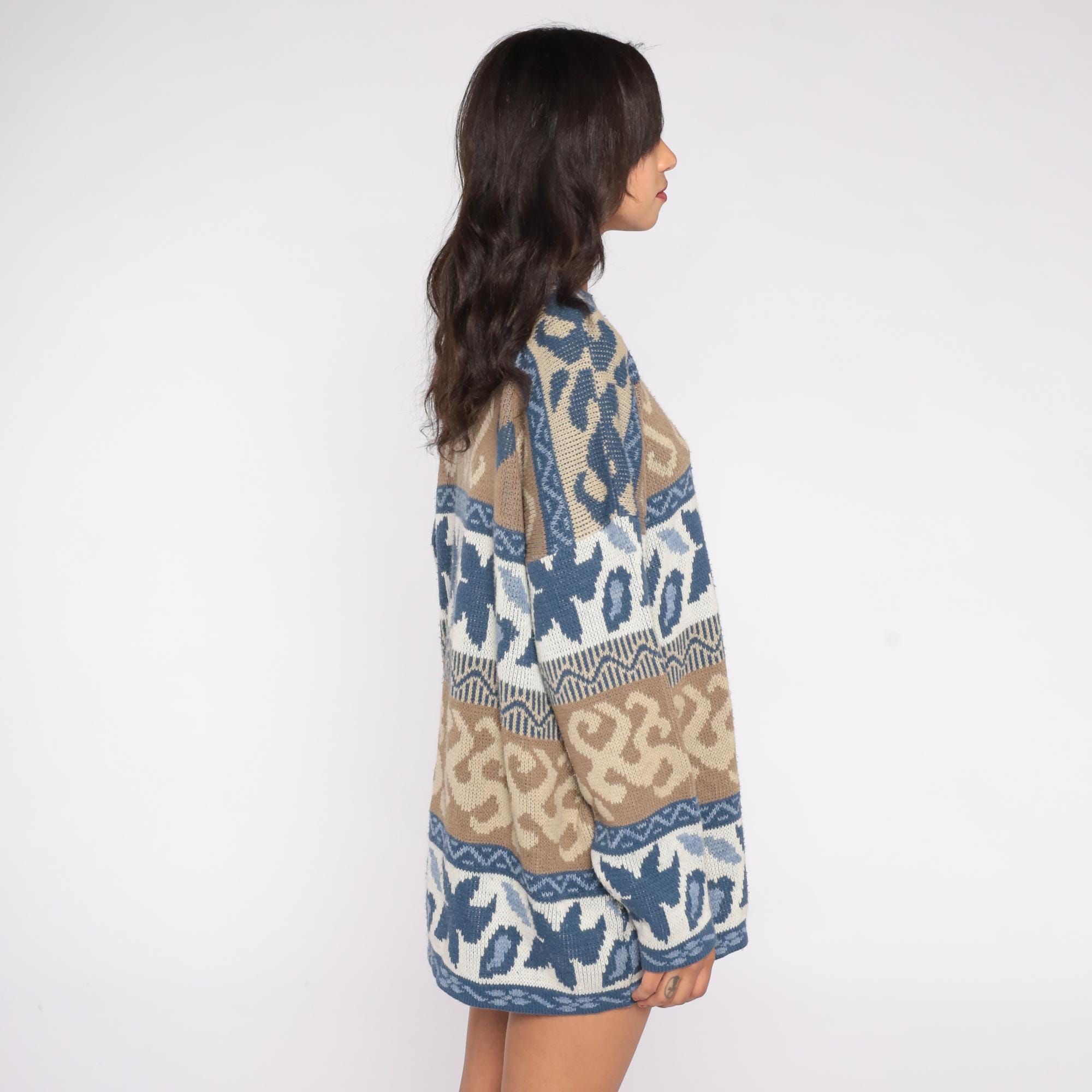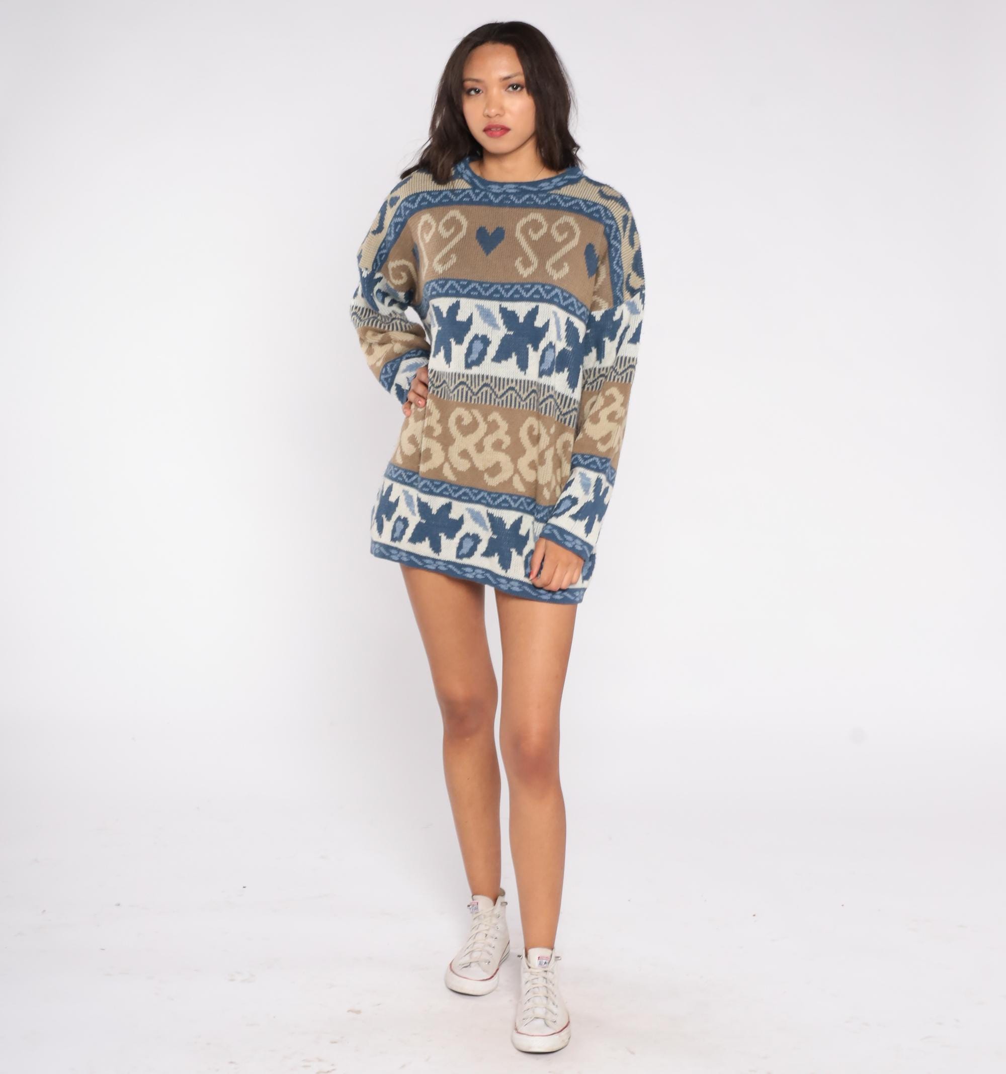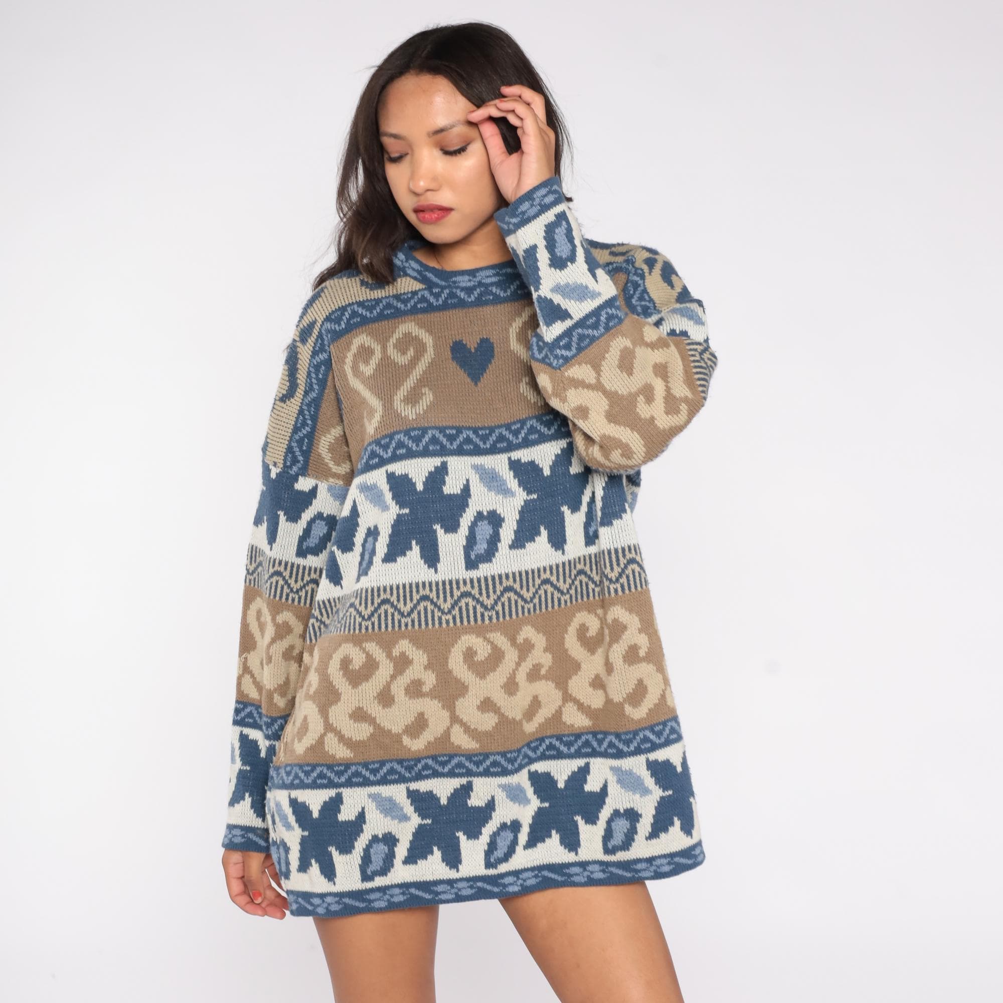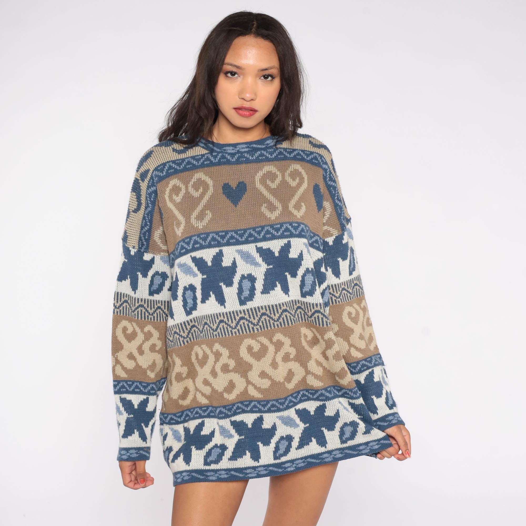 80s Nordic fair isle sweater by Nan Dorsey featuring blue and brown paisley heart pattern with geometric borders. Classic crew neck design with long sleeves and relaxed fit.