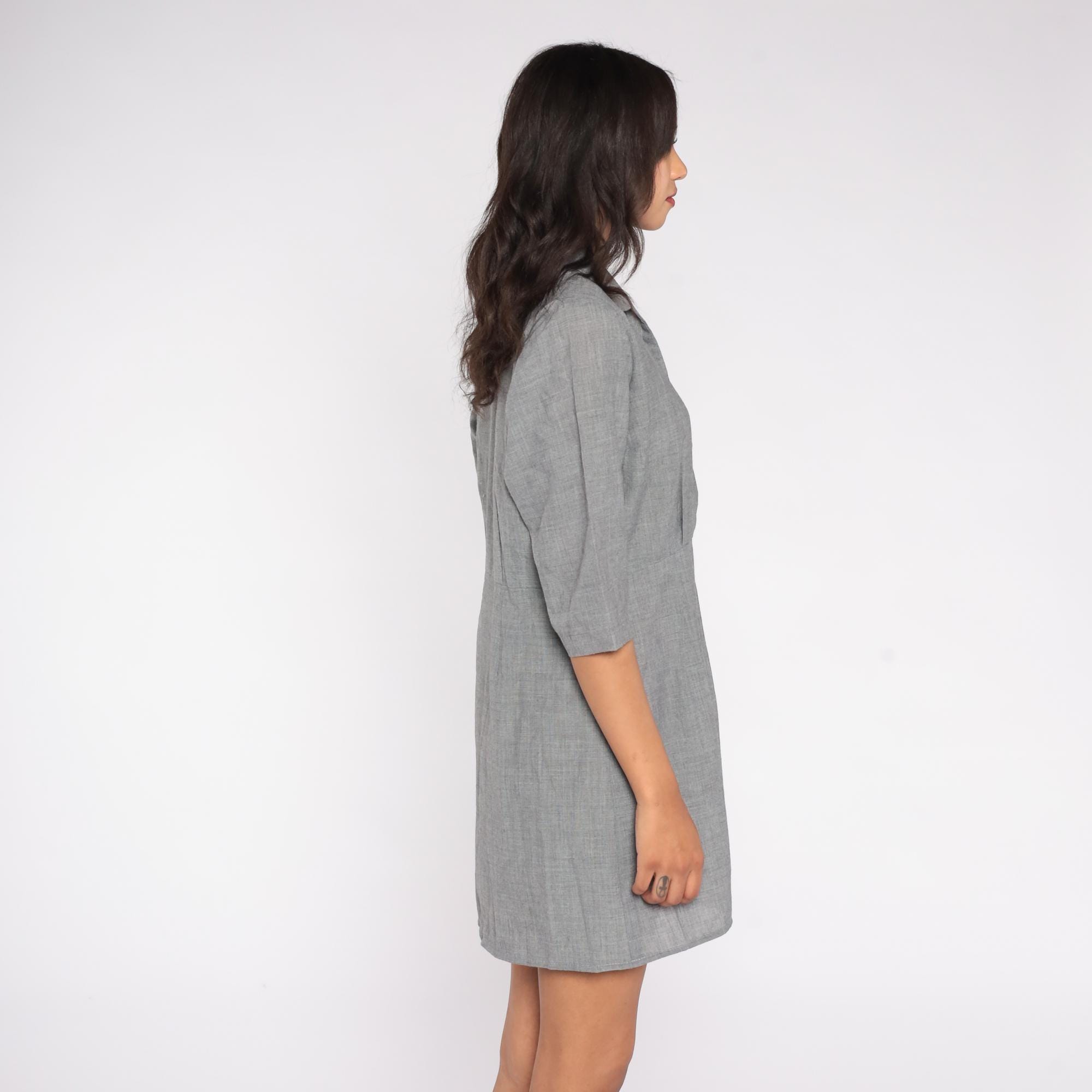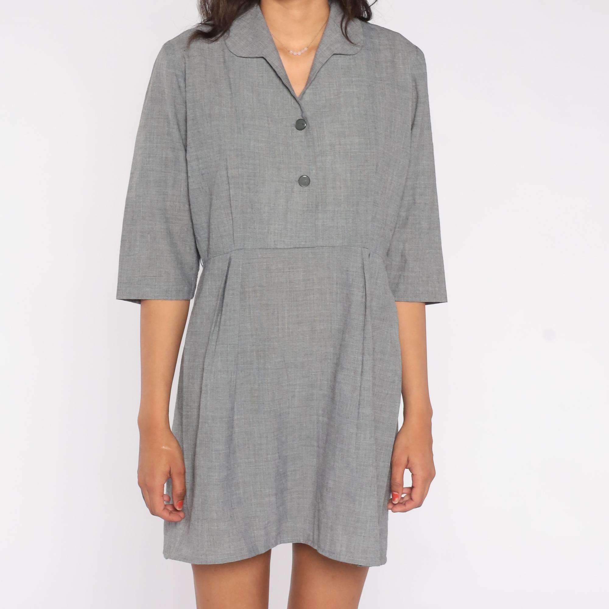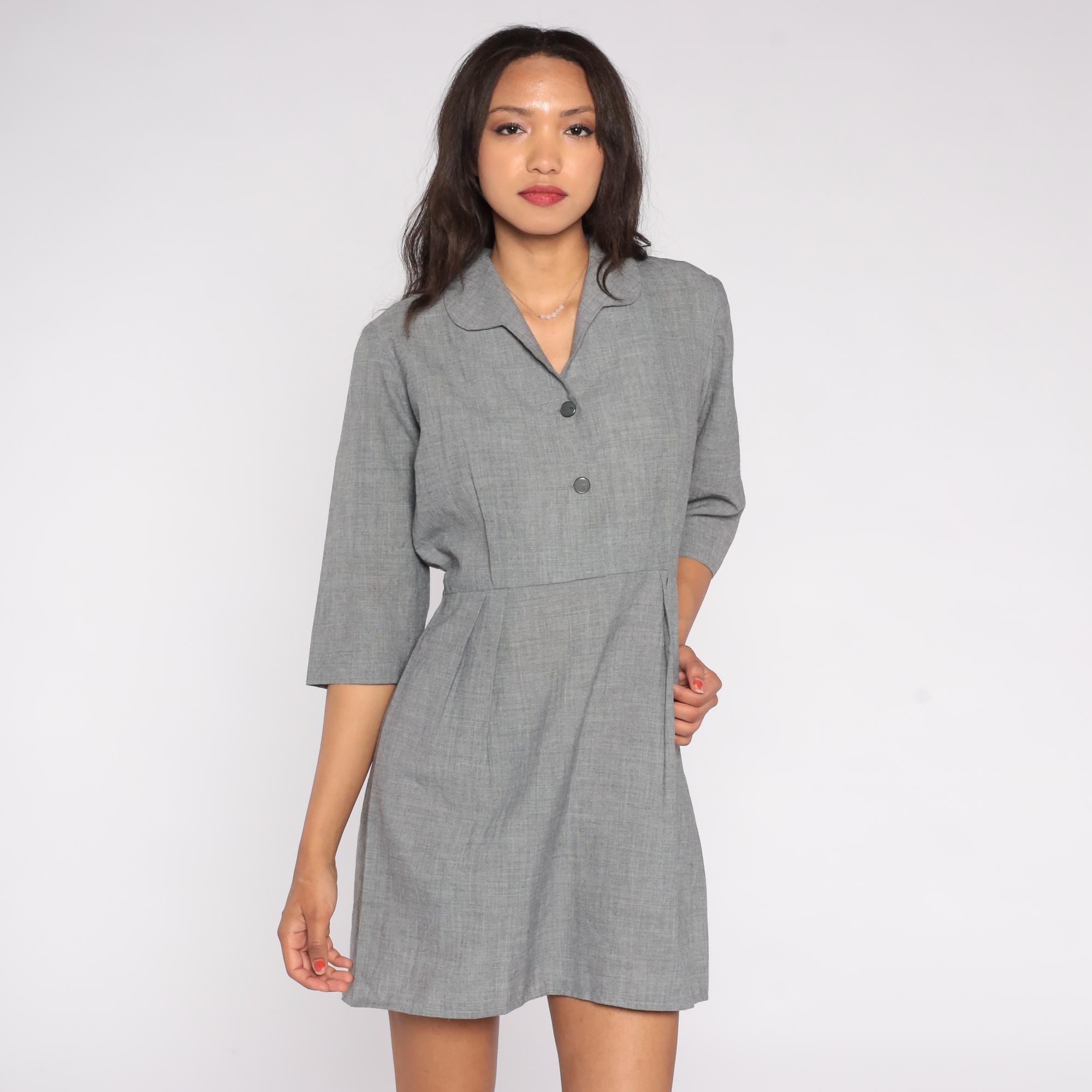 1950s grey shirt dress featuring button-front closure with collar and 3/4 sleeves. Classic A-line silhouette with waist definition and knee-length hemline. Back zip closure.